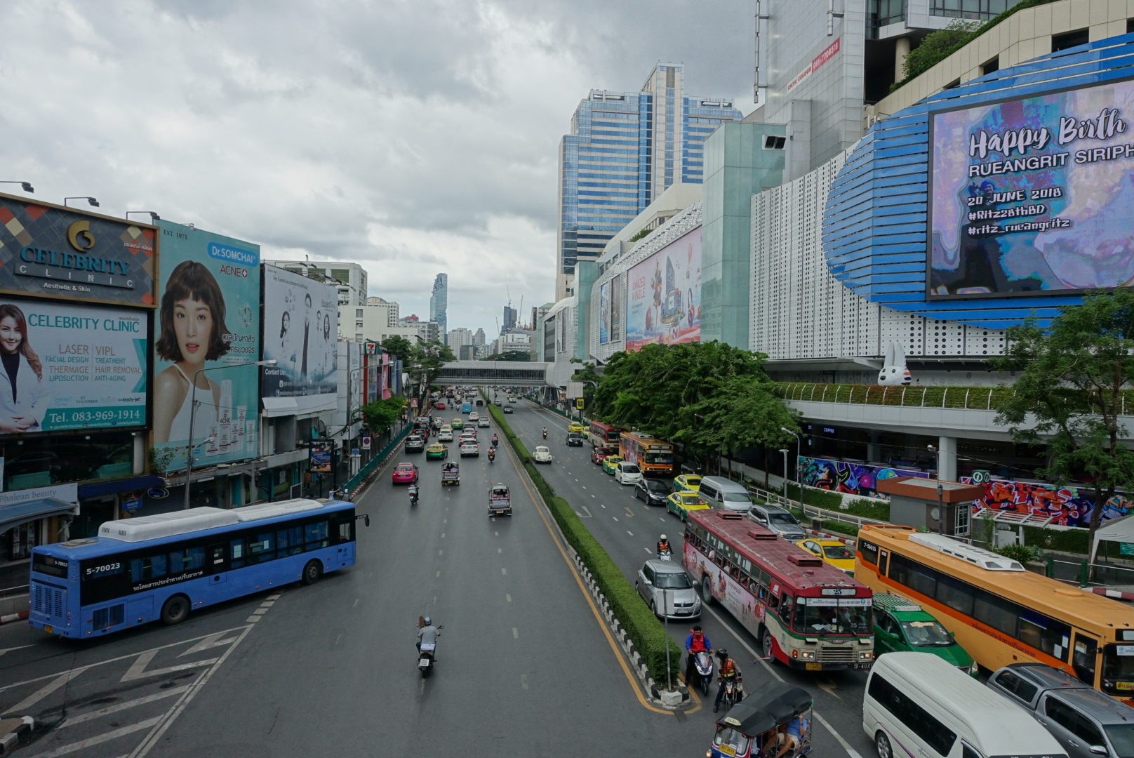 In Bangkok lande ich von Yangon, Myanmar kommend auf dem kleineren Flughafen Don Mueang International Airport (DMK), es dauert eineinhalb Stunden bis ich mein Gepäck habe und durch alle Kontrollen durch bin. Wieder ein 30 Tage Visum für Thailand. In die Innenstadt von Bangkok gelange ich mit dem A1 oder A2 Airport Bus, der kostet nur 30 Baht, also keinen Euro. Der Bus fährt bis Victory Monument, wo ich aussteige und eine Krise bekomme, weil ich an einem riesigen Kreisverkehr stehe, wo das Leben auf mehreren Etagen stattfindet. Auf einer Etage über mir laufen Menschen zum Skytrain. Dort muss ich hin. Ich wuchte meinen Koffer mehrere Treppen hinauf. Die Fahrt bis nach Ratchathewi, wo ich mein Hostel (Travelier Hostel) habe kostet 40 Baht. Dort gibt es zum Glück einen Fahrstuhl.