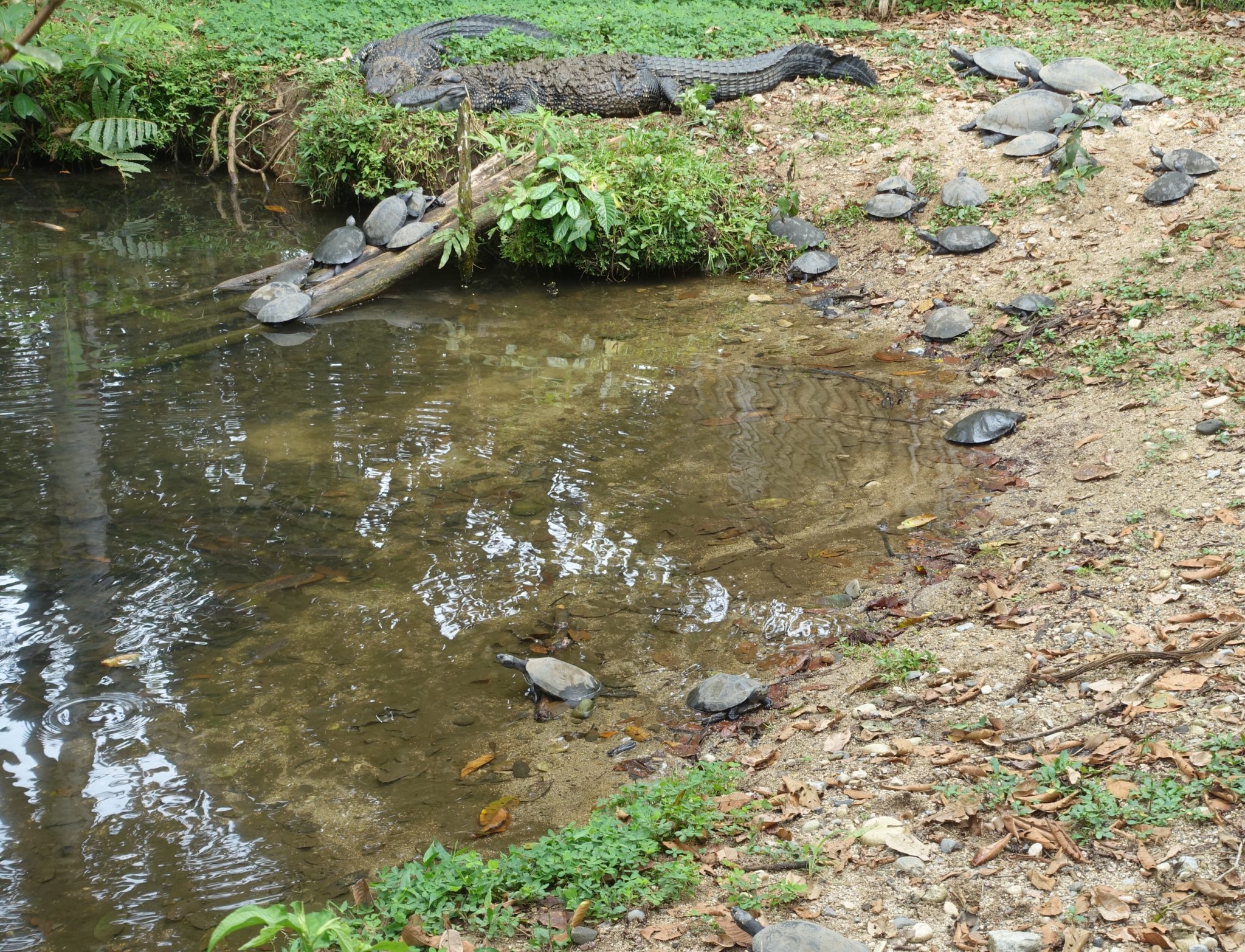 Von Baños ist der Ecuadorianische Dschungel in einer Tagestour zu erreichen. Die Fahrt wird vom Hostal für 30 Dollar angeboten, angeblich 5 Dollar mehr, weil sie in Englisch ist. Wir fahren am nächsten Tag also Richtung Puyo, was eineinhalb Stunden östlich von Baños liegt. Der erste Stopp ist ein Wildlife Sanctuary, also ein Art Hospital für die Dschungeltiere. Wir sehen Affen, Tapire, Krokodile, Schildkröten, Papageie, Geparden, Schweine. Anschliessend fahren wir zum Fluss, wo man uns Gummistiefel gibt, um in ein Kanu einzusteigen. Wir treiben den Fluss im Dschungel entlang, das ist herrlich, fast meditativ. Tiere sehen wir leider keine. In der Dschungellodge angekommen, gibt es ein einfaches, kleines Mittag (Almuerzo) mit Reis, Gemüse, Salat und Suppe. Wir behalten die Gummistiefel an und fahren noch ein Stück zum Start unserer Wanderung. Ich kann es nicht glauben, dass ich gleich 2 Stunden mit Gummistiefeln wandern soll? Aber wir sind im Dschungel und ich lasse mich überzeugen, dass diese Dinger notwendig sind, diesmal mit Socken bitte, sagt der Guide. Also gut, wir waten los, es ist offenbar absolut notwendig die Dinger zu tragen, wir sinken im Morast fast knietief ein, durchqueren Flüsse und kämpfen uns durch den schlammigen Dschungel! Der Guide zeigt uns Spinnen, die zwei Hunde die uns begleiten bellen ab und zu, aber meine Hoffnung weitere Tiere zu sehen, schwindet recht schnell! Nach etwa einer Stunde erreichen wir den Jungle Swing, der Guide schwingt sich furchtlos auf einem Holz durch den Dschungel, fast wie Tarzan! Die Mutigen folgen und bald bin ich auch in den Gipfeln der höchsten Bäume und unter mir mehrere hundert Meter Abgrund, alles grün! Juchzend schaukel ich zwischen den Baumwipfeln hin und her! Auf dem Rückweg haben wir die Möglichkeit unter einem Wasserfall zu schwimmen. Anschliessend fahren wir zu einem Stamm Eingeborener, die warten schon recht touristisch in ihrer Hütte auf uns, bemalen uns mit Farbe und lassen uns mit ihrem Jagdrohr auf eine Holzfigur zielen. Die Rückfahrt geht mit unserem Busrennfahrer Schumacher schneller als gedacht. Trotzdem finden wir an diesem Dienstagabend kaum ein offenes Restaurant gegen 20 Uhr und landen daher in einem ecuadorianischen Laden, wo ich einen fantastischen Fisch für 3.50 Dollar esse.