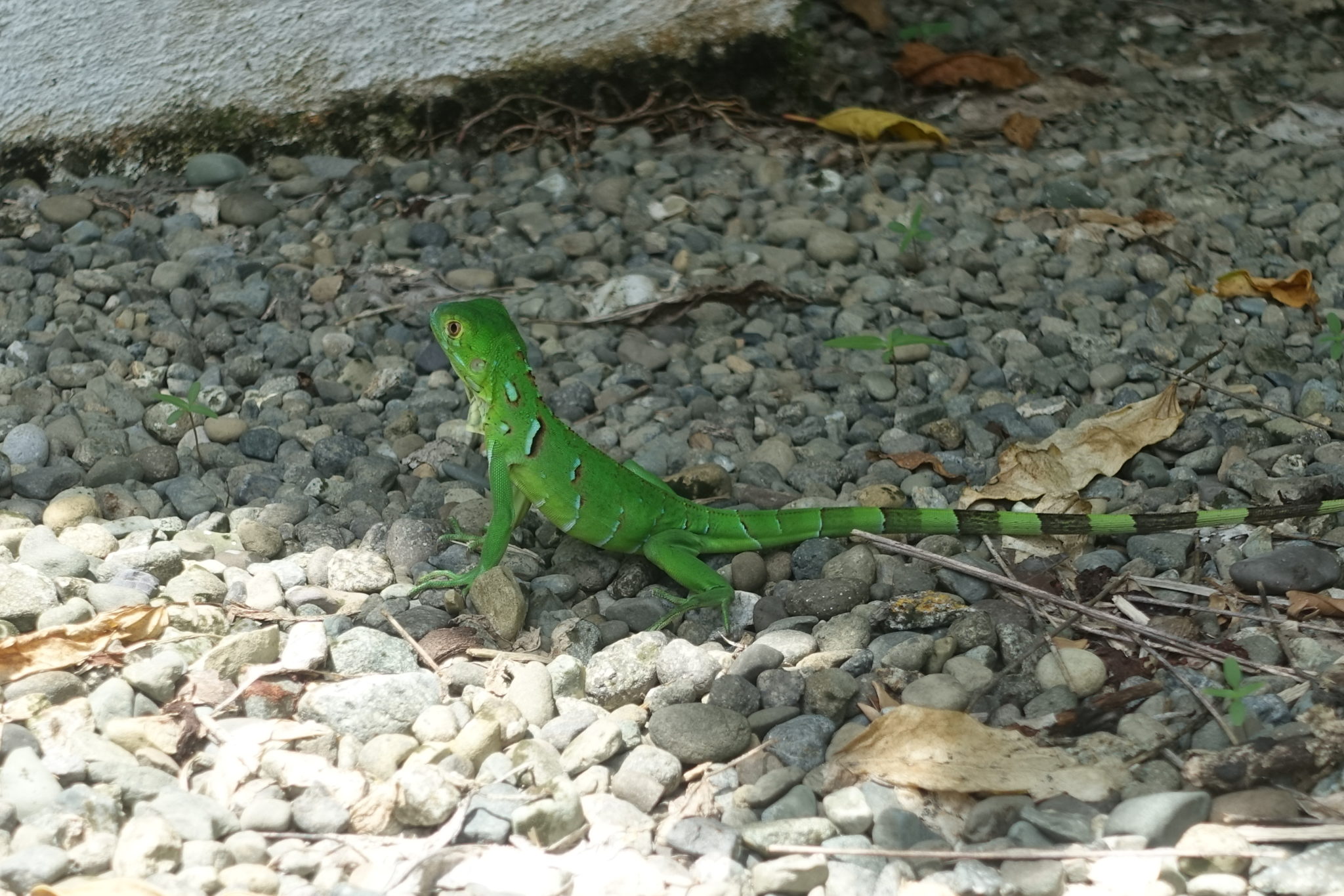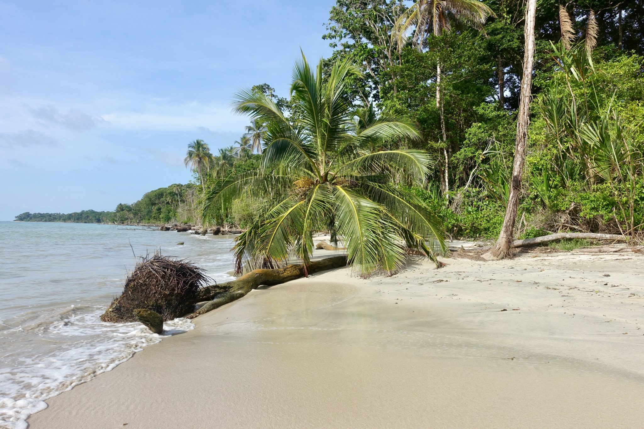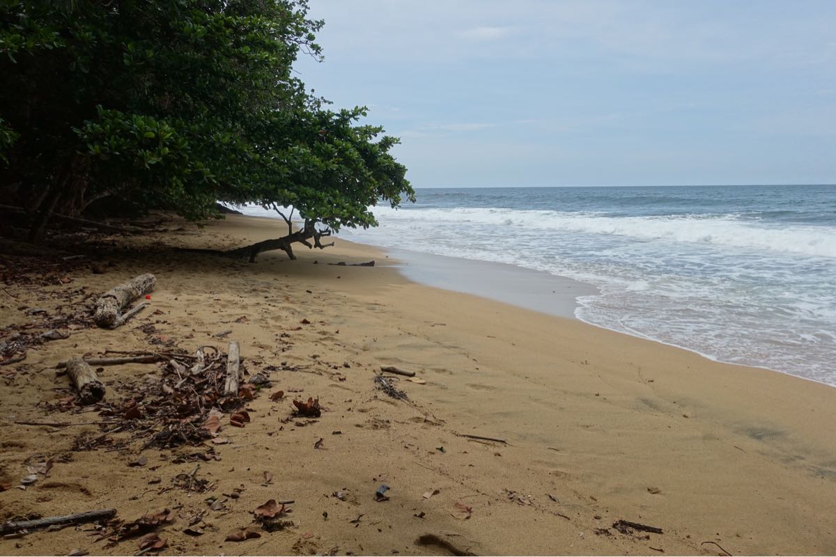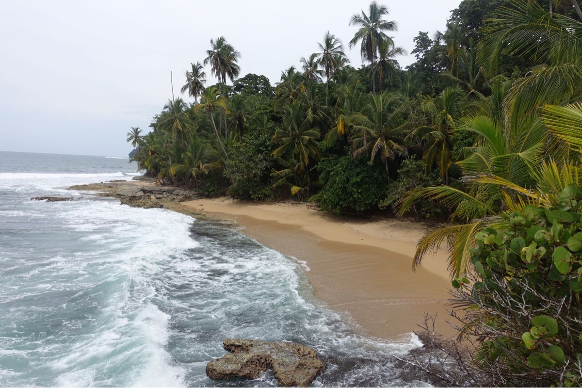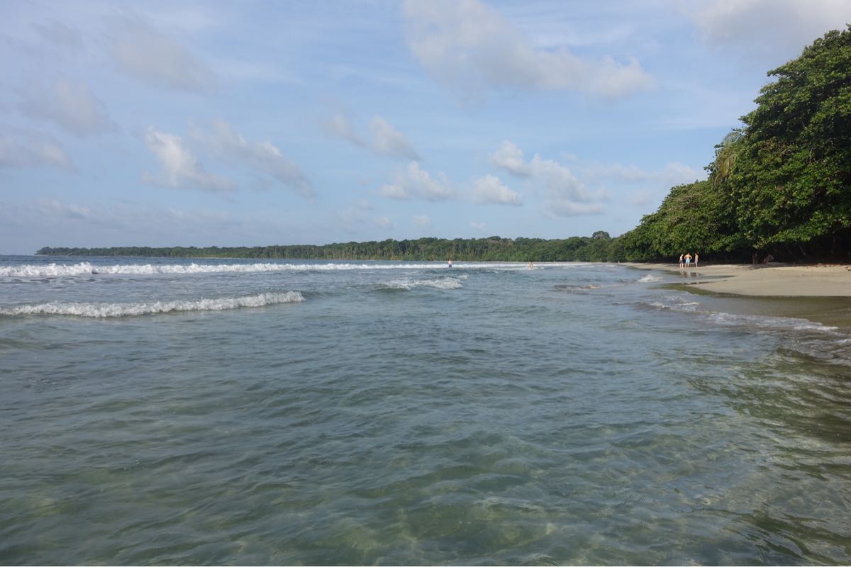 Es ist früh 8 Uhr schon super heiss, die Sonne brennt! Wir wollen heute nach Cahuita in den Nationalpark, doch zuerst zum Frühstück. Am besten ins Dreadnut (das wurde mir empfohlen), zum Glück ist es geöffnet. Ich esse einen super leckeren Obstsalat mit Joghurt und Müsli. Endlich mal was gesundes. Anschliessend gehen wir komplett durchgeschwitzt zurück ins Cocoloco, warten bis die Mittagshitze vorbei ist und fahren 12:30 Uhr mit dem Bus nach Cahuita. Der Ort ist gepflegt, viel kleiner und nicht so touristisch wie Puerto Viejo und wieder sehr leer. Einige Restaurants sind offen und wir essen erstmal in Ruhe Ceviche. Toll dabei das karibische Strassenleben zu beobachten! Ehe wir uns versehen ist es 14:15 Uhr und erfahren, dass der Park nur bis 17 Uhr geöffnet ist, der Parkwächter 15 Uhr von seinem Stützpunkt auf halbem Weg zurück läuft und alle Personen mit zurück zum Eingang nimmt. Am Eingang in Cahuita ist der Eintritt gratis, Donations sind willkommen. Am anderen offizielleren Eingang sind 5 Dollar fällig. Der Park ist nicht gross, aber wohl der meist besuchte in Costa Rica, man muss etwa 5 Stunden für die knapp 10 km einplanen. So viel Zeit haben wir nun leider nicht mehr, aber wir gehen mal los. Und sehen direkt einen grossen, grünen Leguan im Gebüsch! Zufall und Glück, dass ich den entdeckt habe. Dann erspähe ich zwei Affenarten, Kapuzineräffchen und Klammeraffen. Es ist eine ganze Gruppe, die sich oben in den Baumwipfeln von Ast zu Ast schwingen. Kurz darauf entdecke ich einen Waschbären ganz nah am Weg, der lässt sich gar nicht durch uns stören. Überall sind Blattschneiderameisen und wir finden Einsiedlerkrebse mit den verschiedensten Häusern. Ein traumhaft karibischer Strand, aber für Tierbeobachtungen sollte man auf dem Dschungelpfad bleiben. Leider müssen wir die Wanderung noch vor der Hälfte abbrechen und zurück gehen, weil die Zeit knapp wird und wir noch baden gehen wollen. Was für eine Kulisse mit dem Regenwald im Hintergrund, dem Wissen, wie viele Tiere dort leben und dem fast menschenleeren Strand. Die Wellen sind hoch, die Strömungen gefährlich.