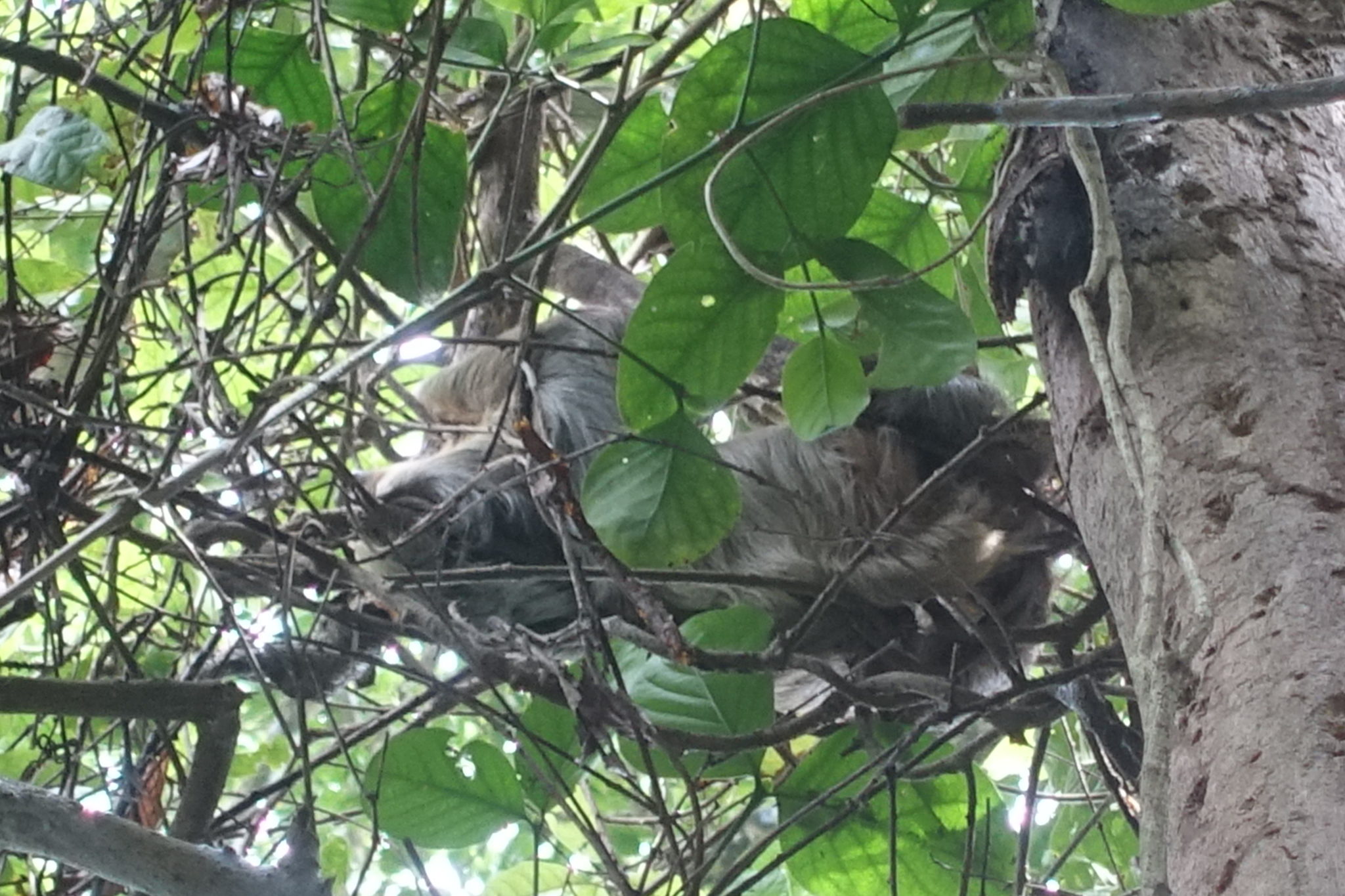 Wir finden endlich richtig gutes Frühstück im Bread & Chocolate, Toast mit Avocado, Spiegelei und Früchten, sowie Eiskaffee für 10 Dollar. Danach leihen wir uns Räder und fahren den Strand entlang Richtung Manzanillo, das so sein soll, wie Puerto Viejo vor 20 Jahren! Das Rad kostet 3000 Colones pro Tag, ca. 5 Dollar. Es ist toll den Fahrtwind in den Haaren zu spüren. Ab Ortsausgang ziehen sich Cafes und Restaurants, Nobellodges und kleinere Hotels fast bis Manzanillo am Strand entlang. Die Strasse nach Manzanillo geht eigentlich nur am Anfang am Strand entlang, später wird es fast langweilig, bis wir zufällig einige Affen auf den Baumwipfeln am Strassenrand spielen sehen. Herrlich sie zu beobachten! Die Strasse wird nach hinten immer weniger befahren, Einheimische grüssen und es gibt kaum noch Touristen. Manzanillo ist ein Dorf, mit einem Supermarkt, wenigen Unterkünften und noch weniger Restaurants. Am Nationalpark angekommen, hatten wir Guides und Eintritt erwartet. Doch nichts! Kein Eintritt, kein Guide, niemand da, nur ein Polizeiauto hält vor der Brücke. Ist das wegen der Low Season? Also schliessen wir die Räder an und gehen in den Dschungel. Der Weg ist nicht so schön gepflegt wie im Cahuita Parque, einige Einheimische wohnen offenbar noch heute im Park. Gleich hinter dem Eingang sehen wir grosse braune Leguane, die mich in ihrem Gang auf den Hinterfüssen eher an Dinosaurier erinnern. Bis zum Mirador keine Tiere weit und breit, bzw. sehen wir sie mit unseren ungeschulten Augen wahrscheinlich einfach nicht. Der Weg führt weiter in den Dschungel, es wird schlammiger und der Dschungel dichter. Immernoch auf der Suche nach Tieren, spreche ich ein Mädel an, die auch nach Faultieren suchend die Bäume scannt. Sie hat bereits einige gesehen, unglaublich, dass wir einfach daran vorbei gelaufen sein sollen?! Wir lassen uns die Faultiere zeigen und sind begeistert vom Fell im Baum. Denn viel mehr ist nicht zu erkennen. Hoch oben im Baum, das ist so perfekt getarnt, hätten wir niemals finden können! Anschliessend gehen wir wieder zurück zum Eingang, denn hier Tiere ohne Führer zu finden, ist quasi aussichtslos. Nicht zu vergleichen mit dem anderen Nationalpark. Viel mehr sehen wir nicht und wir sind relativ schnell wieder draussen.