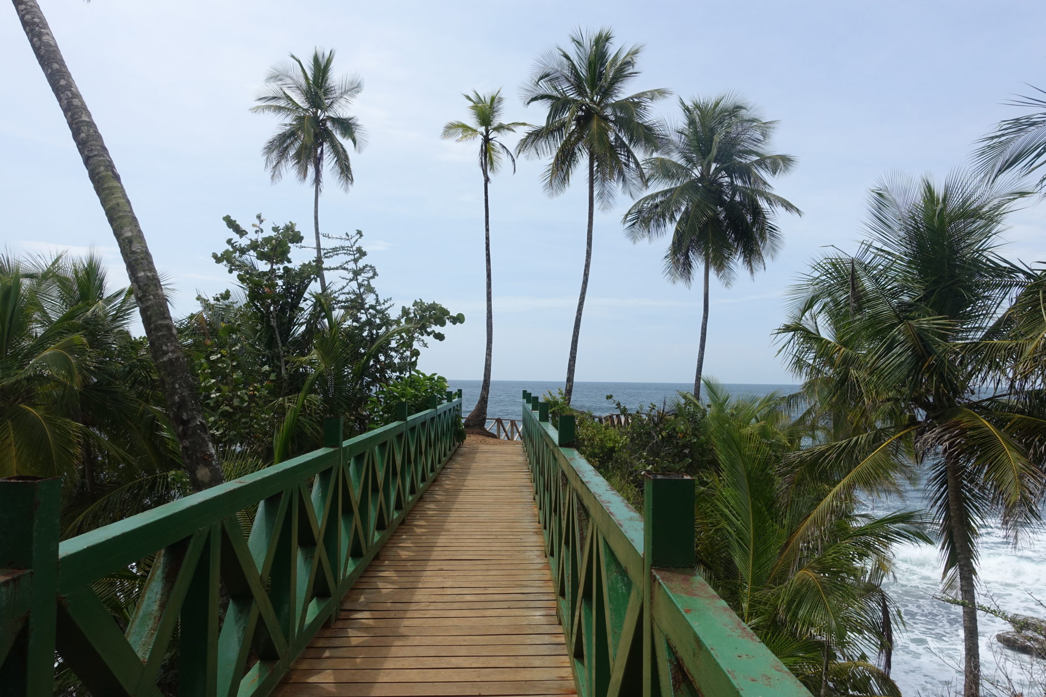7:30 Uhr muss ich für meinen Transfer (20 Dollar) nach Costa Rica am Coconut Hostel sein. Es kommen noch zwei Personen dazu, wir bekommen grüne Bänder die uns als „Coconut Shuttle Transfer Touristen“ identifizieren und laufen zum Bootssteg, gegenüber vom Cafe del Mar. Das Boot legt für seine 20 minütige Fahrt nach Almirante 8:10 Uhr ab. In Almirante findet uns der Fahrer am Bootssteg und setzt uns in seinen Minivan, wir warten hier nochmal ca. 15 Minuten auf was auch immer. Dann fahren wir etwa 1,5 Stunden zur Grenze nach Sixaola. Dort angekommen müssen wir runter laufen Richtung gelbes Migration Schild und einen Stempel für die Ausreise aus Panama holen. Das geht problemlos. Anschliessend wieder hoch und zu den Treppen die rechts zu einem Ticketoffice für 4 Dollar Ausreisegebühr führen. Wir erhalten einen kleinen Schnipsel, den wir bei Einreise in Costa Rica zeigen müssen. Dann laufen wir mit unserem Gepäck über eine lange alte Brücke von Panama nach Costa Rica. Der Busfahrer bleibt in Panama, er begleitet uns nicht. Ich find solche Grenzübertritte zu Fuss immer sehr spektakulär, hier kann kein Auto passieren, es ist eine reine Fussgängerbrücke, die Grenze ist im Fluss. Spannend.