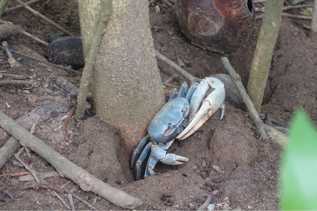 Da wir vorgestern den Cahuita Nationalpark nur so halb gesehen haben, wollen wir heute früh los und die gesamte Strecke schaffen. Wir fahren also nochmal mit dem Bus nach Cahuita und starten diesmal direkt. Wir laufen die uns schon bekannte Strecke und sehen recht schnell Affen, Waschbären und zwei Schlangen zusammen gekringelt auf Blättern direkt neben dem Weg, Faultiere sind in den Baumwipfeln zu erahnen, grosse grüne Leguane tarnen sich perfekt im Dickicht, eine Art Biber schwimmt im Sumpf und läuft dann recht schnell vorbei, ein grauer Reiher steht in der Ferne und am magischen Punkt, mit dem Wachposten erspähe ich noch einen riesigen blauen Morpho-Falter. Die Einsiedlerkrebse werden immer grösser und die Ameisenstrassen mit den Blattschneiderameisen immer dichter. Der Wachposten jedoch teilt uns mit, dass wir bis spätestens 14:30 Uhr hätten passieren sollen und nun 10 Minuten später nicht mehr durch gelassen werden! Das kann doch nicht sein! Wir sind doch diesmal extra rechtzeitig los gegangen, aber weil wir wohl so viele Tiere gesehen haben, hat es nun doch zu lange gedauert. Uns wird der geplante Rundweg verwehrt, wir sind extrem sauer, weil wir ja heute extra dafür nochmal her gefahren sind! Unglaublich! Wir müssen dieselbe Strecke nun wieder zurück laufen. Auf dem Rückweg liegen die Schlangen immernoch seelenruhig eingekringelt auf ihren Blättern.