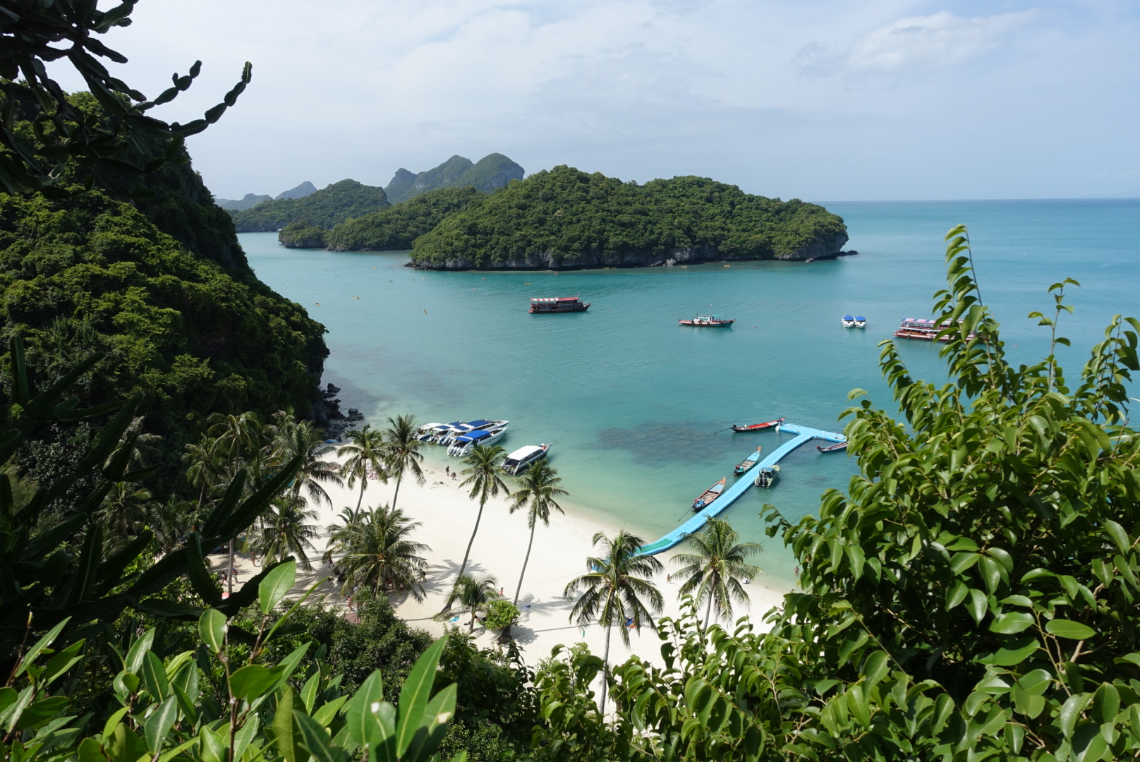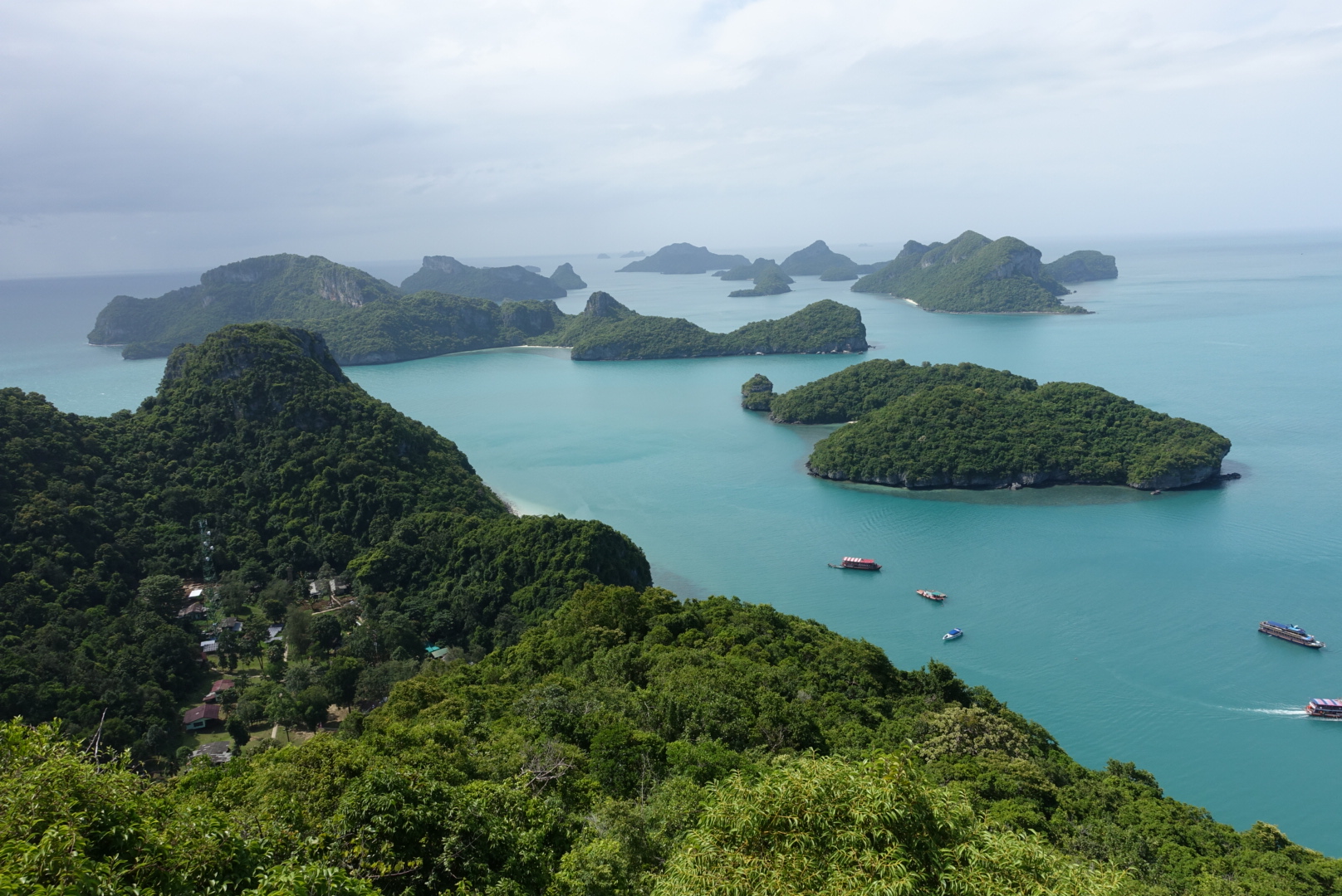 Anschliessend sind wir noch zur Insel Ko Wua Ta Lap für eine kleine Bergbesteigung gefahren. Vom Ang Thong National Park Aussichtspunkt sieht man alle 42 Inseln, die Aussicht ist eines der Highlights der Tour. Allerdings ist die Bergbesteigung bei der Hitze und Luftfeuchte recht anstrengend, es dauert je nach Kondition und Stopps etwa eine halbe Stunde bis zum letzten Aussichtspunkt. Die Stufen nach oben sind gut mit Flipflops begehbar, es lohnt sich auch nur ein Stück des Berges zu erklimmen.