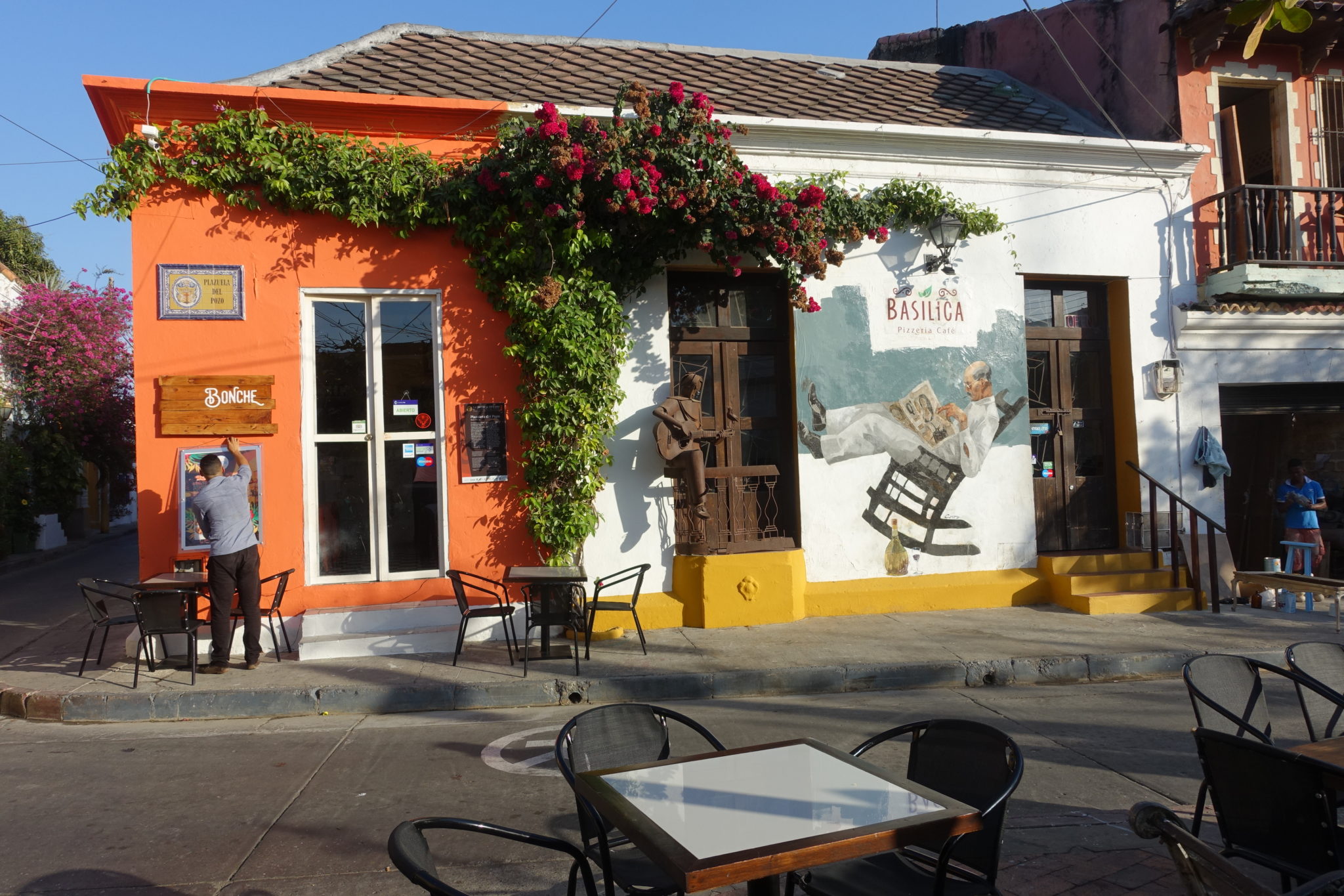 Samstagmorgen bei Tageslicht, ich schaue vom Balkon auf einen Park – Spielplatz – Sportplatz, es ist schön grün und jetzt schon heiss. Ich traue mich aus dem bewachten, eingezäunten Wohngebiet alleine zu Fuss raus! Nach 5 Minuten erreiche ich ein shopping center – juchu Klima! Geldtauschen scheitert in der Bank, dazu muss ich wohl woanders hin, dann eben Automat. Man erhält maximal umgerechnet 35 Euro, das allein zeigt, wie günstig das Land ist! Ich hole mir von meinen ersten kolumbianischen Dollar einen grossen grünen Smoothie für 1.50 Euro. Damit laufe ich bei über 30 Grad zur Altstadt – eine grosse belebte Strasse auf der einen Seite, Polizei, slumähnliche Hütten, Sportplätze, Strassenverkäufer auf der anderen. Innerhalb der Altstadtmauern ist es extrem sicher sagt man, es patrouillieren wohl über 2000 Polizisten täglich hier. Ich lasse mich treiben und bin erstaunt wie leer die engen Strassen sind. Touristisch scheint das nicht allzusehr zu sein. Die kollonialen bunten Häuser sind wunderschön erhalten. Es gibt viele Geschäfte, Restaurants und bunte Strassenverkäufe. Ich komme vorbei an Kirchen und Kathedralen. Mülleimer für meinen inzwischen leeren Smoothiebecher suche ich vergebens. Zum Ausruhen setze ich mich einfach wie die locals auf eine Türschwelle am Gehweg 🙂 alles ist sehr eng. Mittags finde ich das wunderbare Fischrestaurant LaMulata im Stadtteil San Diego, wo auch meine Sprachschule ist. Dieser Stadtteil gehörte früher der Mittelschicht, während sich im Centro eher die Oberschicht niederliess. Neben mir sitzt eine super nette Familie aus Baranquilla, die sind vor dem momentan stattfindenden Carneval geflüchtet und laden mich direkt ein den Abend mit ihnen zu verbringen.