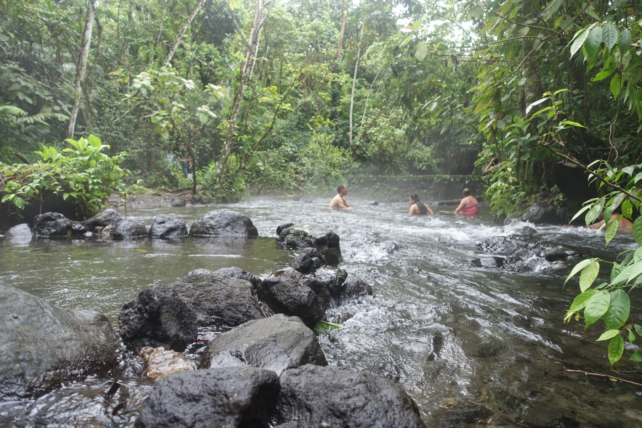 Der Taxifahrer bringt uns lieber zu den natürlichen kostenlosen Hotsprings. Das kostet zwar fast das Doppelte (12 Dollar), aber er hat so recht, denn es ist wunderschön und vor allem komplett natürlich! Wir steigen im Dschungel hinab, gehen durch den warmen Fluss flussaufwärts und finden einige Leute in selbstangelegten Pools sitzen. Es ist noch einer frei, wir sinken in das warme Wasser und geniessen es. Besonders Spass machen die Stromschnellen, wo man eine natürliche Rückenmassage erhält, wie ein Whirlpool, genial! So viel besser, als all die teuren künstlichen Alternativen!