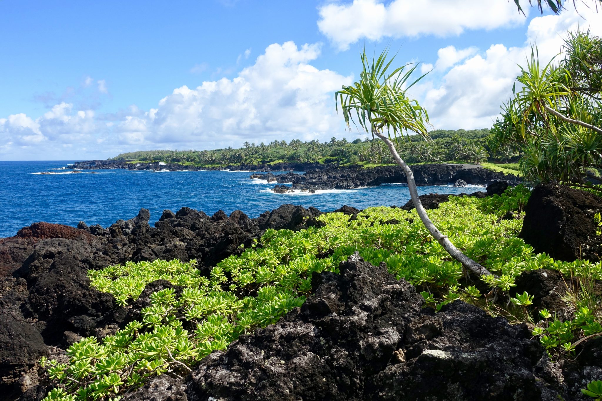 Den tropischen Garten besuchen wir aufgrund des horrenden Eintrittspreises von 25 Dollar pro Person nicht. Dafür halten wir ausführlich am „black sand beach“, springen in die hohen Wellen und wandern die Lavabucht entlang. Anschliessend erkunden wir noch den „red sand beach“, die kleine Wanderung zu diesem Strand ist etwas anspruchsvoller an der Steilküste entlang und nicht wirklich ausgeschildert. (Mit maps.me aber sehr gut zu finden.) Hier gehe ich schnorcheln, sehe viele recht grosse Fische und kämpfe gegen die starke Strömung in der Bucht.