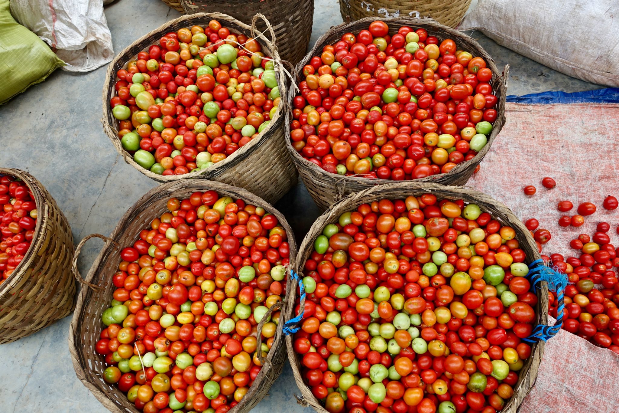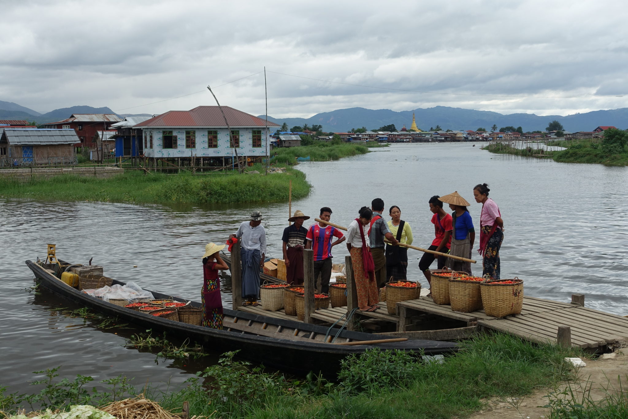 Anschliessend stärken wir uns bei einer Familie, es gibt Nudelsuppe mit Garnelen und Gemüse, alles steht in kleinen Schälchen auf dem Tisch. Die Gastfreundschaft ist grossartig. Nach einer gemütlichen Mittagspause fahren wir weiter über den See zu einem Tempel, den wir erklimmen können und dem lokalen Markt, der offenbar jeden Tag an einem anderen Ort stattfindet. Die schwimmenden Gärten mit tausenden von Tomaten sehen wir auf dem Rückweg im strömenden Regen. Jeder hält seinen eigenen grossen Regenschirm, der zur Ausstattung des Bootes dazu gehört, jedoch tropft es vom Vordermann so sehr hinab, dass wir alle komplett nass ankommen.