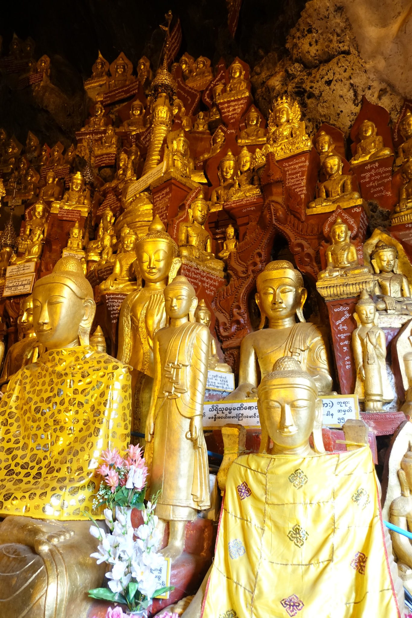Nach zweieinhalb Stunden kam wir an, mussten natürlich wieder unsere Schuhe am Eingang, weit vor der Höhle abgeben und liefen barfuss zur Höhle. In der Höhle war es schön kühl, irgendwann wurden meine Füsse jedoch nass und kalt. Aber egal, die vielen goldenen Buddhas lenkten mich ab, es ist ein ganz besonderer Ort. Unbeschreiblich, ich fing an indische Lieder, die ich in meiner Yogalehrerausbildung in Indien gelernt hatte, zu summen. Und tatsächlich einige Buddhas hatten Bezeichnungen in Sanskrit, die mir was sagten. Wir klebten noch Plattgold an den grossen Buddha am Eingang. Hier durften wir das plötzlich auch als Frauen…