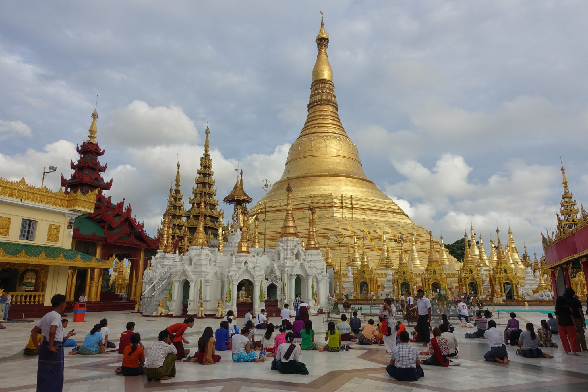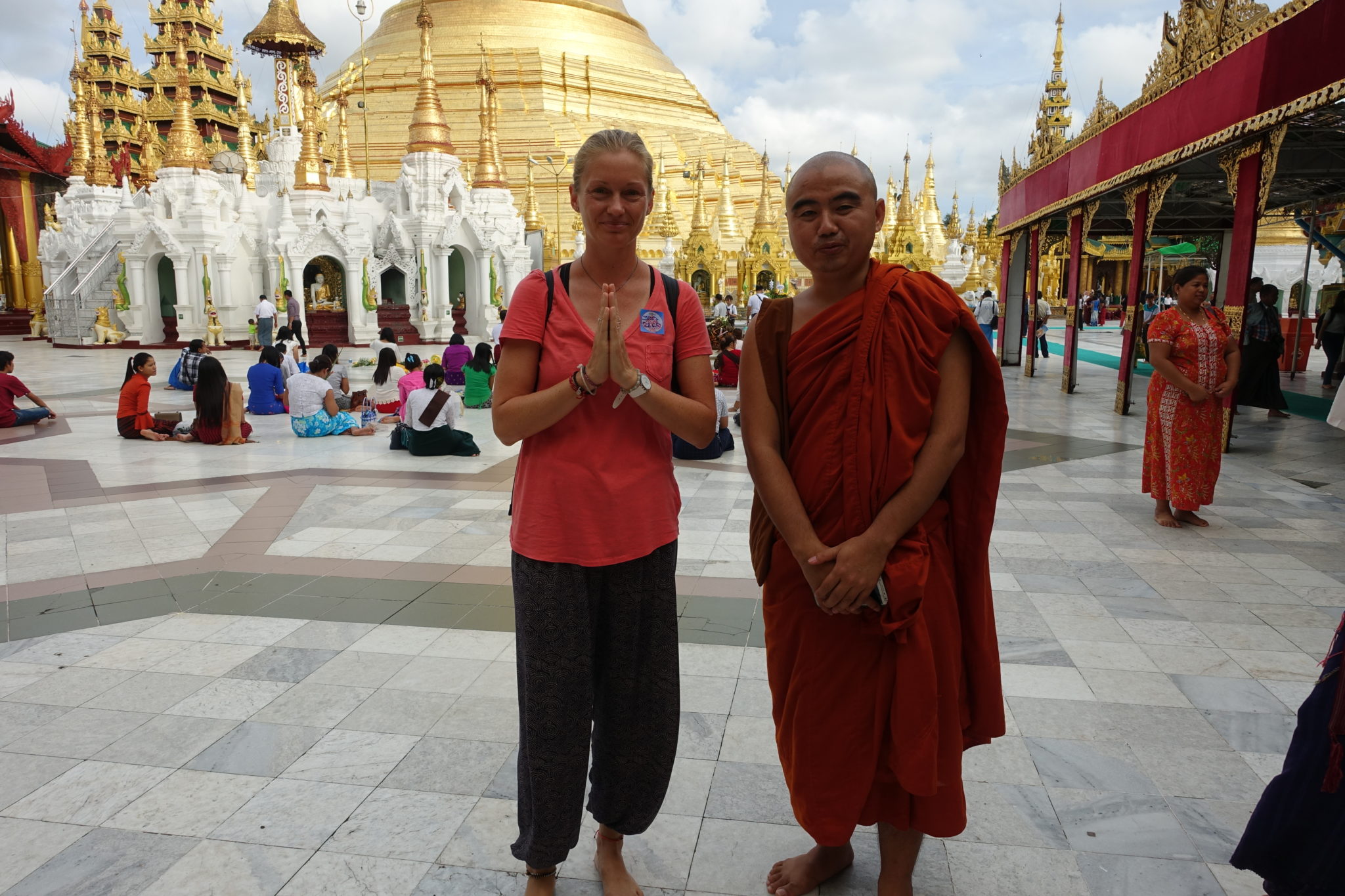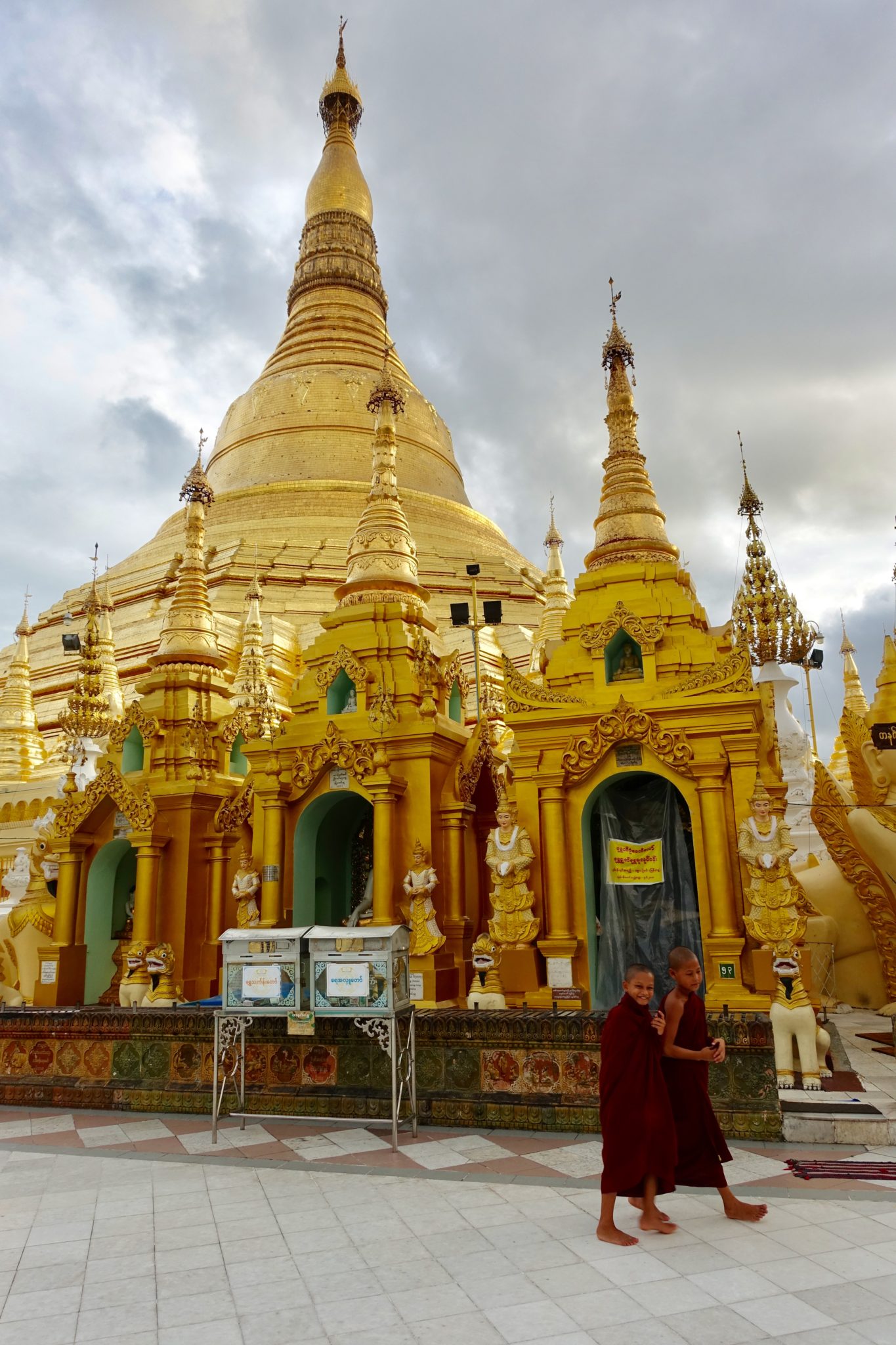 Die Pagode ist riesig, unvorstellbar, man sieht sie schon bei der Anfahrt mit dem Taxi von weitem. Ich zahle 10000 Kyat Eintritt, gebe meine Schuhe gegen eine Nummer am Eingang ab, erhalte eine gratis Flasche Wasser und laufe wiedermal barfuss los. Für Einheimische ist der Eintritt gratis, sie kommen zum beten, ich zum fotografieren. Es dauert nicht lange, bis mich ein Guide zutextet, er spricht gut deutsch und muss herhalten einige Fotos von mir zu machen. Dann wimmel ich ihn ab.
