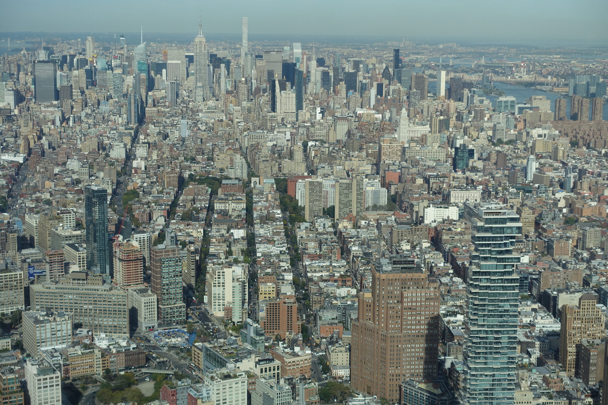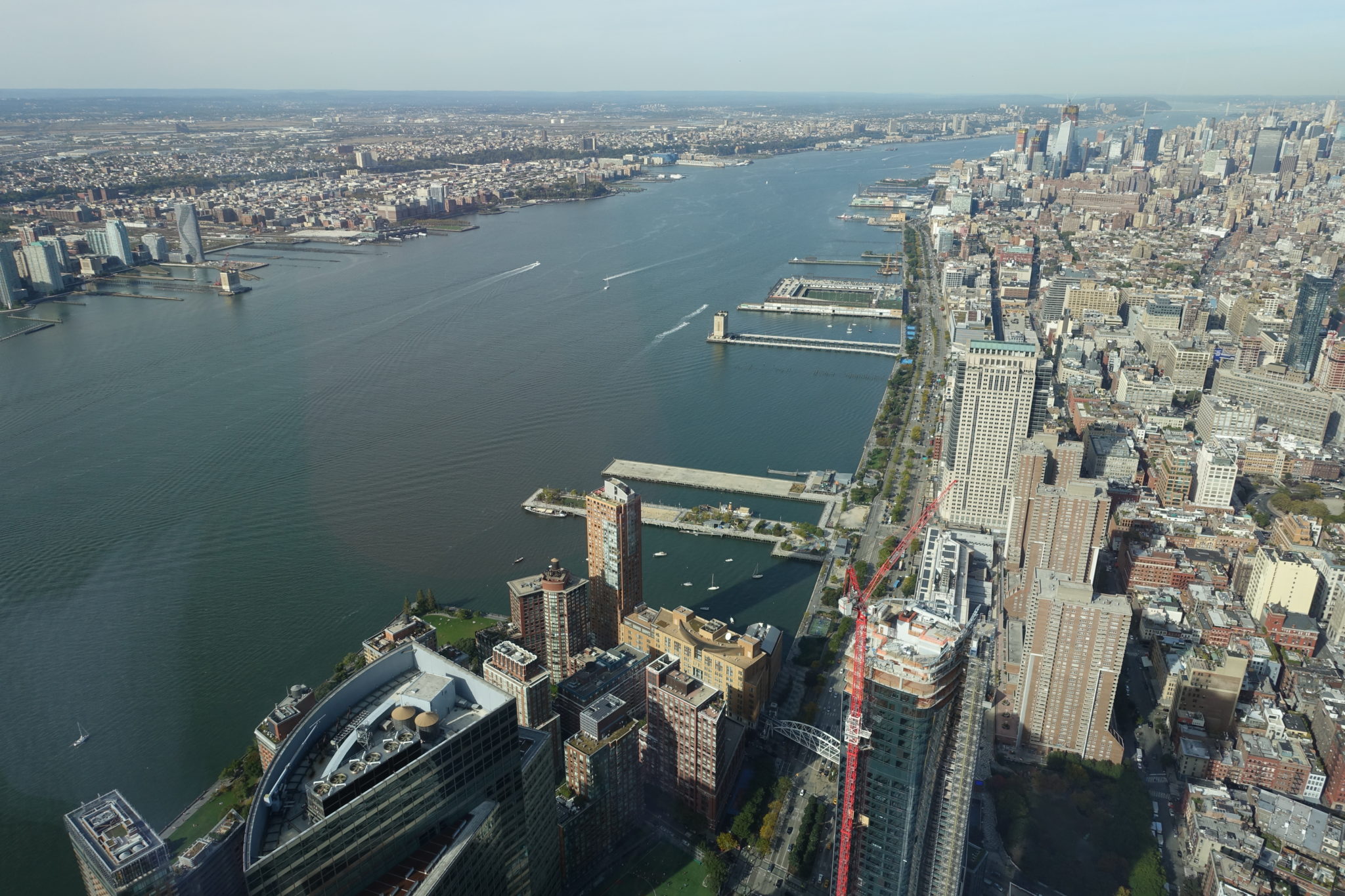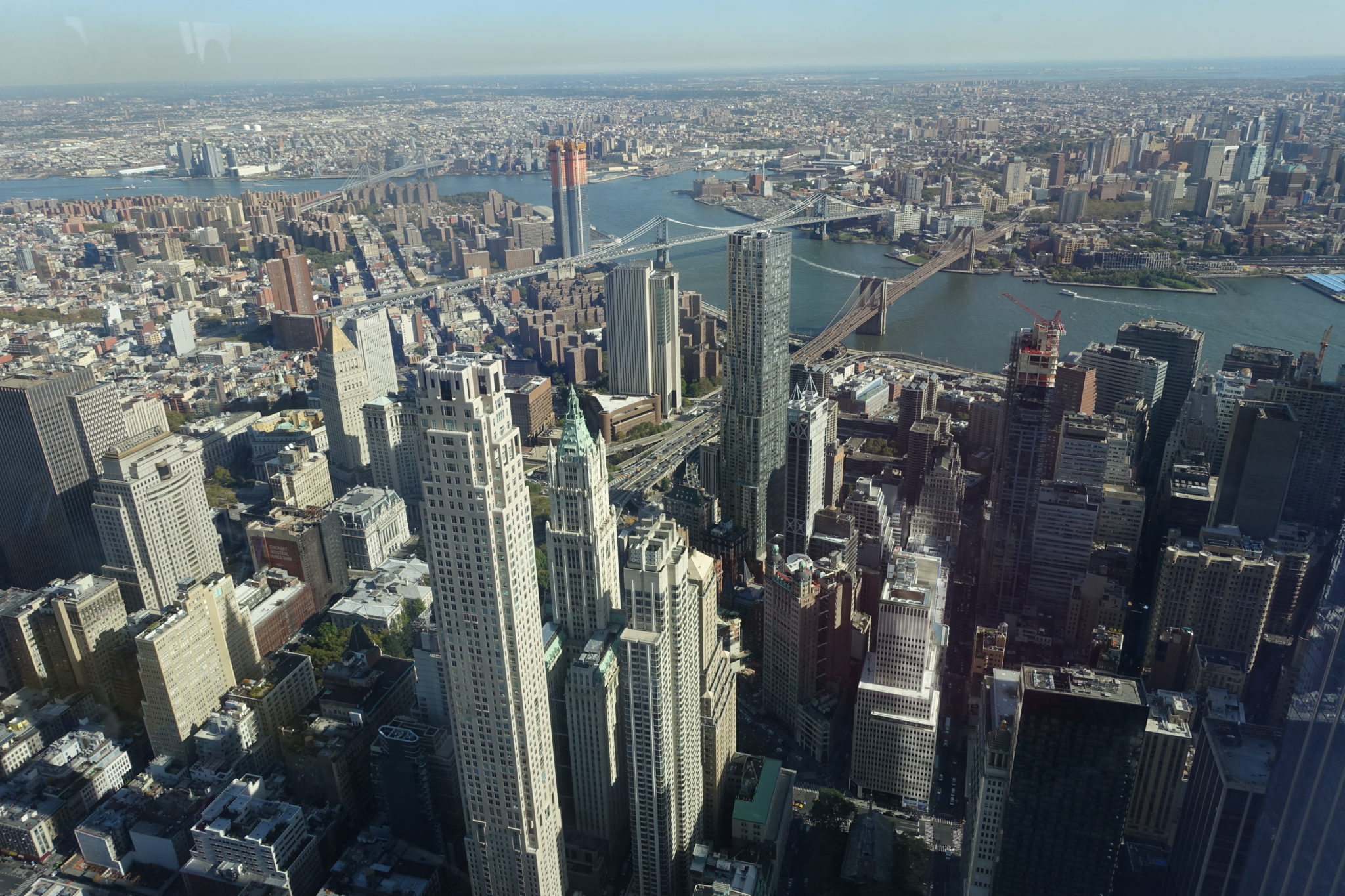 Dort gibts ein neues sehenswertes Gebäude namens Oculus, mit Läden und zum Glück WCs auf allen Etagen! Raoul, den ich nun endlich treffe, begrüsst mich, als hätten wir uns erst gestern gesehen. Er erzählt mir, wie er 9/11 hautnah erlebt hat. Er ist nach dem Crash der Flugzeuge direkt von der Wallstreet, wo er arbeitet, hoch zur Fähre nach New Jersey gerannt. Er konnte zu der Zeit natürlich nicht verstehen was passiert war, er hat einfach seine Beine in die Hand genommen und ist gerannt, weil ihm klar war, dass er dringend weg muss aus Manhatten. Eine sehr beeindruckende Zeitzeugengeschichte. Er zeigt mir noch Mister Doublecheck, den sie ein paar Meter versetzt haben und an dem einige Spuren von 9/11 zu sehen sind. Anschliessend gehen wir zum Freedom Tower, dem neu erbauten Turm in Gedenken an 9/11. Der Eintritt zur Aussichtsplattform kostet 37 Dollar. Wenn man online kauft, braucht man sich nicht anzustellen, aber das gelingt auf die Schnelle niemanden, es ist schneller wir stellen uns 15 Minuten an. Die Security Kontrolle erinnert an die auf dem Flughafen, wir fahren in 47 Sekunden in den 102. Stock und erhalten erstmal eine kurze Präsentation von New Yorks Geschichte, dann noch eine Werbung für das iPad mit den Sehenswürdigkeiten und dann endlich dürfen wir HINAB steigen zum Rundgang über New York, man schaut zwar durch eine Glasscheibe, aber der Blick ist überaus beeindruckend.