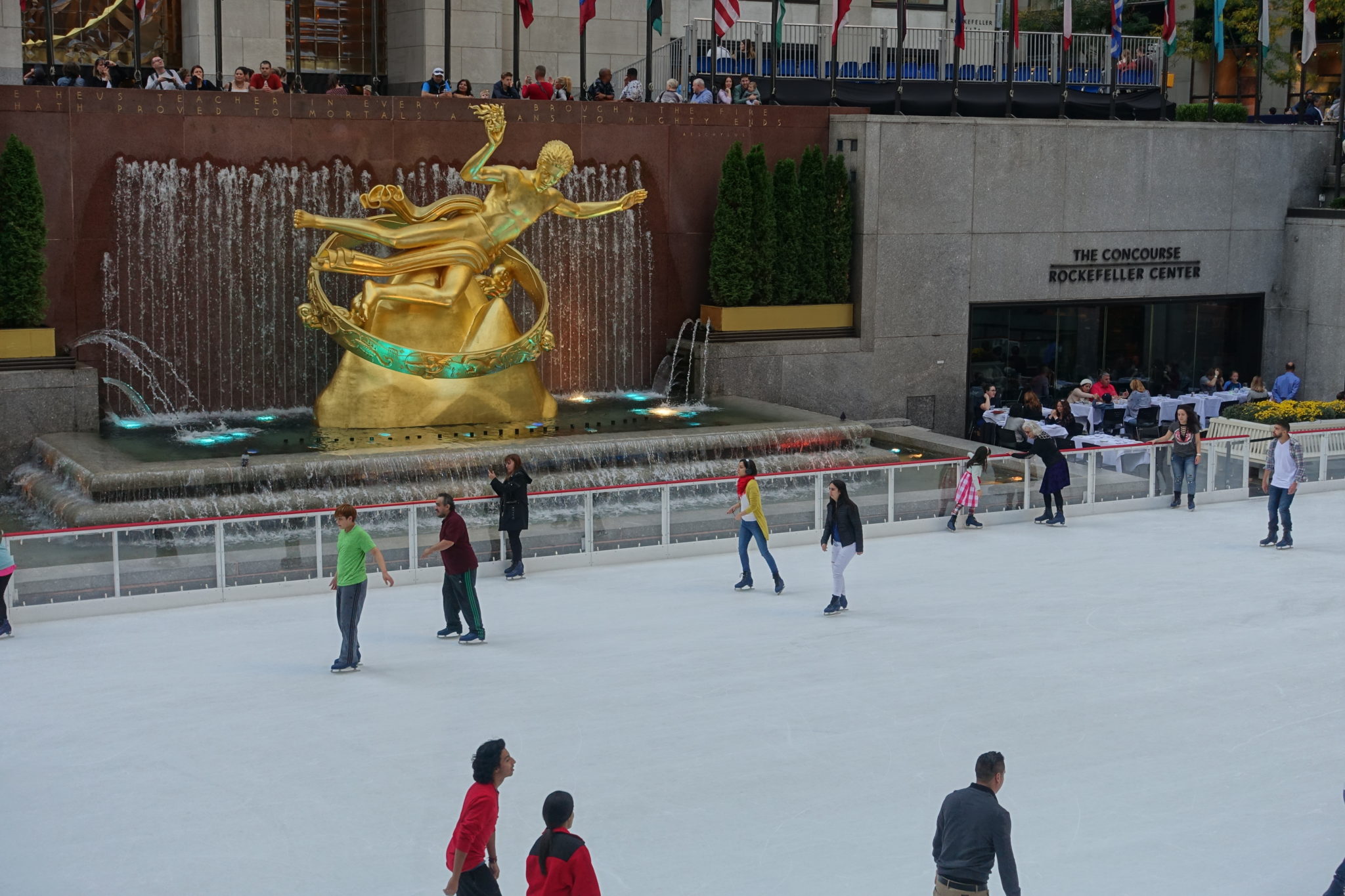 Die Hester Street Fare hatte ich mir noch aus einem Blog rausgesucht, dieser kleine Markt enttäuscht mich aber total. Es wird zwar ziemlich coole Livemusik gespielt, sonst gibt es aber nur einige kleine Stände, ich komme mir als Tourist fehl am Platz vor. Hier scheinen sich alle zu kennen, eher so eine Art Quartiersfest/-plausch. Da die Hester Street Fare, direkt neben China Town liegt, bummel ich noch kurz hinein, aber dort ist zum Sonntag nix los. Die Geschäfte und meisten Restaurants sind geschlossen. Auch die Subway fährt nicht so oft, habe das Gefühl letztendlich den ganzen sonnigen Tag im Untergrund mit Warten zu verbringen 🙁 Plant den Sonntag in New York also gut, überlegt was offen ist und wo es sich lohnt hinzufahren. Wo könnte zum Sonntag in New York City was los sein? Klar, am Rockefeller Center! Dort bei der 5th Avenue drängeln sich die Menschen, sogar der berühmte Ice Skatering ist schon eröffnet.