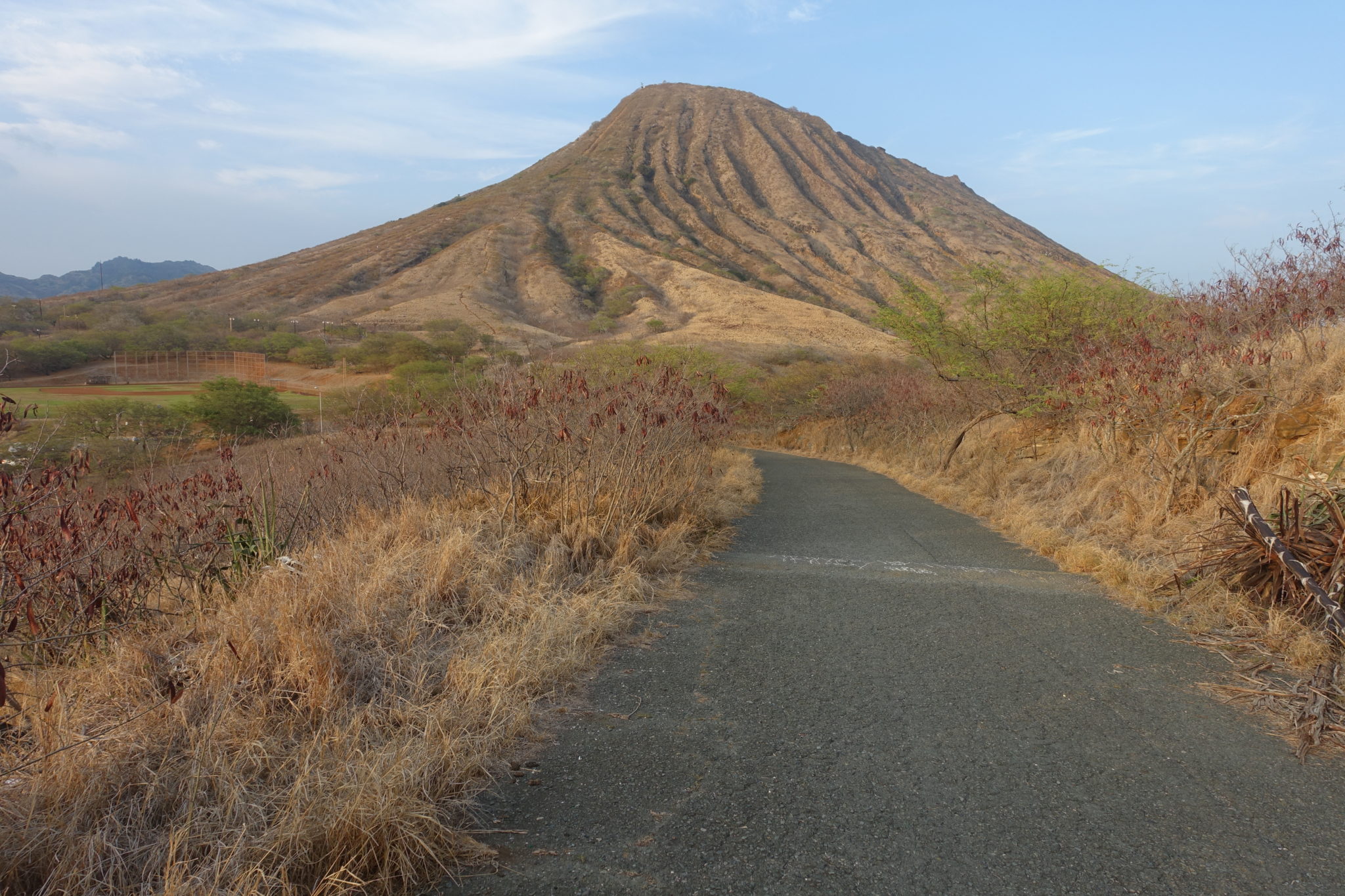 Ich fahre zum Kokohead Trail, von dem ich den Sonnenuntergang ansehen will, Bus 22. Allerdings fährt der letzte Bus dieser Nummer bereits 18 Uhr. Sunset ist erst 18:30 Uhr. Die Wanderung ist extrem anstrengend, es geht eine knappe Stunde steil den Berg hinauf. Als Belohnung gibt es eine klasse Aussicht vom Vulkankrater. Ich laufe den schmalen Weg rechts neben den tausend Stufen hoch. Erst auf dem Rückweg sehe ich, dass es sich hierbei um ein ausgedientes Gleis handelt und man von einem Holzbalken auf den nächsten springen muss. Nicht ganz einfach und sehr stauchend für die Knie!