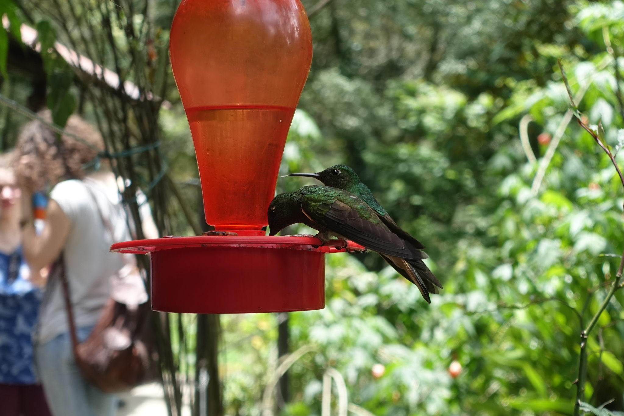 Auf dem Weg nach unten biege ich noch links zum Kolibri Haus ab, der Umweg lohnt sich. Für eine kleine Eintrittsgebühr erhält man eine Suppe und ein Getränk, sowie den Blick auf Kolibris die hier natürlich angefüttert werden. Der Rückweg ist etwas schlammig, das Hostel wollte mir Gummistiefel aufschwatzen, bin sehr froh, dass ich die nicht mitgeschleppt habe! Die Landschaft unterhalb des Dschungels erinnert an die Schweiz, Kühe weiden im Gras, nur die Palmen dahinter sind etwas surreal. Am Ende der Wanderung liegt linker Hand eine Forellenzucht, klar, dass ich mir die auch noch anschaue. Schliesslich habe ich gestern Abend den Fisch von hier gegessen. Danach gehts mit dem Willy Jeep wieder zurück nach Salento.