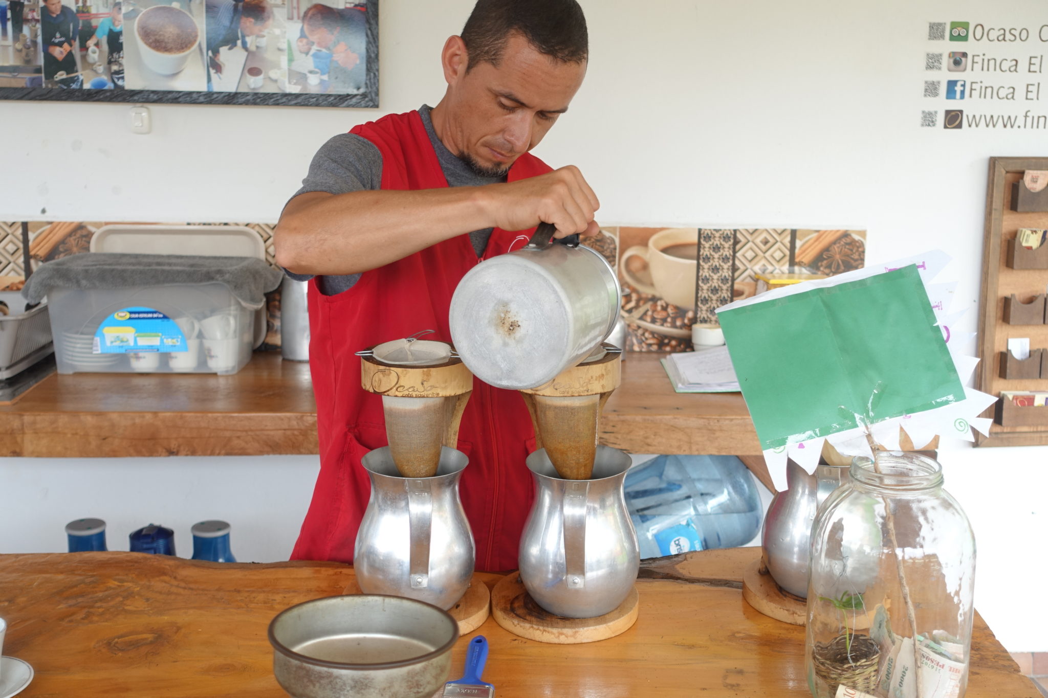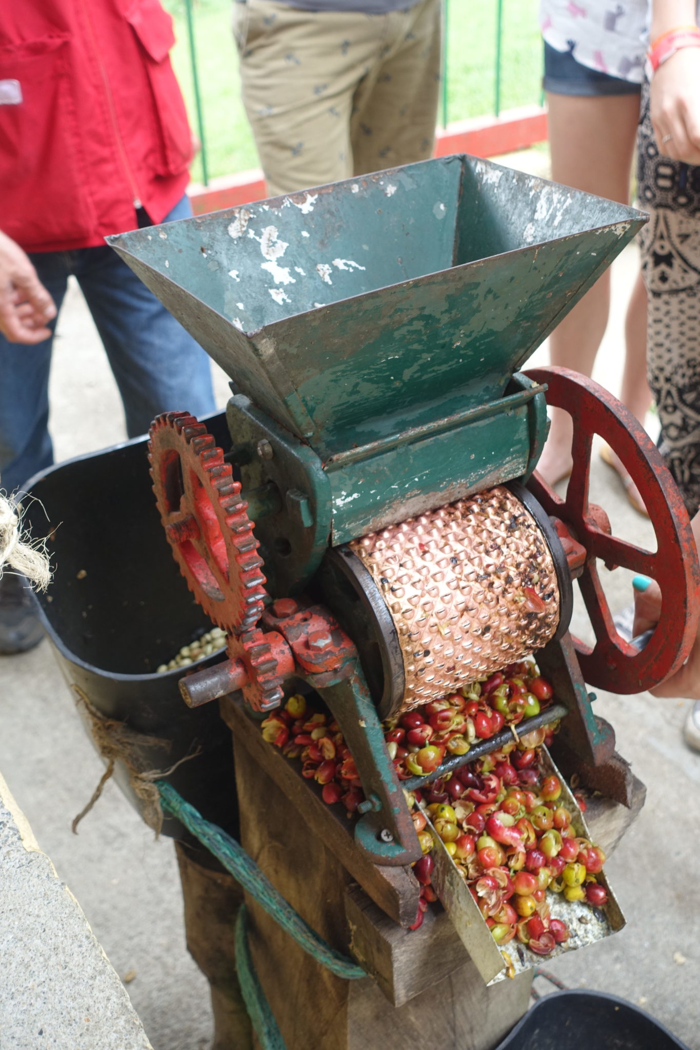 Der zweite Tag in Salento steht ganz im Zeichen des Kaffees – schliesslich bin ich in der Zona Cafetera. Die Kaffeeplantagen liegen etwa 5 km ausserhalb von Salento, die Wanderung dorthin ist bei den Temperaturen in der bergigen Landschaft eher sportlich. Es überholen mich einige Radfahrer, mir wäre das viel zu bergig. Es gibt quasi nur eine Kaffeefarm, die richtig tolle Touren anbietet – die El Ocaso Coffeetours. Ich bin also froh, die Farm El Ocaso nach etwa einer Stunde zu erreichen. Ich habe grosses Glück, dass die Führung in 20 Minuten beginnt, denn ich hatte keine Ahnung, dass es dafür offenbar fixe Zeiten gibt. Wir sind etwa 12 Leute, die gespannt zuhören, wie Kaffee angebaut, gepflückt und verarbeitet wird. Wir pflücken sogar selbst und mahlen danach unsere Ernte in einer Maschine, die ein Deutscher erfunden hat. Die Bohnen werden getrocknet und dann sortiert (Frauenarbeit). Zum Schluss der etwa einstündigen Tour gibt es noch superfrischen selbstgebrühten Kaffee.