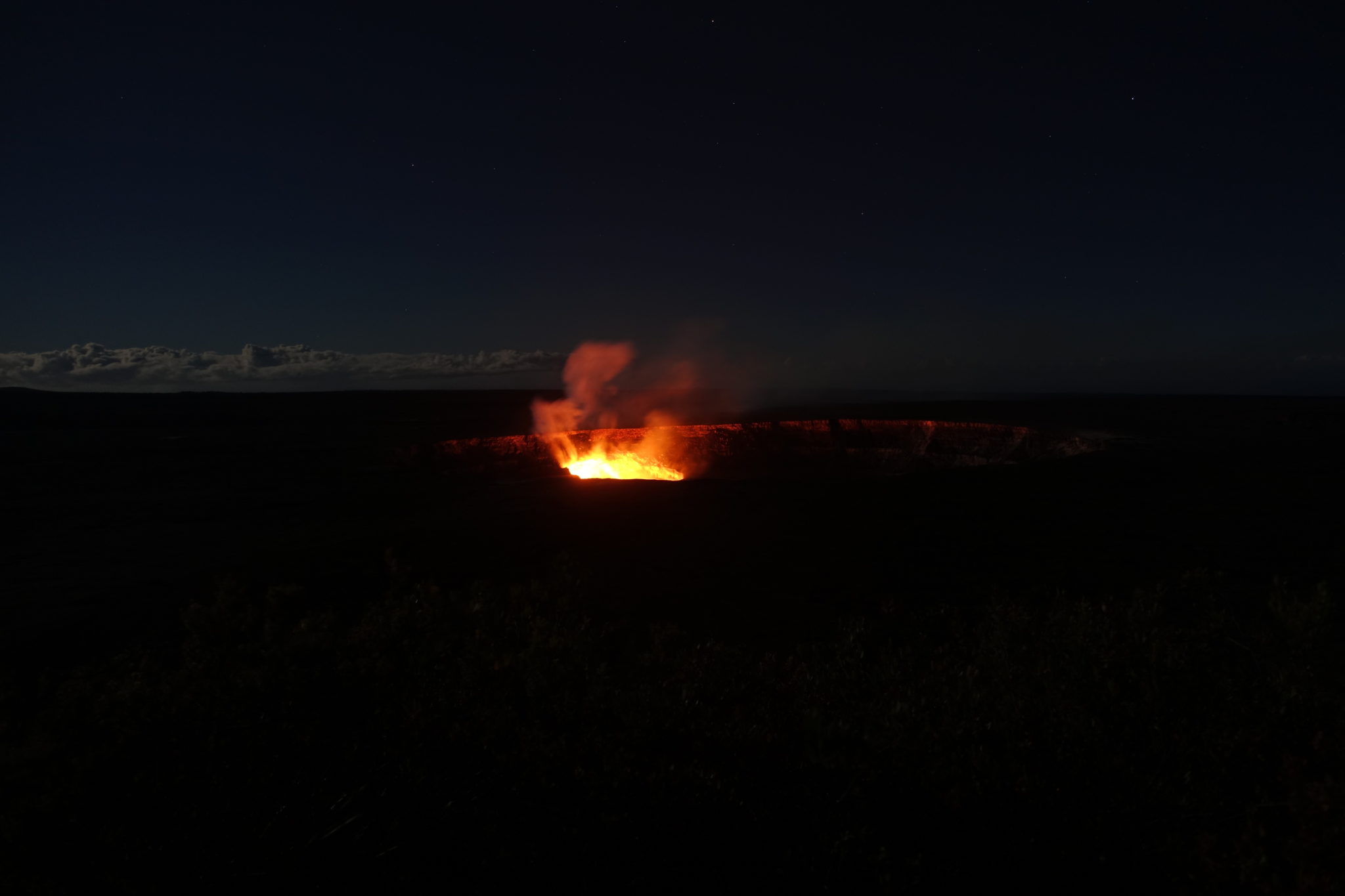 Im Volcano Village legen wir noch einen kurzen Stopp bei einem B&B Cottage ein, um nach den Zimmerpreisen zu fragen. Der sehr netter Besitzer empfiehlt uns neben seiner Unterkunft, das Restaurant Ohelo Cafe in Volcano Village, in Kona das Ponds Restaurant und gibt sogar noch Kulturtipps. Wir folgen seinen Insidertipps und finden uns im Art Center bei einem Hula Hula Vortrag mit Tanzeinlagen wieder, der sogar vom lokalen Fernsehen aufgezeichnet wird. Das Art Center ist grosse Klasse, sehr sehenswert! Nun ist es auch dunkel genug, um nochmal zum Krater zu fahren und den orange-rot leuchtenden Kessel zu bestaunen. Die Touristen drängeln sich am Jaggar Museum. Näher, kommt man momentan leider nicht heran. Wir machen uns auf der Aussichtsplattform ganz lang und sehen sogar wie am Kraterrand die Lava spritzt. Aber ohne ordentliches Teleobjektiv ist hier nur ein roter Fleck auf den Fotos zu sehen.