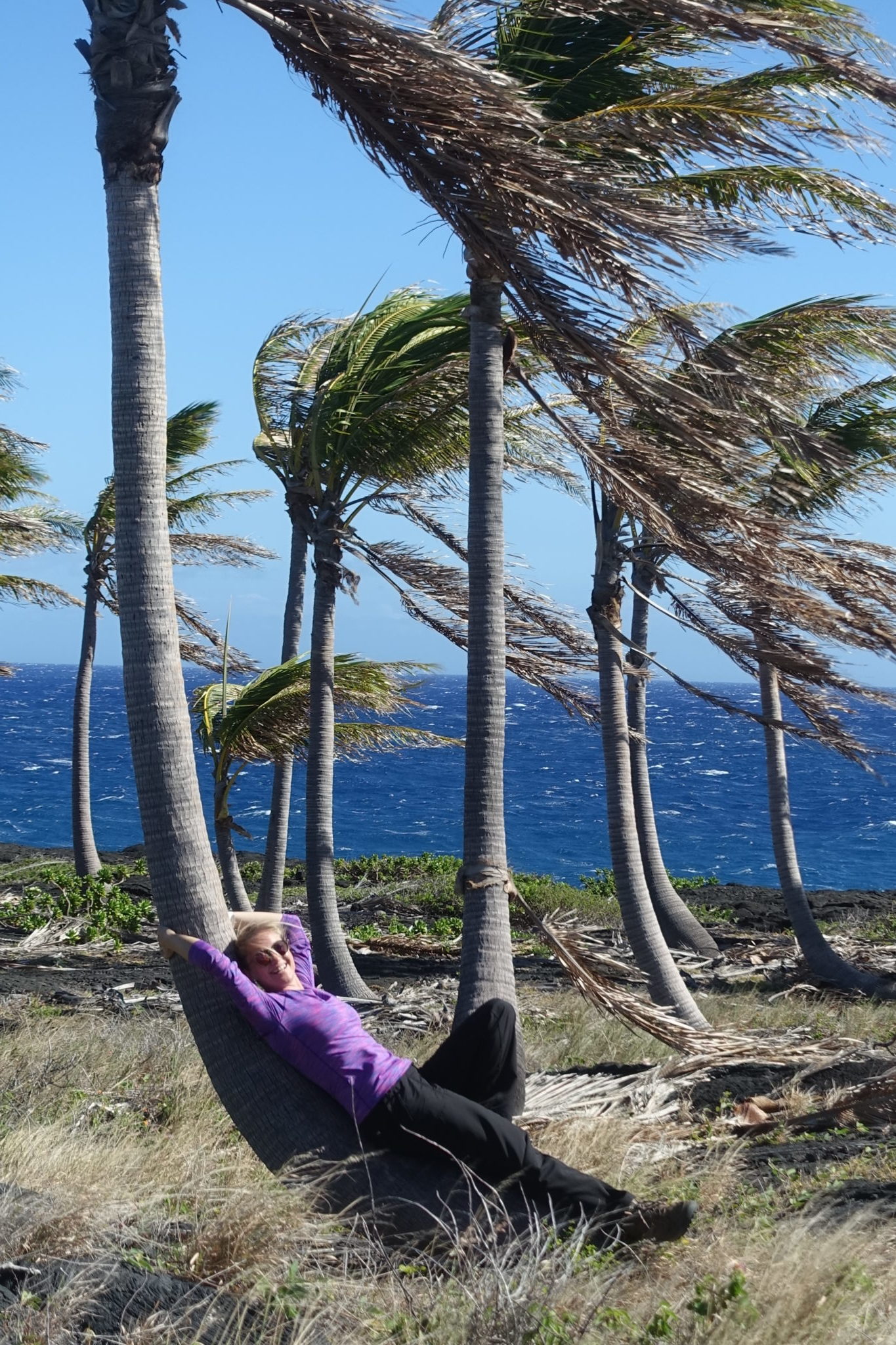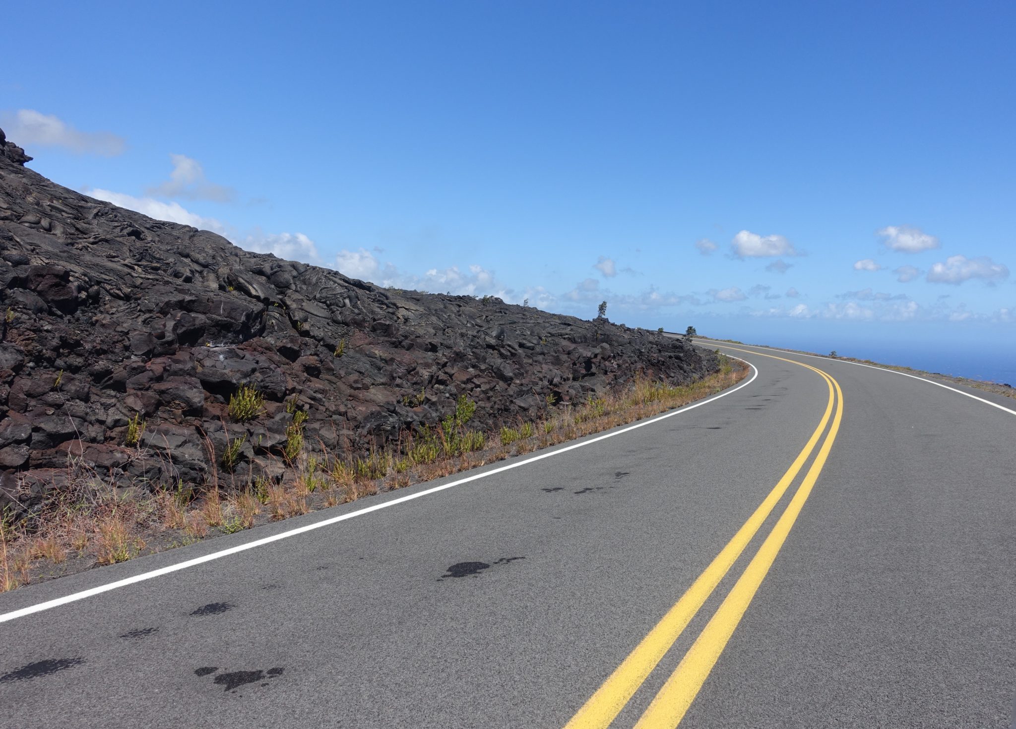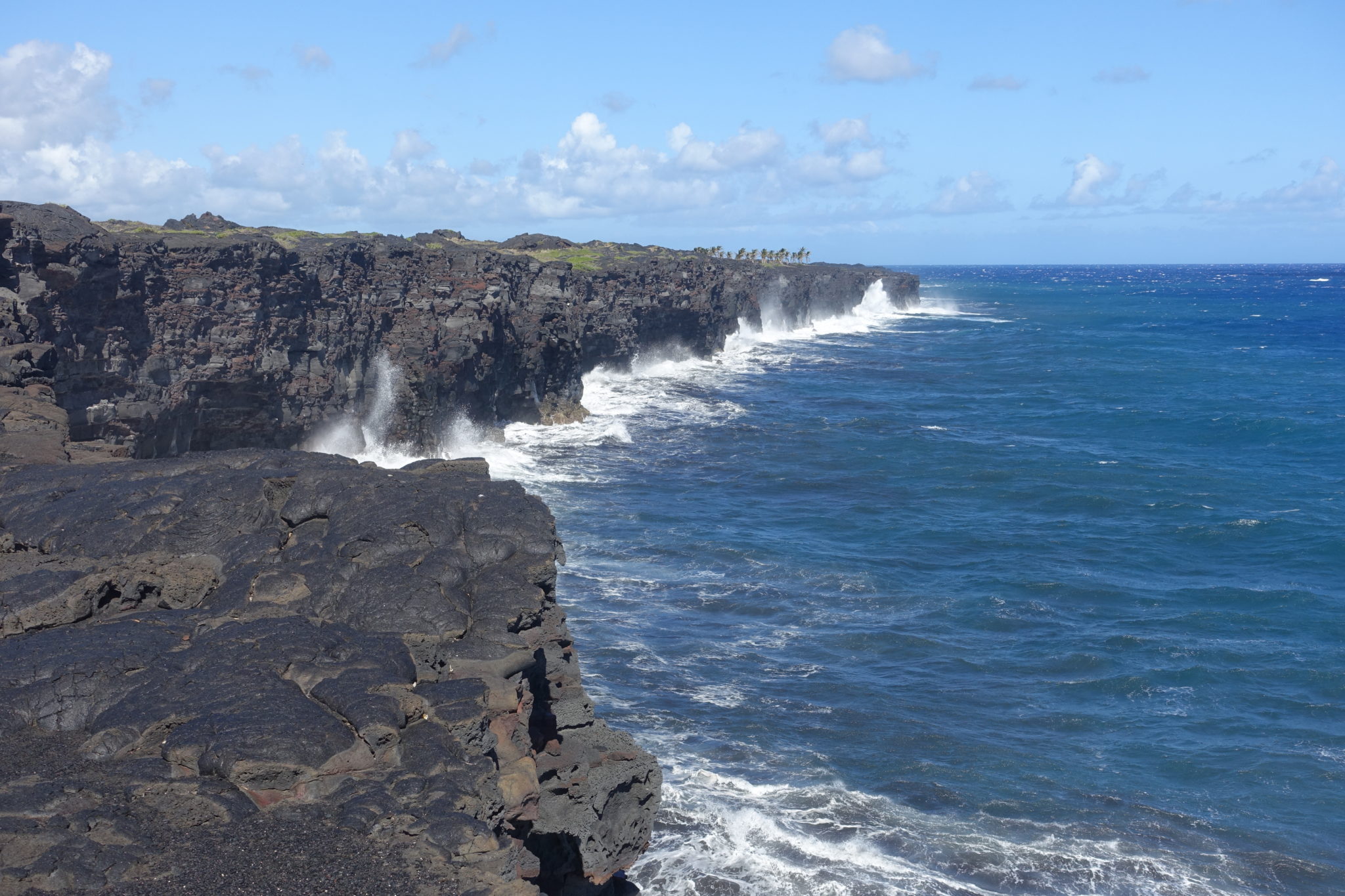 Die Strasse im Nationalpark hinunter zur Küste folgend, kommen wir an weiteren dampfenden kleinen Vulkankegeln vorbei. An der Küste angekommen, kämpfen wir uns gegen den orkanartigen Wind zu einigen wirklich schönen Aussichtspunkten. Das Visitor Center des Volcano Nationalparks sollte man spätestens auf dem Rückweg auf jeden Fall besuchen, es beinhaltet ein kleines Museum und ein Kino, in dem wir uns erstmal ausruhen können. Anschliessend fahren wir zum Jaggar Museum, von wo man den grossen aktiven Vulkan Halema‘uma‘u sehen kann, der spuckt Lava und wir sehen Rauch aufsteigen.