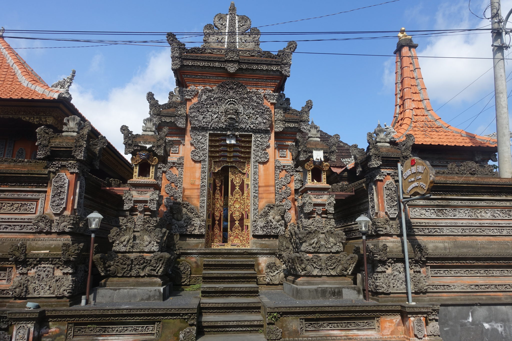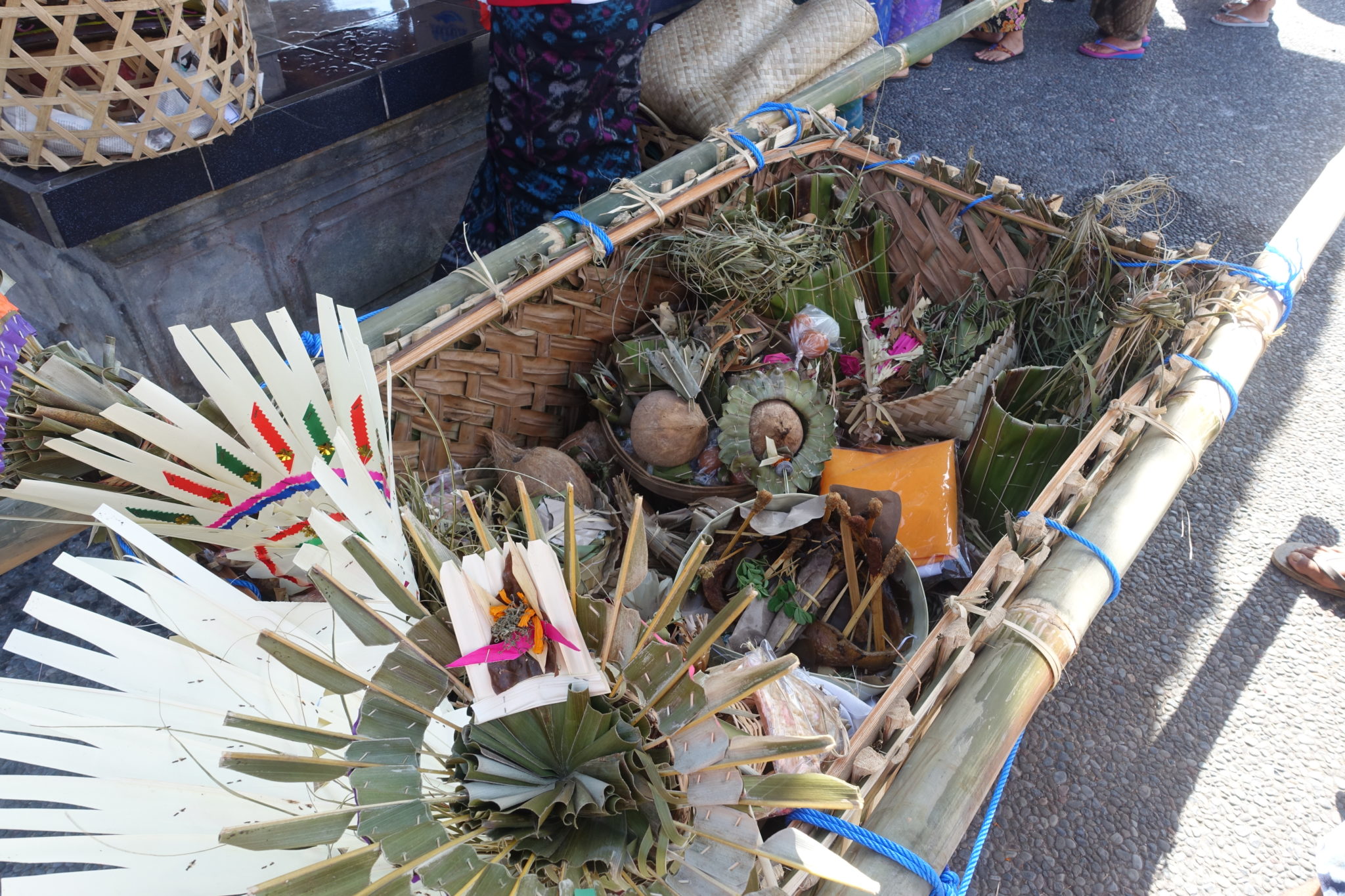 Lake Beratan mit dem Tempel Pura Ulun Danu Beratan. Der Tempel liegt etwa 90 Minuten von Ubud entfernt, wir fahren durch wunderschöne, ländliche, ursprüngliche Landschaften mit ruhigen Dörfern, vorbei an Reisfeldern. Der Tempel ist morgens 10:30 Uhr noch nicht so überlaufen, wir haben Glück, dass gerade eine Zeremonie für einen verstorbenen Pfarrer stattfindet. Sie haben am Vortag, die Asche im See versenkt, erzählen sie und heute wird die Seele gefeiert. Reichliche Opfergaben schmücken den Tempel.