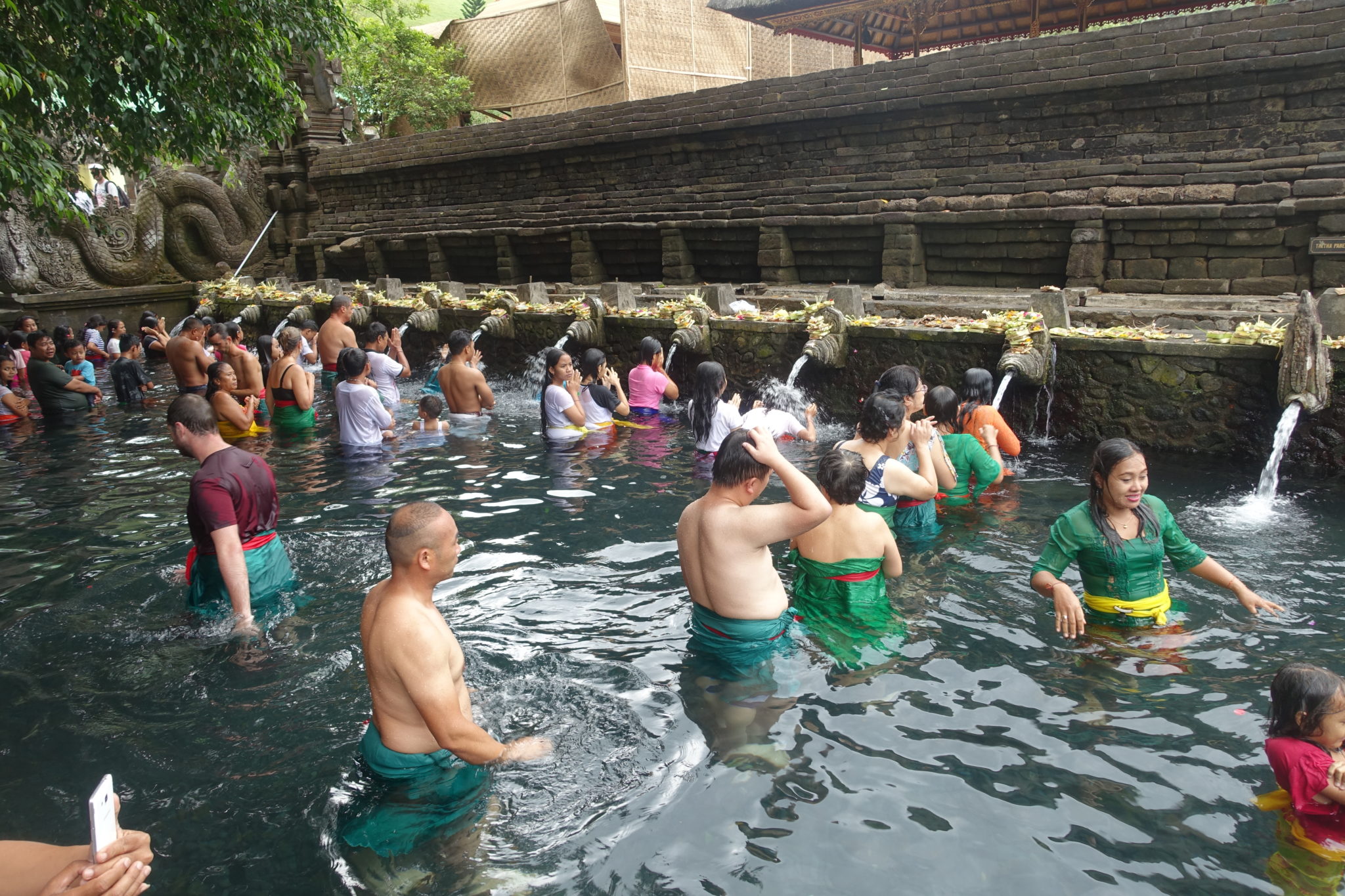 Wir fahren weiter nach Südosten zum Tempel Tirta Empul in Tampak Siring, in diesem Tempel hat das Quellheiligtum magische Kräfte und entsprechend waschen sich die Indonesier in einem riesigen Wasserbecken. Es ist spannend zuzusehen, sie stehen an mindestens 10 Fontainen in Schlangen ewig im kalten Wasser und frieren sichtlich.