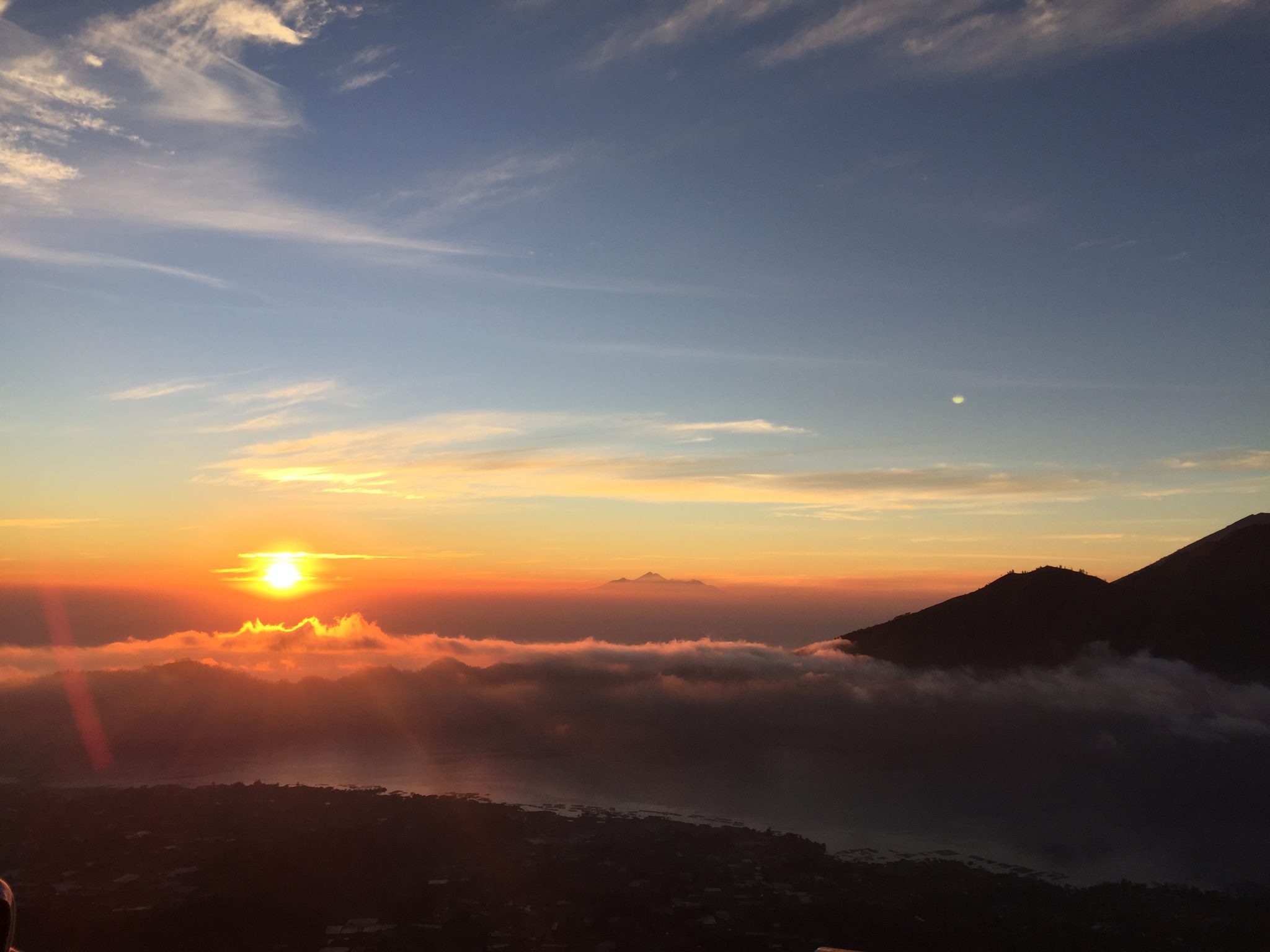 Von Ubud aus, kann man den Mt. Batur zum Sonnenaufgang besteigen. Dieser Berg ist ein Vulkan, der 2000 das letzte mal ausgebrochen ist. Ich buche diesen Ausflug für 350000 Rp. Im Secret Garden Guesthouse und werde 2 Uhr abgeholt. In einem Kleinbus fahren wir ca. 1 Stunde bis zu einer Kaffeeplantage, wo es 3 Uhr in der Nacht Frühstück gibt. Pancakes und Kaffee oder Tee. Wir essen, damit wir Kraft für den zweistündigen Aufstieg haben. Am Parkplatz des Vulkans treffen wir unseren Guide (ein fittes Mädel), sie läuft voraus und wir sechs Mädels folgen ihr. Leider erhalten wir nur 1 Taschenlampe pro zwei Personen. Bin froh, dass ich mein Headlight dabei habe. Beim Aufstieg ist es stockdunkel, wir ahnen, wie viele Menschen mit uns diesen Berg für den Sonnenaufgang besteigen. Es sind wohl tausende! Man sieht die Lichterschlange, der einzige Indiz neben der Zeit, wie weit es noch ist. Der Weg ist unwegsam und steil, ein Vulkan eben. Erinnerungen an Mt. Doom in Neuseeland kommen hoch. Jedoch gibt es hier tatsächlich einen Weg und sogar Infrastruktur mit Versorgungshütten für die vielen Touristen. Nach zwei anstrengenden Stunden kommen wir oben an, es wird langsam hell, als wir in einer Art Theater zum gemeinschaftlichen Staunen Platz nehmen. Der Himmel färbt sich rosa, als unser fitter Guide uns gekochte Eier und Sandwiches reicht. Das zieht bald die Affen an und schon geht der Feuerball auf! Die Eindrücke sind zahlreich, unterhalb des Mt. Batur kommt langsam der See zum Vorschein, die Affen spielen mit dem Essen (die klugen nehmen sich die gesunde Banane vom ungesunden Toast), die Touristen machen Fotos, die Stimmung ist einmalig, wenn auch sehr touristisch. Dann gehts auch schon wieder runter, sehr viel langsamer als ich dachte, denn es müssen sich nun tausende Touristen vorsichtig über das spitze Vulkangestein den steilen Berg hinab quälen. Da leisten mir meine Trekkingschuhe beste Dienste! Da wir die Kaffeefarmbesichtigung aufgrund Tierquälerei dankend ablehnten sind wir bereits 10 Uhr zurück im Hotel. Für den Nachmittag sollte man sich nicht so viel vornehmen, es ist eine echt anstrengende Tour und nachdem die Nacht nur 2 Stunden lang war, will ich den Rest des Tages schlafen! Yoga liegt natürlich immer Abends drin!