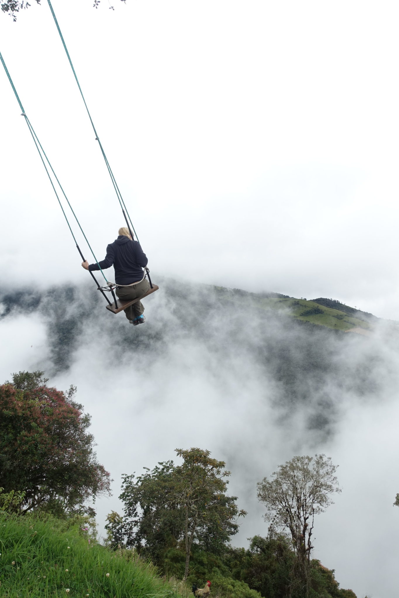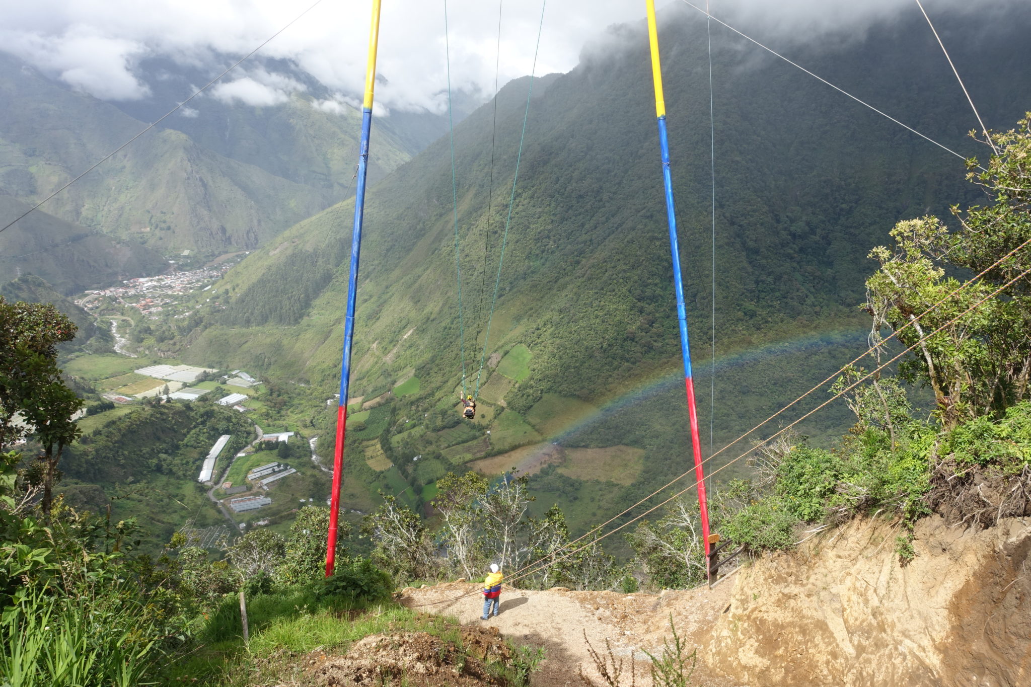 Stephanie stellt sich als angenehme Reisebegleitung für die nächsten Tage raus! Wir bereiten gemeinsam ein tollen Avocado Sandwich Frühstück mit Früchten und Tee in unserer Hostelküche zu und nehmen anschliessend den 11 Uhr Bus zum Casa Arbol. Dort gibt es einen Spielplatz für Gross und Klein, Eintritt 1 Dollar. Wir begeben uns in die Schlange zum Schaukeln. Diese Schaukel ist berühmt für den fantastischen Blick in die Bergwelt und auf die Vulkane, wenn da nicht diese verdammten Wolken wären! Wir sind uns einig, dass wir uns die grössere Schaukel „Vuelo del Condor“ auch noch anschauen müssen. Also nehmen wir den Bus 13 Uhr zurück und steigen nach etwa einem km bei der grösseren Schaukel aus. Wir laufen noch ein Stück und erreichen einen weiteren tollen Aussichtspunkt über die Stadt. Von dort startet eine Art Mix zwischen Bungee Jump und Schaukel. Man hat sicher ein paar Meter freien Fall und schaukelt danach in Richtung Baños mit tollem Ausblick über die Stadt! Kostenpunkt: 20 Dollar! Da sie einem das Brett unter den Füssen wegziehen, ist es gar nicht so schlimm. Ich bekomme sogar Stephanie überredet! Es ist toll – Adrenalin garantiert! Wir trampen zurück, denn es wären sicher weitere 2 Stunden zu Fuss nach Baños. Wir entdecken in Baños den Mercado, wo wir für nur 2.50 Dollar super zu Mittag essen! Stephanie wollte eigentlich die lokale Delikatesse Meerschwein ausprobieren, aber die scheint es momentan nur Freitags zu geben.