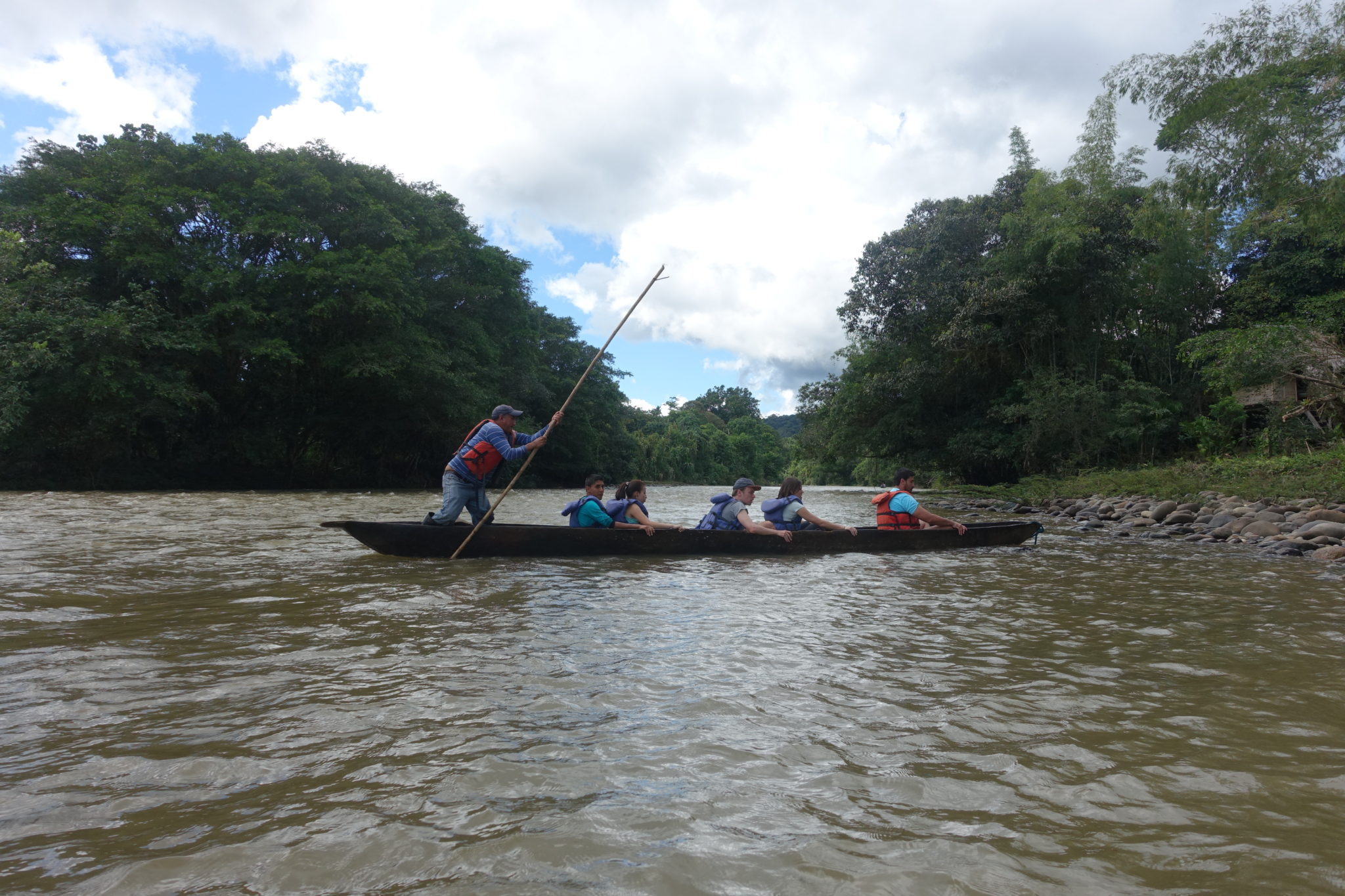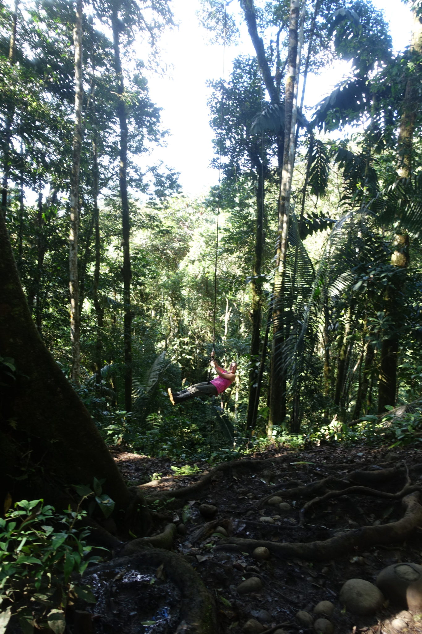 Von Baños ist der Ecuadorianische Dschungel in einer Tagestour zu erreichen. Die Fahrt wird vom Hostal für 30 Dollar angeboten, angeblich 5 Dollar mehr, weil sie in Englisch ist. Wir fahren am nächsten Tag also Richtung Puyo, was eineinhalb Stunden östlich von Baños liegt. Der erste Stopp ist ein Wildlife Sanctuary, also ein Art Hospital für die Dschungeltiere. Wir sehen Affen, Tapire, Krokodile, Schildkröten, Papageie, Geparden, Schweine. Anschliessend fahren wir zum Fluss, wo man uns Gummistiefel gibt, um in ein Kanu einzusteigen. Wir treiben den Fluss im Dschungel entlang, das ist herrlich, fast meditativ. Tiere sehen wir leider keine. In der Dschungellodge angekommen, gibt es ein einfaches, kleines Mittag (Almuerzo) mit Reis, Gemüse, Salat und Suppe. Wir behalten die Gummistiefel an und fahren noch ein Stück zum Start unserer Wanderung. Ich kann es nicht glauben, dass ich gleich 2 Stunden mit Gummistiefeln wandern soll? Aber wir sind im Dschungel und ich lasse mich überzeugen, dass diese Dinger notwendig sind, diesmal mit Socken bitte, sagt der Guide. Also gut, wir waten los, es ist offenbar absolut notwendig die Dinger zu tragen, wir sinken im Morast fast knietief ein, durchqueren Flüsse und kämpfen uns durch den schlammigen Dschungel! Der Guide zeigt uns Spinnen, die zwei Hunde die uns begleiten bellen ab und zu, aber meine Hoffnung weitere Tiere zu sehen, schwindet recht schnell! Nach etwa einer Stunde erreichen wir den Jungle Swing, der Guide schwingt sich furchtlos auf einem Holz durch den Dschungel, fast wie Tarzan! Die Mutigen folgen und bald bin ich auch in den Gipfeln der höchsten Bäume und unter mir mehrere hundert Meter Abgrund, alles grün! Juchzend schaukel ich zwischen den Baumwipfeln hin und her! Auf dem Rückweg haben wir die Möglichkeit unter einem Wasserfall zu schwimmen. Anschliessend fahren wir zu einem Stamm Eingeborener, die warten schon recht touristisch in ihrer Hütte auf uns, bemalen uns mit Farbe und lassen uns mit ihrem Jagdrohr auf eine Holzfigur zielen. Die Rückfahrt geht mit unserem Busrennfahrer Schumacher schneller als gedacht. Trotzdem finden wir an diesem Dienstagabend kaum ein offenes Restaurant gegen 20 Uhr und landen daher in einem ecuadorianischen Laden, wo ich einen fantastischen Fisch für 3.50 Dollar esse.
