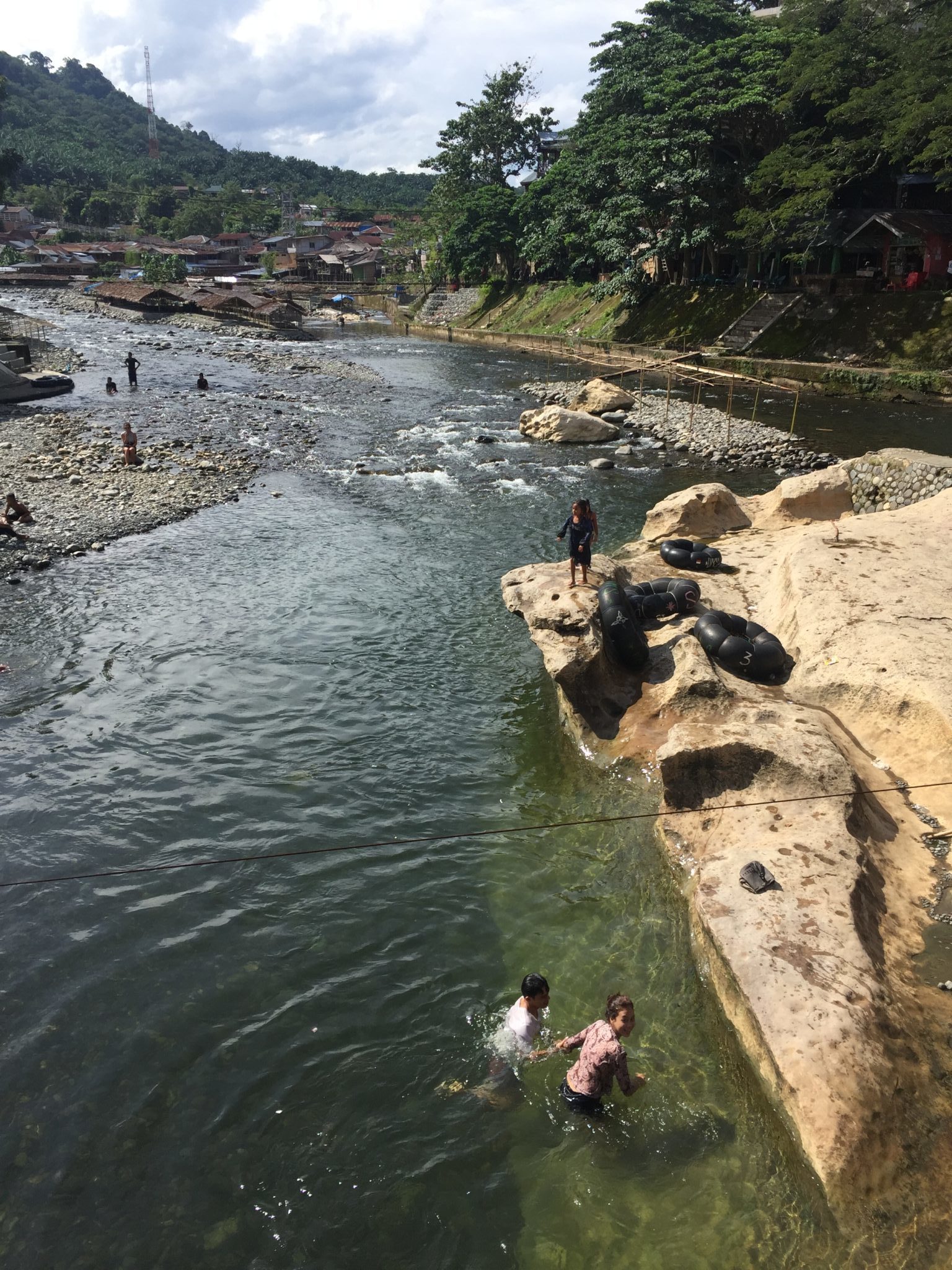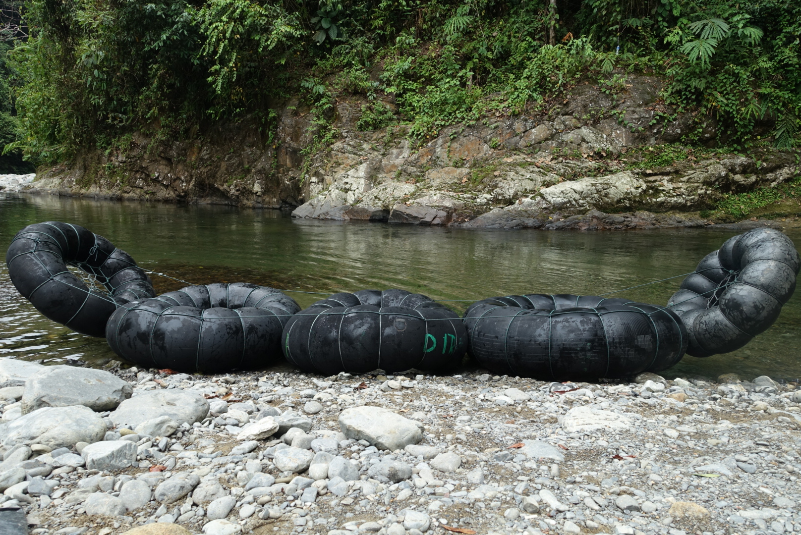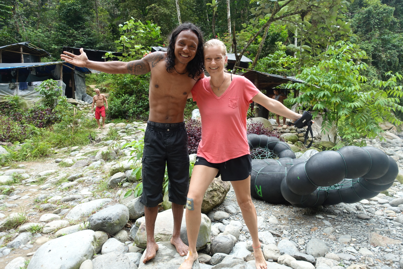 Nach Rückkehr der anderen vom Wasserfall, gibt es ein grandioses Ei-Sandwich Frühstück mit ganz viel Obst, Tee und Kaffee am Fluss. Anschliessend werden die Tubes (grosse Gummireifen) präpariert, auf denen wir bald den Fluss hinab nach Bukit Lawang raften. Unser Hab und Gut wird in grossen Plastiksäcken verstaut, mein Bein mit den offenen Wunden auch und dann gehts ab den Fluss hinab! Die Fahrt ist wild, obwohl der Fluss recht wenig Wasser hat. In einer Stunde sind wir zurück in Bukit Lawang. Die zwei Tage im Dschungel waren ein fantastisches Erlebnis und riesiges Abenteuer.