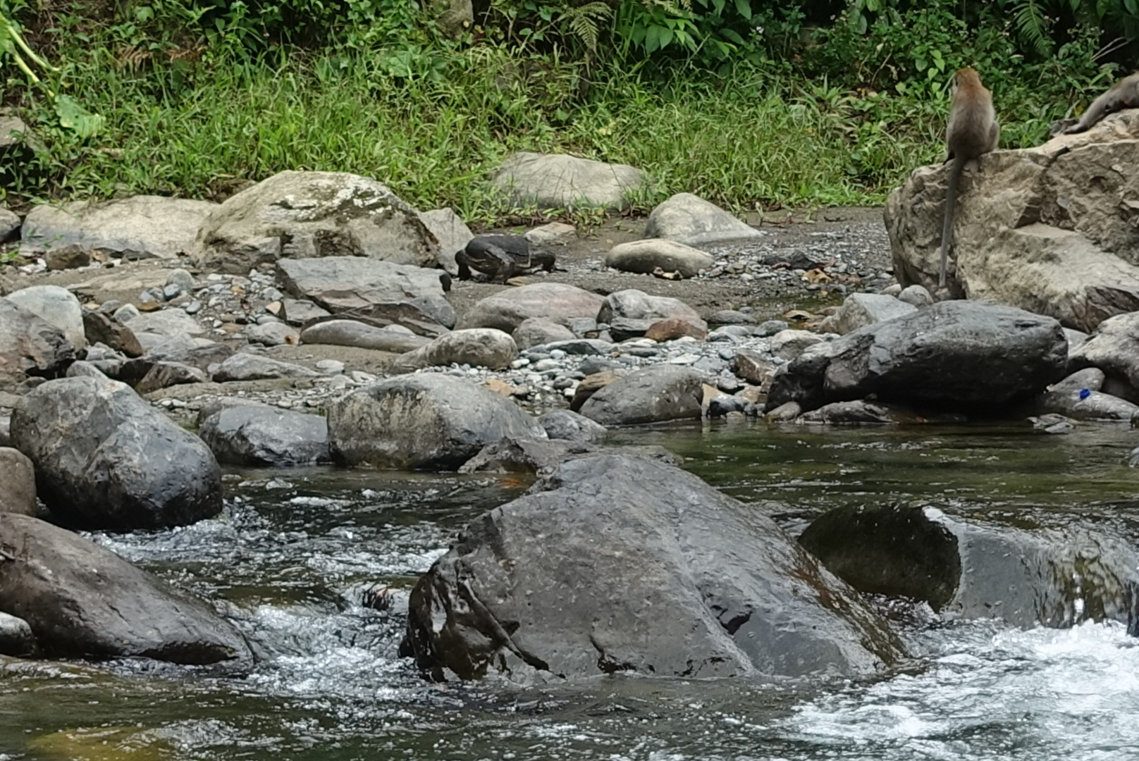 Während ich auf die Rückkehr der Gruppe vom Wasserfall warte, entdecke ich noch einen grossen Waran auf der anderen Flussseite. Er läuft ganz langsam über die Steine, ungestört von den um ihn herum springenden Makaken Äffchen, sucht er sich Futter und sonnt sich dann wieder auf einem grossen Stein. Es ist einfach wunderschön hier am Fluss zu sitzen und die noch unberührte Natur zu geniessen.