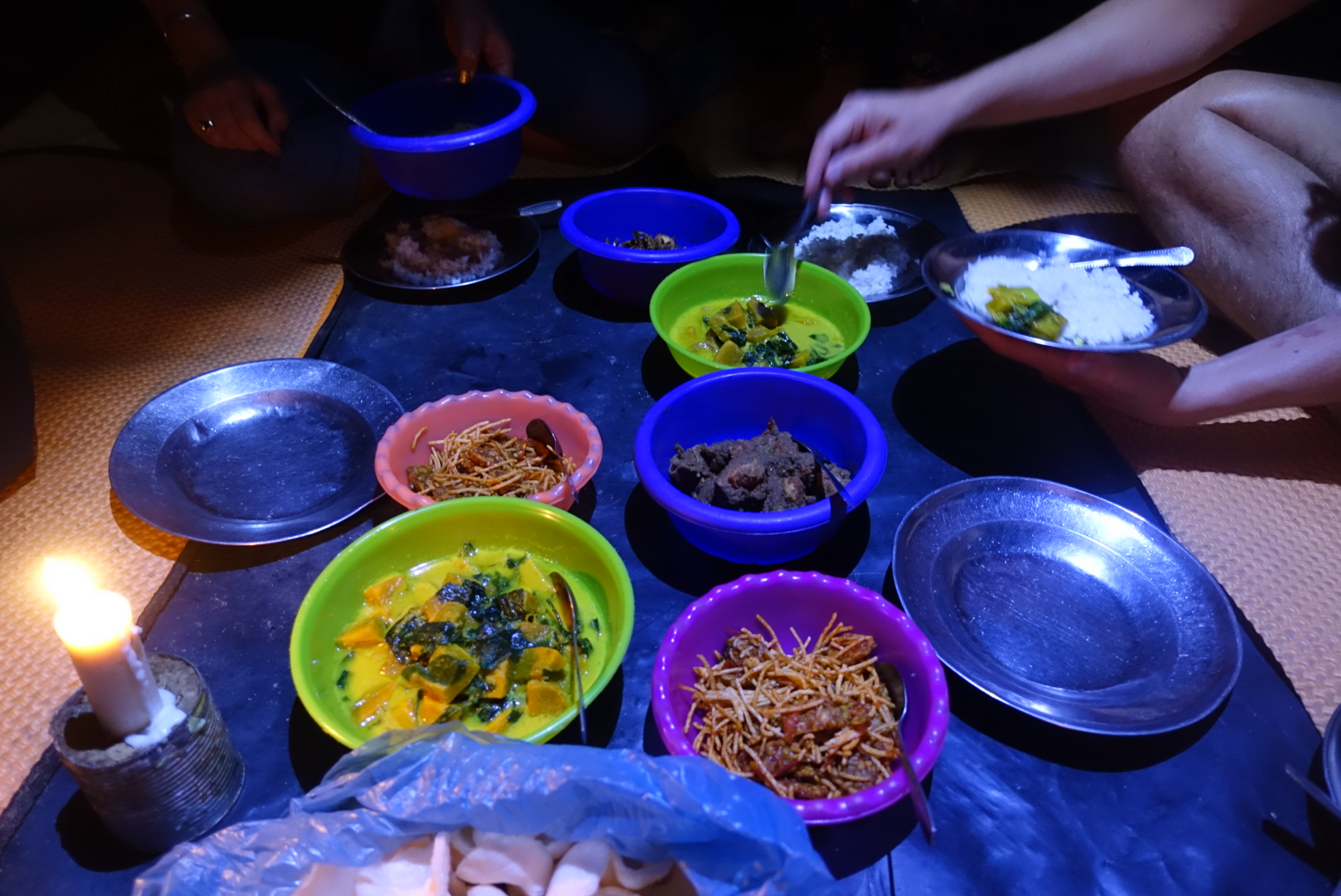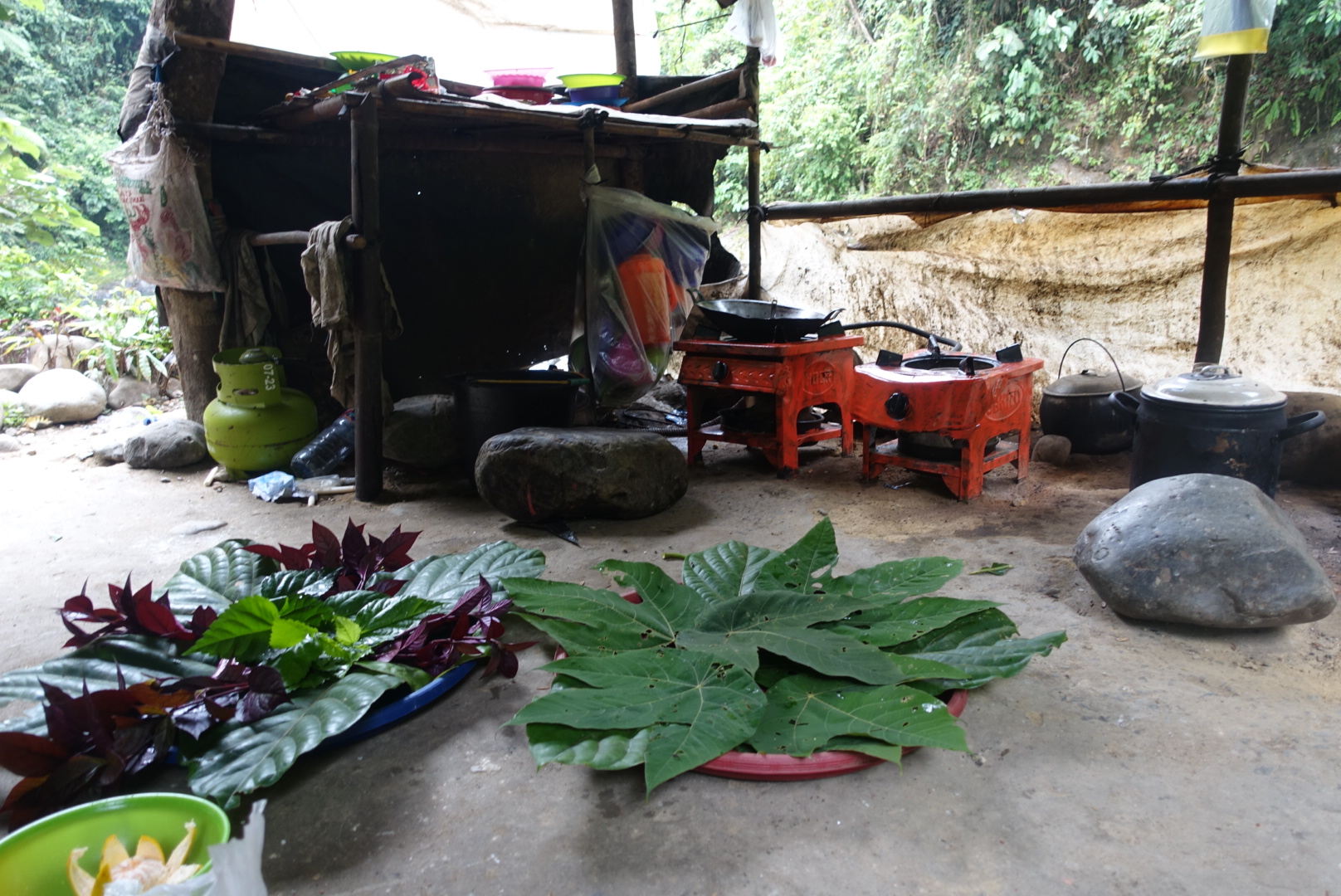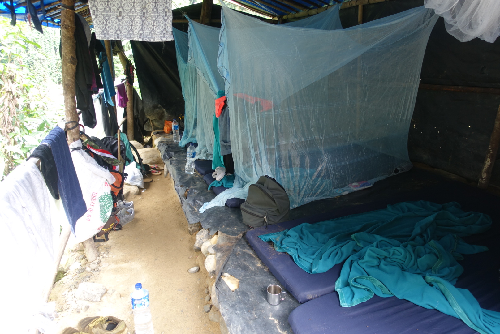Wir sind alle froh, als wir nach 7 Stunden das Lager am Fluss erreichen. Die Flussüberquerung tut gut, das Wasser ist klar und kalt. Unser Guide Anton hilft jedem einzeln auf die andere Seite des Flusses zu kommen. Nun haben wir es endlich geschafft. Das Lager ist einfach und gut, auf einer Plane unter einem Wellblechdach liegen dünne Matratzen, umspannt mit Moskito-netzen, wird das unser Bett für diese eine Nacht sein. Es gibt sogar ein stilles Örtchen, natürlich nur mit Spülung aus dem Eimer. Zur Begrüssung im Camp gibt es Tee und Kekse. (So viel Essen!!!) Während der Koch das Dinner bereitet, springen wir in den Fluss, der ist herrlich erfrischend nach dieser strapaziösen Wanderung. Zum Dinner gibt es allerlei indonesische Köstlichkeiten, Kürbis-Curry, gerösteten Tofu, Hühnchen, Reis und Gemüse in Buffet-form. Es ist super lecker! Wir lassen den abenteuerlichen und erlebnisreichen Tag am Lagerfeuer mit Tee und Nüssen ausklingen.