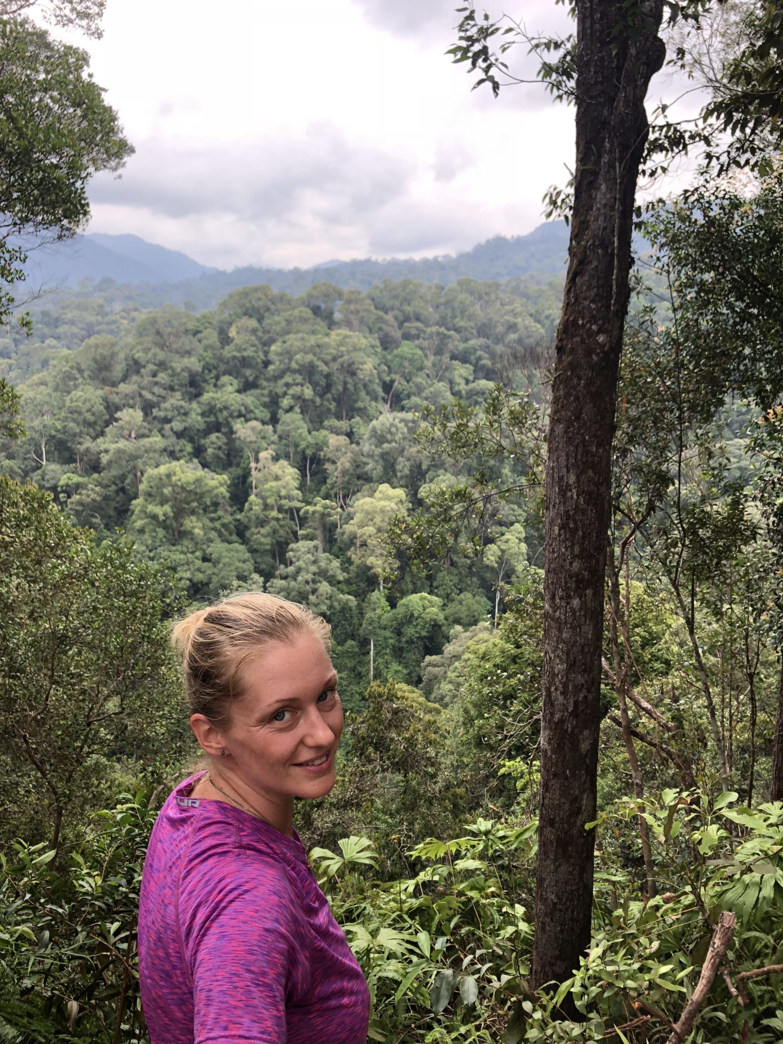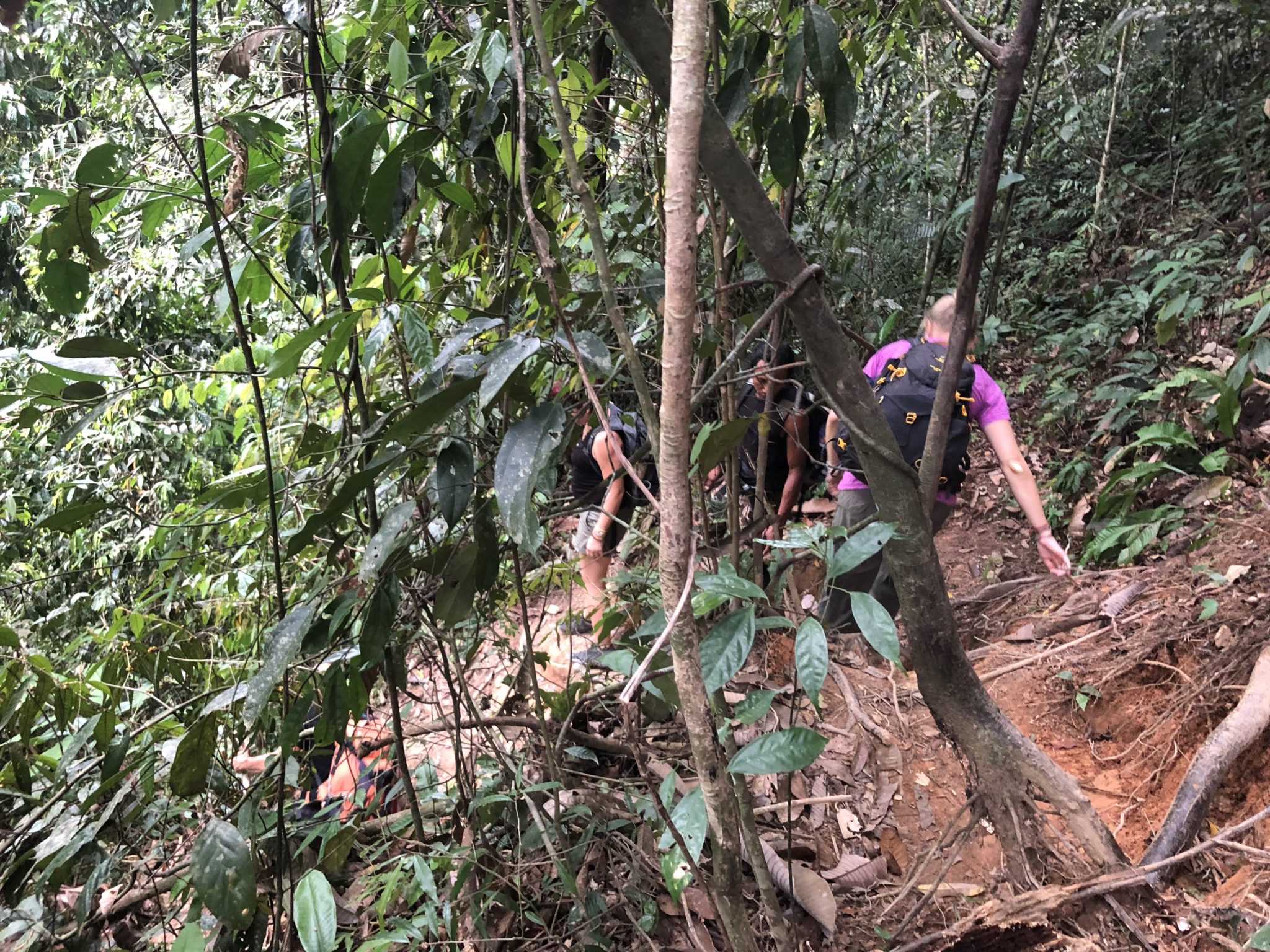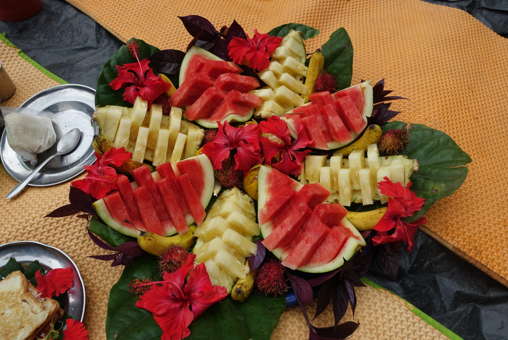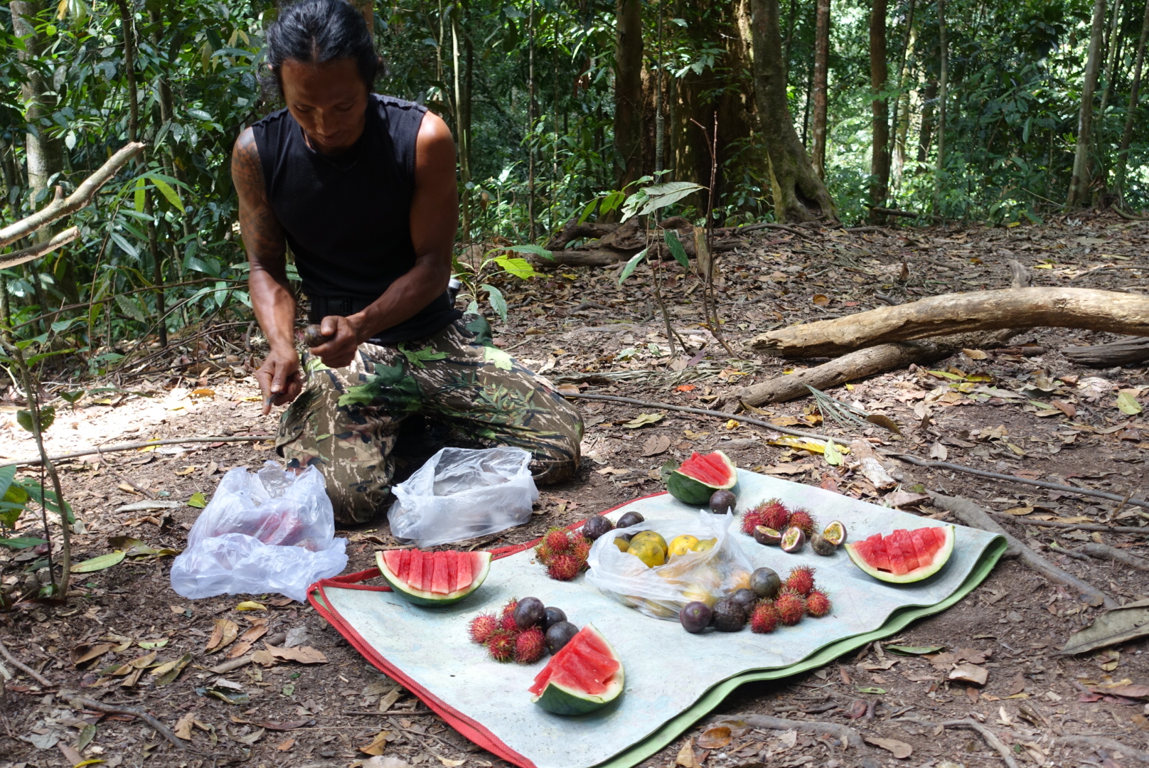 Unsere tropische Wanderung geht schweisstreibend auf einen Hügel, von dem wir eine wunderschöne Aussicht auf den verbliebenen Dschungel haben. Der Guide erzählt ganz stolz, wie sie den jetzt schützen und dass vor allem Deutschland viel gespendet hat. An diesem wunderschönen Aussichtspunkt gibt es eine weitere Obstpause, mit Mangosteen, Rambotan, Mandarinen und Melone. Es ist erstaunlich wie viel Nahrung die Träger für uns in den Dschungel tragen. Ausserdem staune ich über die Schwierigkeit der Wanderung, wir haben uns mit unserer jungen, aktiven Gruppe für den schwierigen (untouristischen) Pfad entschieden. Dass er so schwierig wird, dass wir auf allen vieren steile Hänge hoch und runter krauchen, hätte ich nicht gedacht.