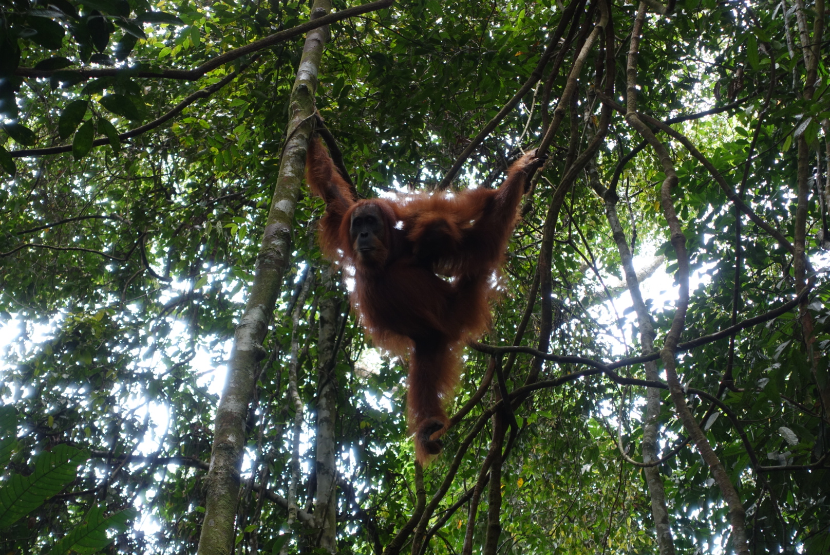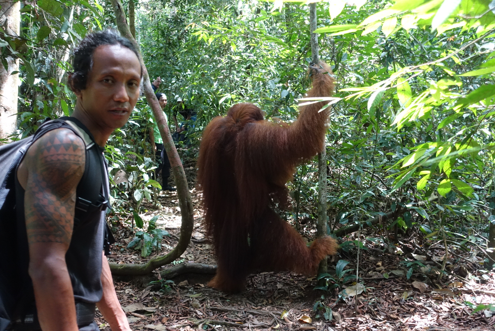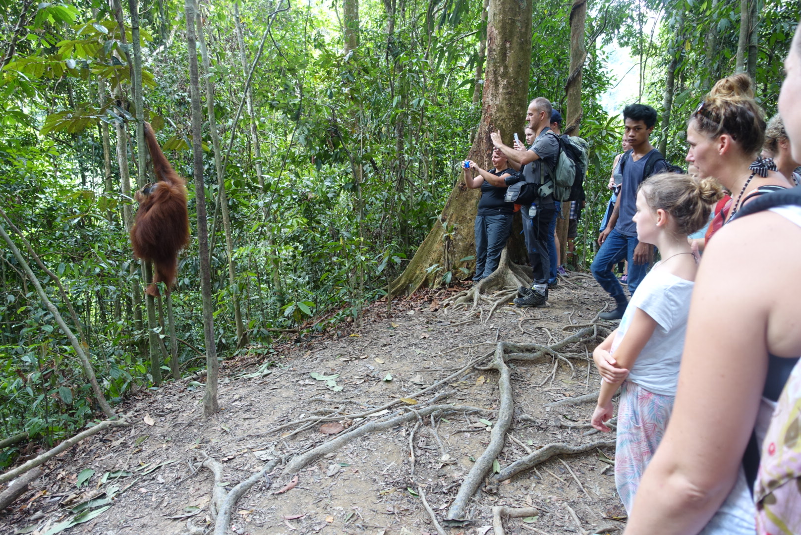 Der Dschungel ist voller Touristen, es ist Hochsaison und es gibt kein Limit der Nationalpark-Besucher. Wir laufen weiter, die Wege werden langsam unwegsamer, da sehen wir plötzlich was rötliches im Busch. Ein Orang Utan, wir sind bestimmt noch nicht mal zwei Stunden unterwegs. Er ist riesig und umringt von Touristen. Ein Ranger schaut, dass ihm niemand zu nah kommt oder ihm den Fluchtweg versperrt. Er kommt direkt auf mich zu, ich gehe einen Schritt zurück, er ist schneller als ich denke und doch schwingt er sich langsam und gedigen an den Bäumen entlang. Plötzlich ist er wenige Meter über mir, es ist unheimlich beeindruckend, diese Tiere in ihrer freien Wildbahn zu sehen. Allerdings wird uns auch bewusst, dass sie hier sind, weil sie Futter suchen. Sie erhalten die Reste des Picknicks der Touristenströme, Ananasschalen scheinen sie besonders zu mögen.