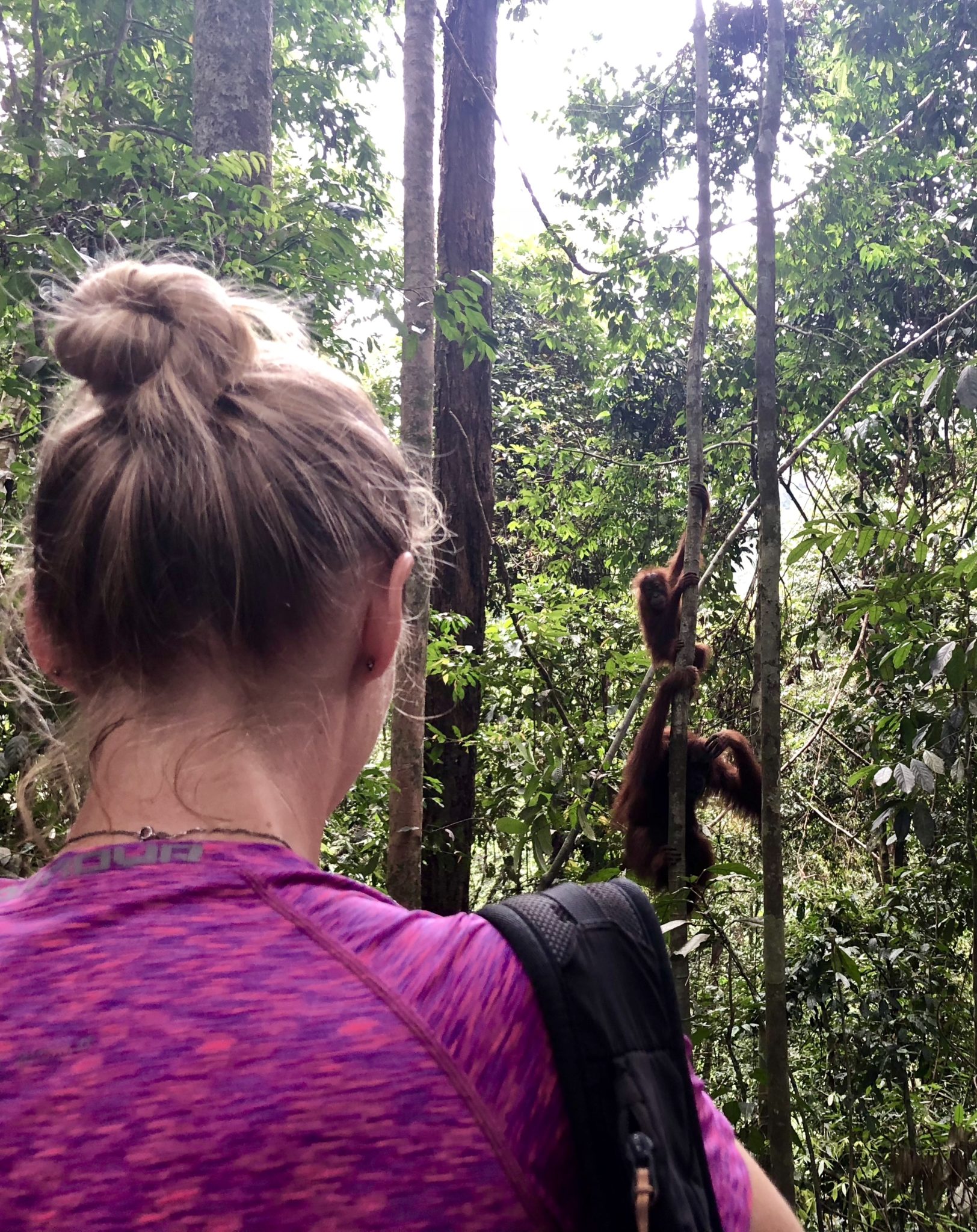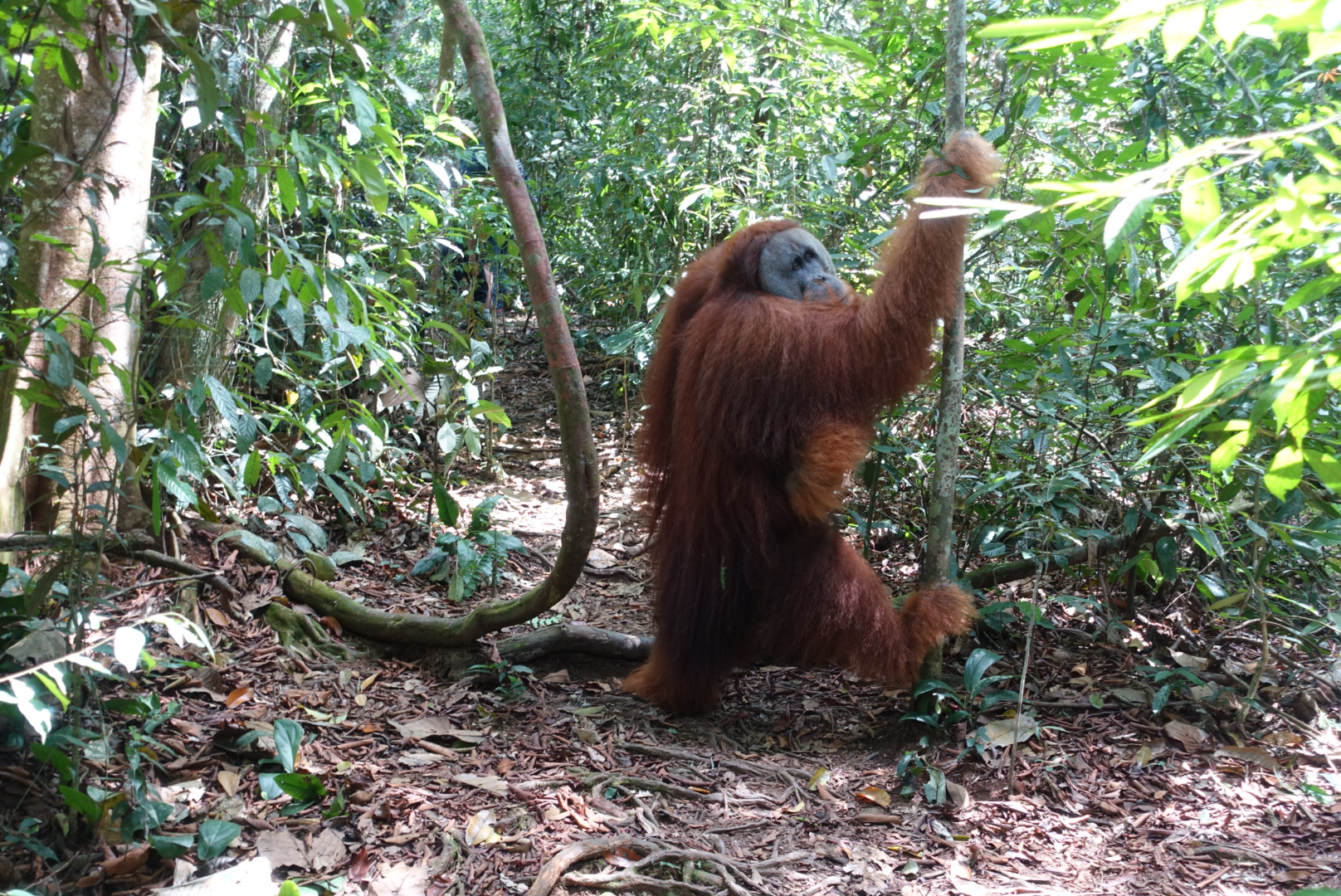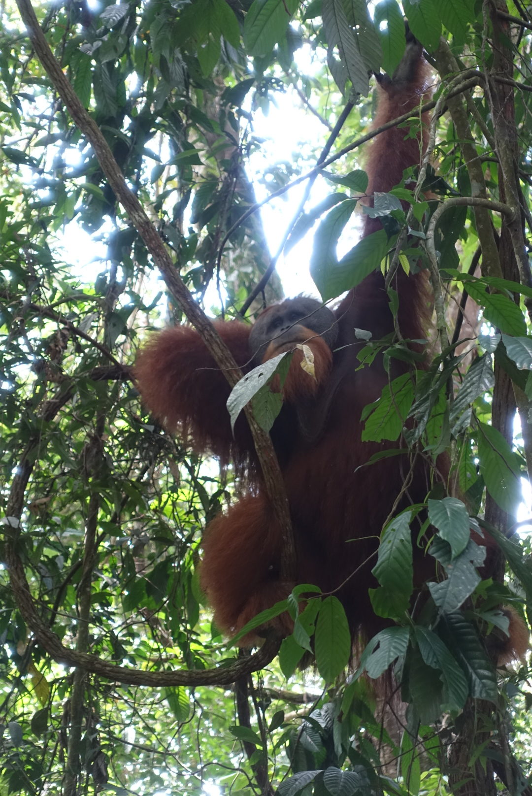 Der Dschungel ist voller Touristen, es ist Hochsaison und es gibt kein Limit der Nationalpark-Besucher. Wir laufen weiter, die Wege werden langsam unwegsamer, da sehen wir plötzlich was rötliches im Busch. Ein Orang Utan, wir sind bestimmt noch nicht mal zwei Stunden unterwegs. Er ist riesig und umringt von Touristen. Ein Ranger schaut, dass ihm niemand zu nah kommt oder ihm den Fluchtweg versperrt. Er kommt direkt auf mich zu, ich gehe einen Schritt zurück, er ist schneller als ich denke und doch schwingt er sich langsam und gedigen an den Bäumen entlang. Plötzlich ist er wenige Meter über mir, es ist unheimlich beeindruckend, diese Tiere in ihrer freien Wildbahn zu sehen. Allerdings wird uns auch bewusst, dass sie hier sind, weil sie Futter suchen. Sie erhalten die Reste des Picknicks der Touristenströme, Ananasschalen scheinen sie besonders zu mögen.