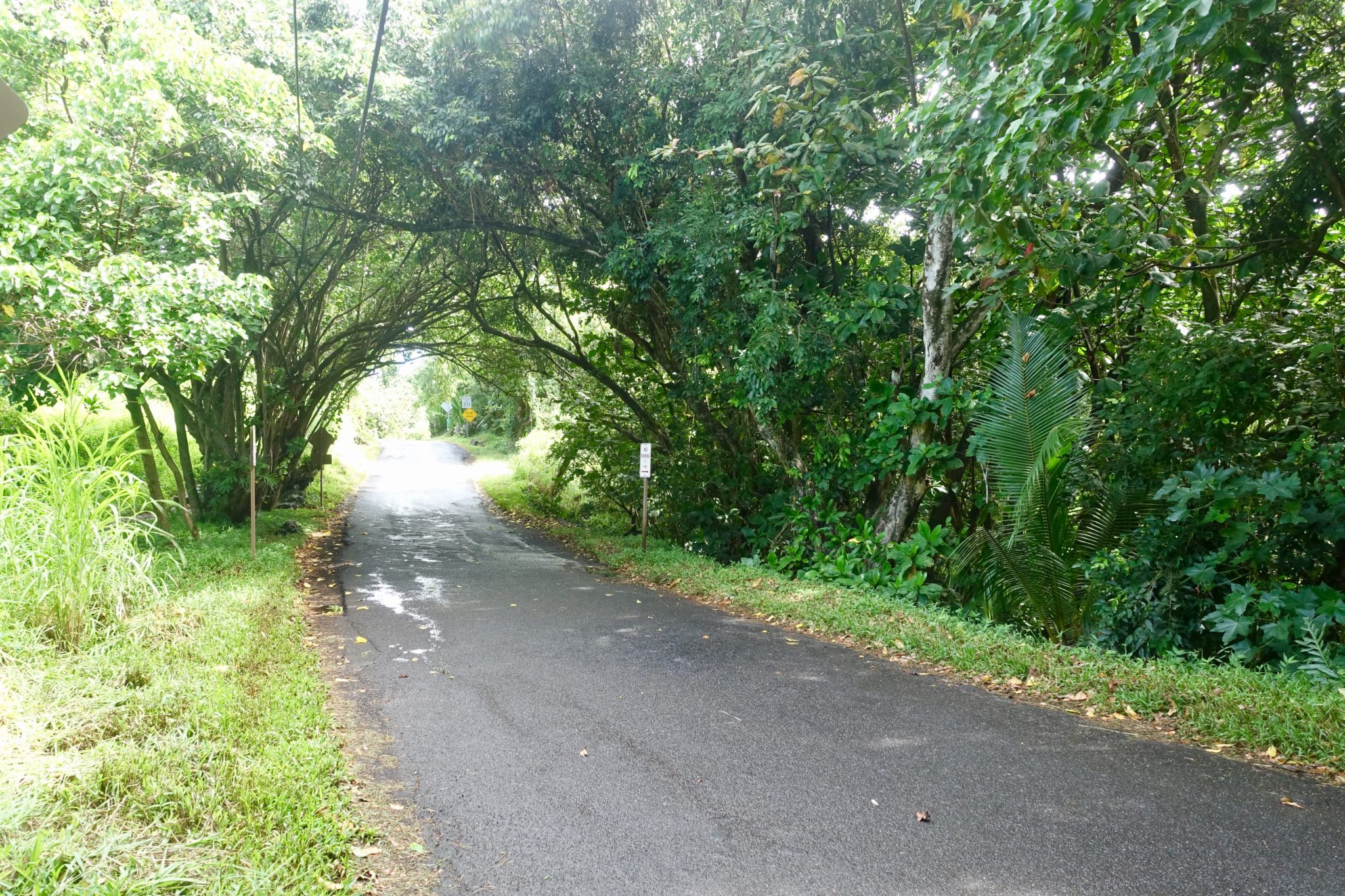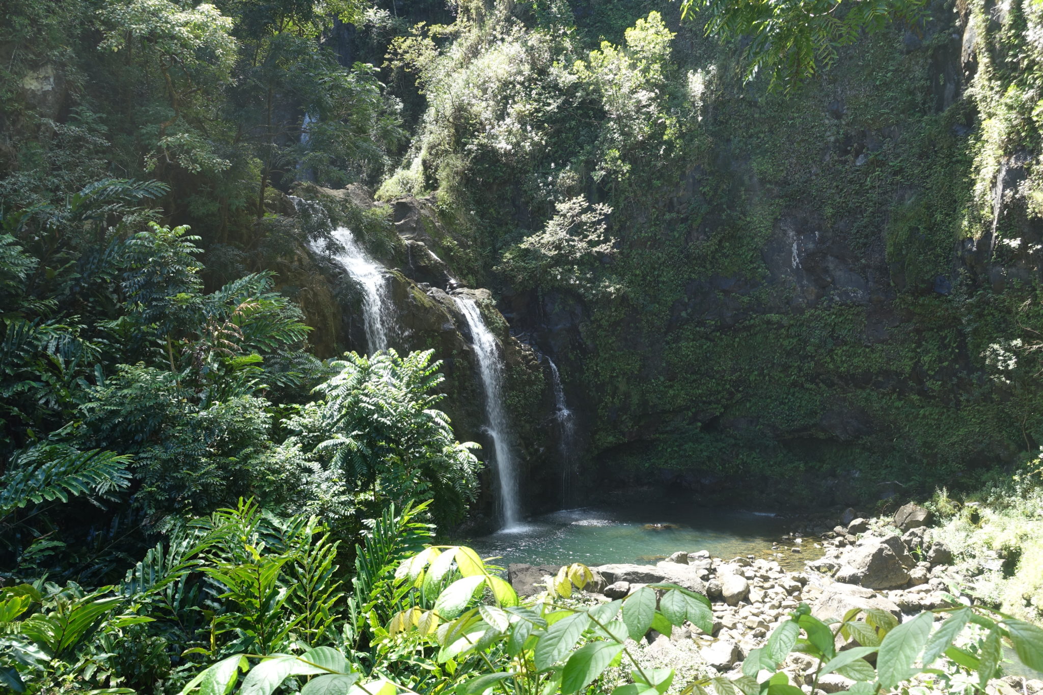 Über die Facebook Gruppe Backpacker Hawaii habe ich Kaisa gefunden, die mich auf die „Road to Hana“ begleitet. Wir fahren früh 6:30 Uhr von Lahaina los. Der erste Stopp ist in Paia, eigentlich wollten wir hier schön frühstücken und sind erstaunt, wie klein der Ort ist. Auf dem Rückweg habe ich diesen Ort für eine Nacht gebucht, das hätte vielleicht nicht sein müssen? Nun gut, das Frühstück ist mit 10 Dollar für ein Sandwich wiedermal super teuer! Man erklärt uns, wir sollen uns für den Trip stärken und am besten noch ein Lunchpaket kaufen. Die erste „Attraktion“ ist ein Früchtestand, die zweite mehrere Snackstände. Aber schliesslich sind wir in Amerika und wenn kein Fastfoodrestaurant mit drive in Option in der Nähe ist, laufen sie Gefahr zu verhungern! Schliesslich liegen 57 schmale Brücken und hunderte von Kurven vor uns. Nachmittags wollen wir in Hana ankommen, wo ich ein airbnb gebucht habe. Unser erster Stopp auf der Road to Hana ist ein kleiner Bamboo Wald. Es ist nicht immer leicht die Attraktionen auf dem Weg zu finden, aber eigentlich sieht man an den vielen parkenden Autos, wo es was zu sehen gibt. Wir kommen an vielen Wasserfällen vorbei, das Parken ist an der schmalen Strasse manchmal kaum möglich, vor allem wenn alle Parkplätze belegt sind. Hier ist bereits morgens 9 Uhr die Hölle los. Wir sind recht schnell beim Stopp „Halfway to Hana“, also auf halbem Weg und fragen uns, ob wir nicht viel verpasst haben. Wir halten vor Hana an einem Streetfood mit mehreren Ständen und essen recht günstig Burritos.