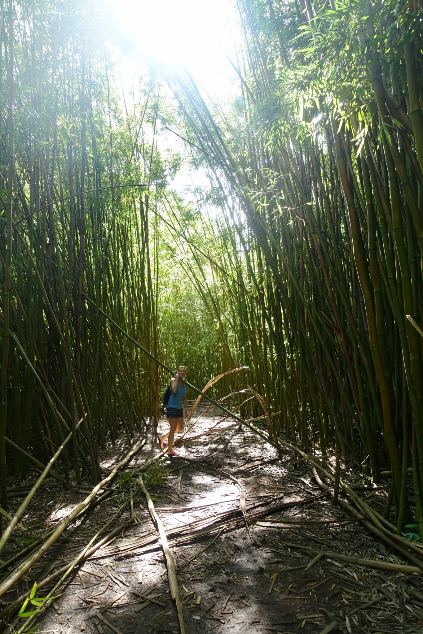Nach einer unbequemen lauten Nacht, setzen wir unsere Reise auf der Road to Hana fort und fahren gen Süden zum Pipiwai Trail, dort gibt es die seven sacred pools und einen riesigen Bambuswald. Wir laufen zuerst zum Meer, die Aussicht ist fantastisch, die Wanderung durch den Bambuswald zum letzten Wasserfall, wo der Weg endet, dauert über eine Stunde. Die Sonne brennt.