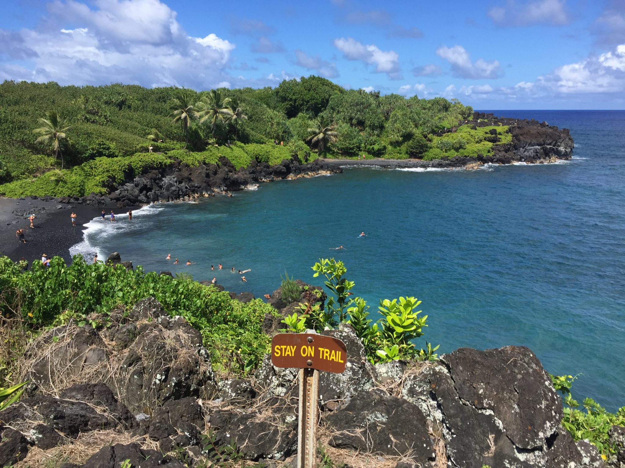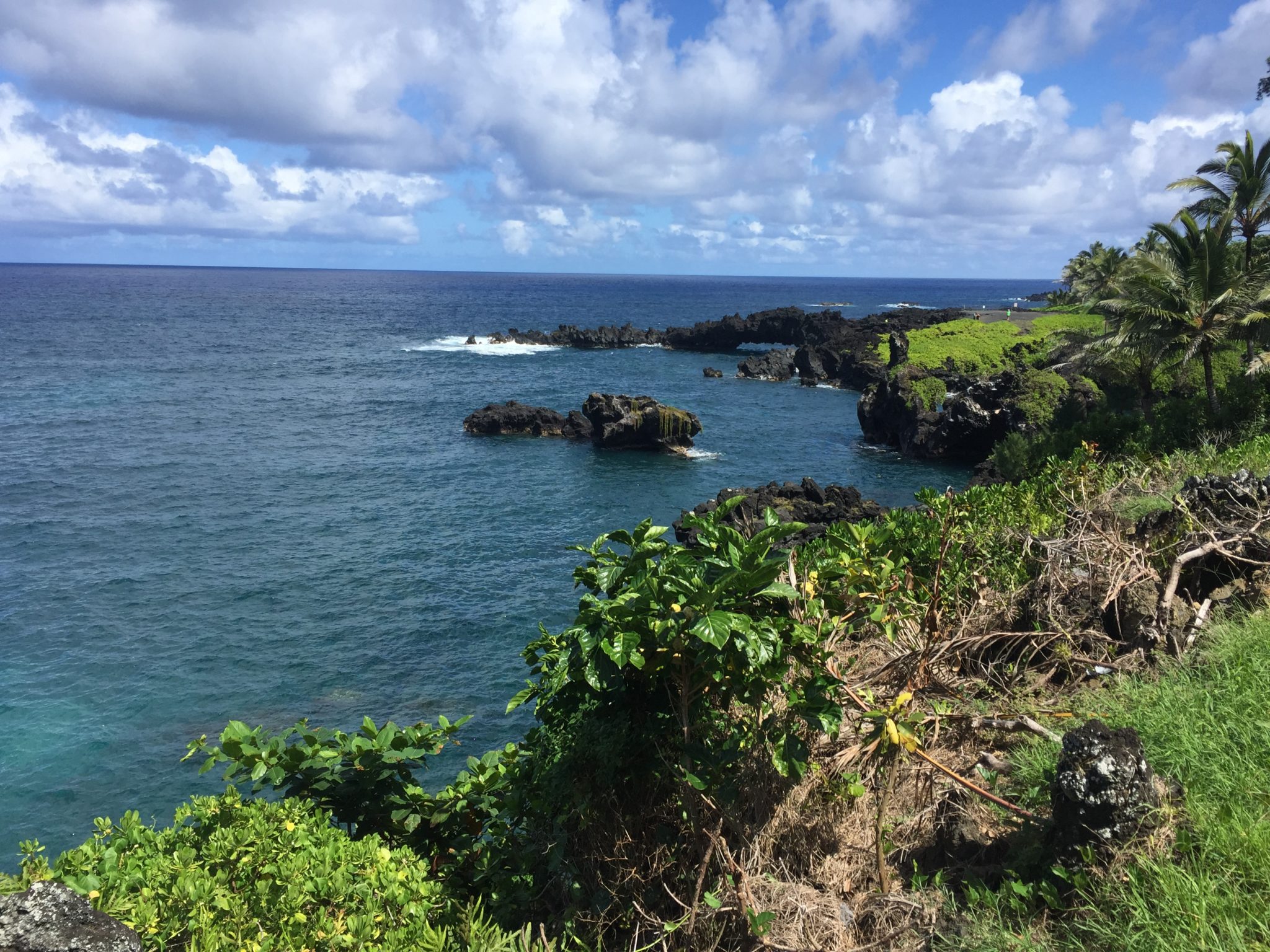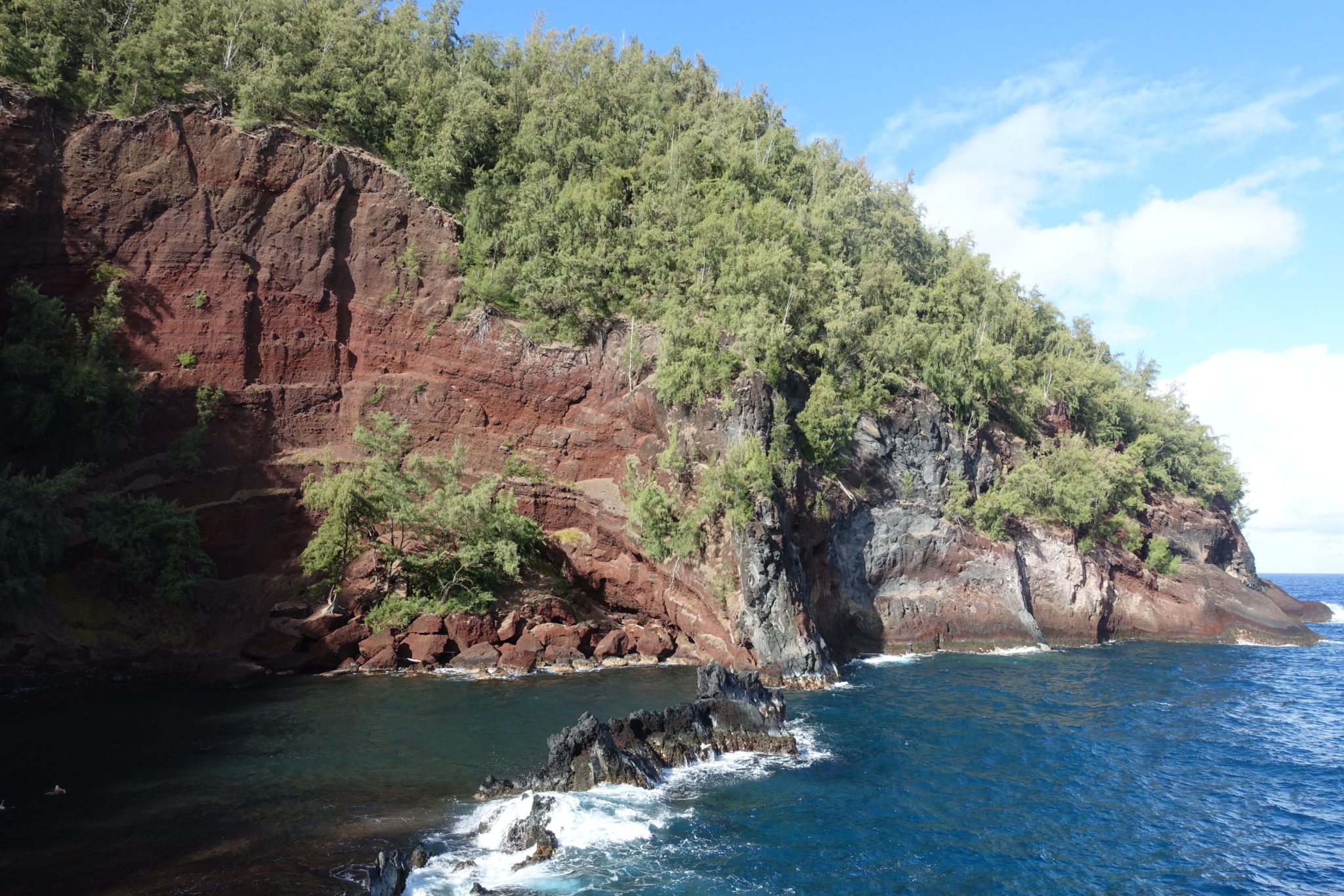 Den tropischen Garten besuchen wir aufgrund des horrenden Eintrittspreises von 25 Dollar pro Person nicht. Dafür halten wir ausführlich am „black sand beach“, springen in die hohen Wellen und wandern die Lavabucht entlang. Anschliessend erkunden wir noch den „red sand beach“, die kleine Wanderung zu diesem Strand ist etwas anspruchsvoller an der Steilküste entlang und nicht wirklich ausgeschildert. (Mit maps.me aber sehr gut zu finden.) Hier gehe ich schnorcheln, sehe viele recht grosse Fische und kämpfe gegen die starke Strömung in der Bucht.