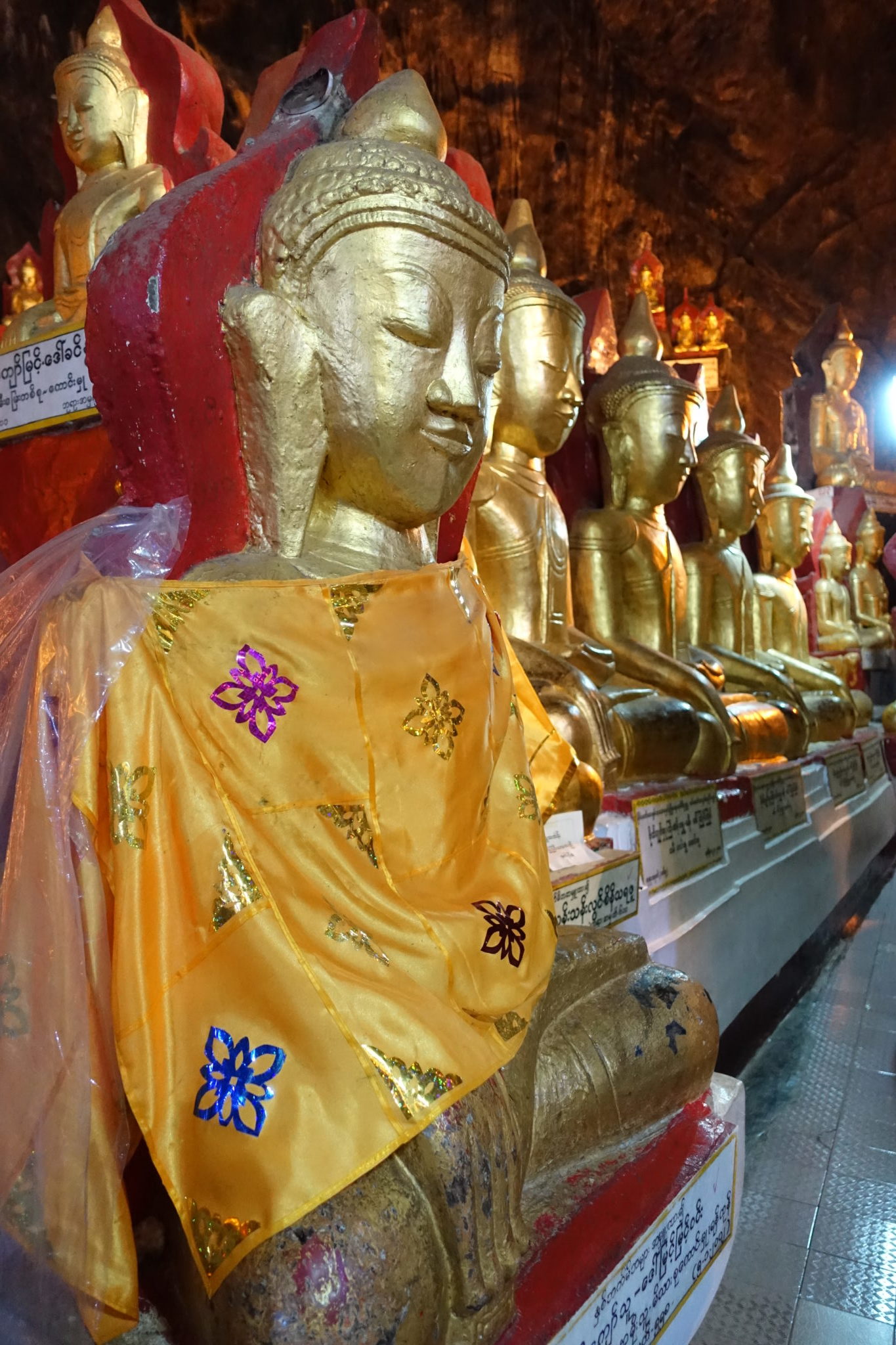 Ein weiteres highlight ist der Halbtagesausflug nach Pindaya, von Kalaw aus oder so wie wir es gemacht haben, vom Inlay Lake startend. Wir haben uns dazu einen eigenen Taxifahrer buchen müssen, da wir in Myanmar nicht Auto oder Moped fahren dürfen. Ausserdem sind ja die Regionen, in denen sich Touristen aufhalten dürfen immernoch begrenzt. Wir fahren also gen Norden, durch die traumhaftesten Landschaften, die ich seit langem gesehen habe. Rolling hills sagt man so schön im Englischen, hügelige Landschaften, mit goldenen Stuppas, rote Erde (wie in Australien) und Ochsenkarren auf den Feldern. Wenn es nach mir gegangen wäre, hätte der Fahrer an jeder Ecke halten müssen. Aber der konnte kaum Englisch und so fuhren wir direkt zu der grossen Höhle mit den goldenen Buddhas.