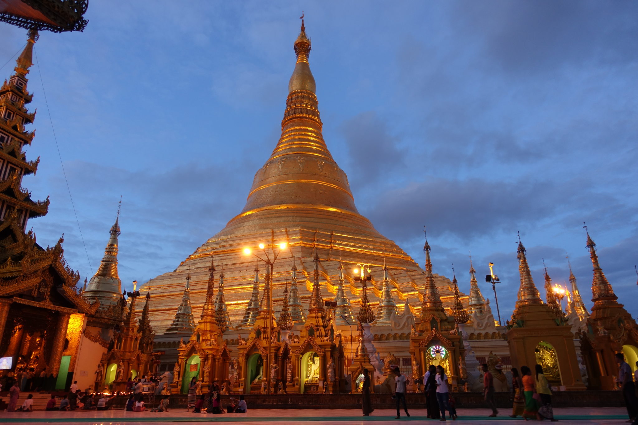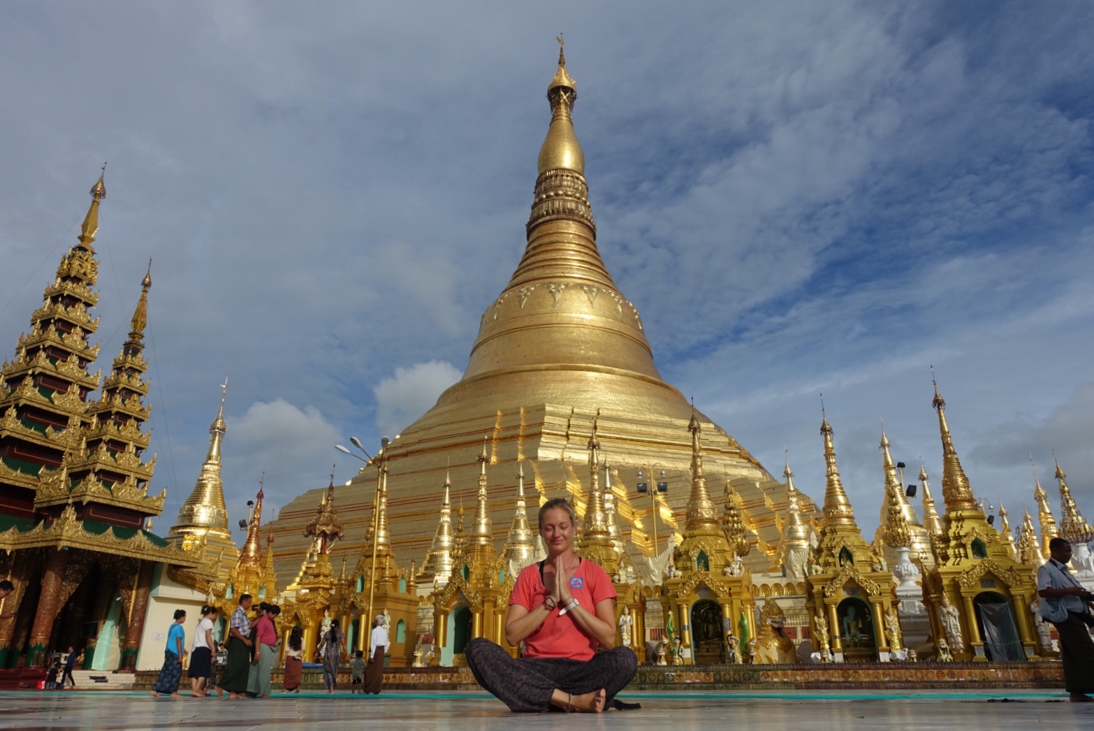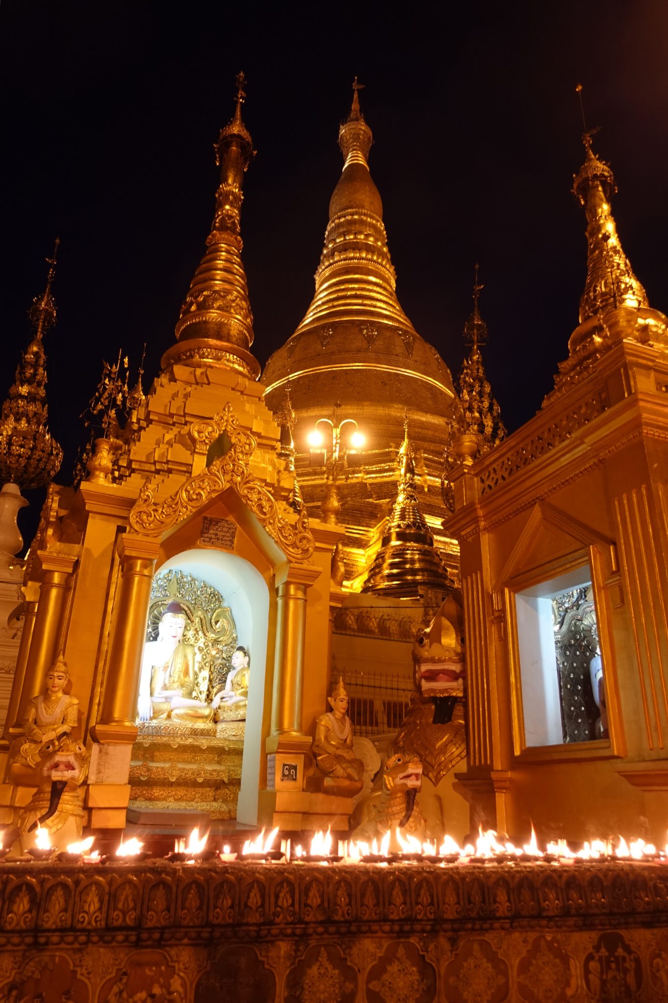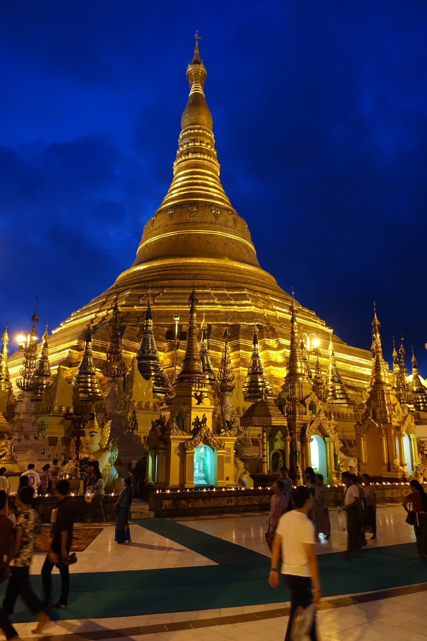 Die Pagode ist riesig, unvorstellbar, man sieht sie schon bei der Anfahrt mit dem Taxi von weitem. Ich zahle 10000 Kyat Eintritt, gebe meine Schuhe gegen eine Nummer am Eingang ab, erhalte eine gratis Flasche Wasser und laufe wiedermal barfuss los. Für Einheimische ist der Eintritt gratis, sie kommen zum beten, ich zum fotografieren. Es dauert nicht lange, bis mich ein Guide zutextet, er spricht gut deutsch und muss herhalten einige Fotos von mir zu machen. Dann wimmel ich ihn ab.