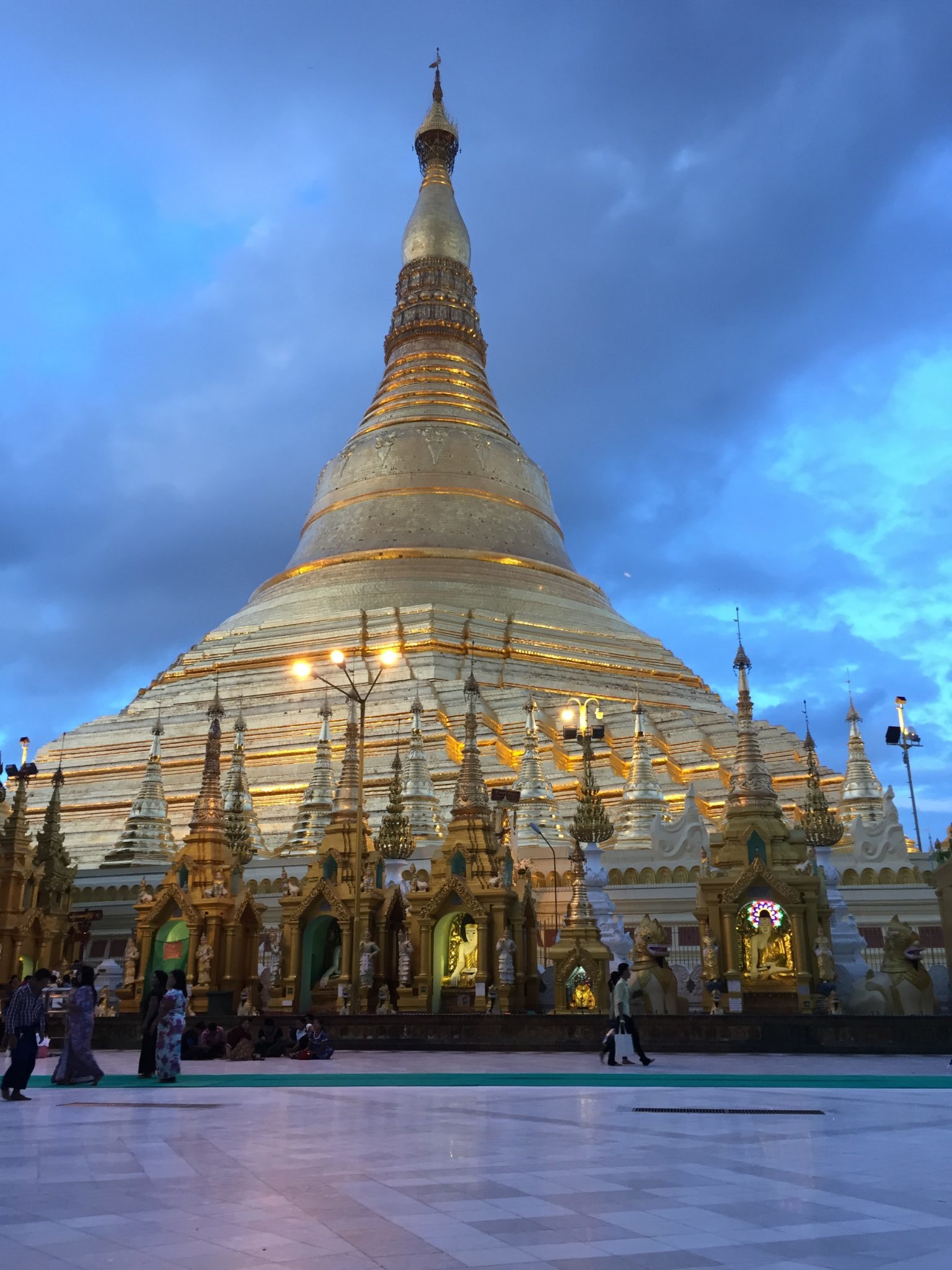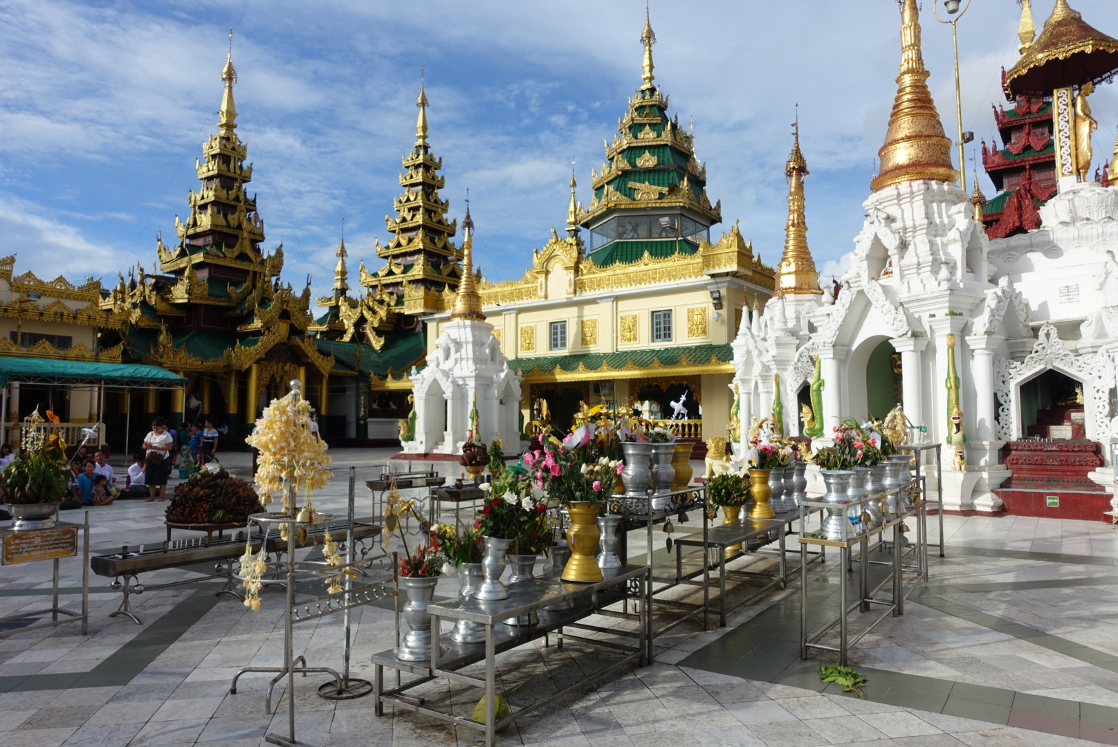 Anschliessend nehme ich das Taxi zur Shwedagon Pagoda, während sich Cristina für den Nachtbus parat macht. Die Shwedagon Pagoda schaut man sich am besten zum Sonnenuntergang an. Ich möchte sie also noch in der Sonne und später im Dunkeln schön angestrahlt sehen. Ich habe so ein wahnsinniges Glück, dass nach vielen trüben Regentagen die Sonne scheint!