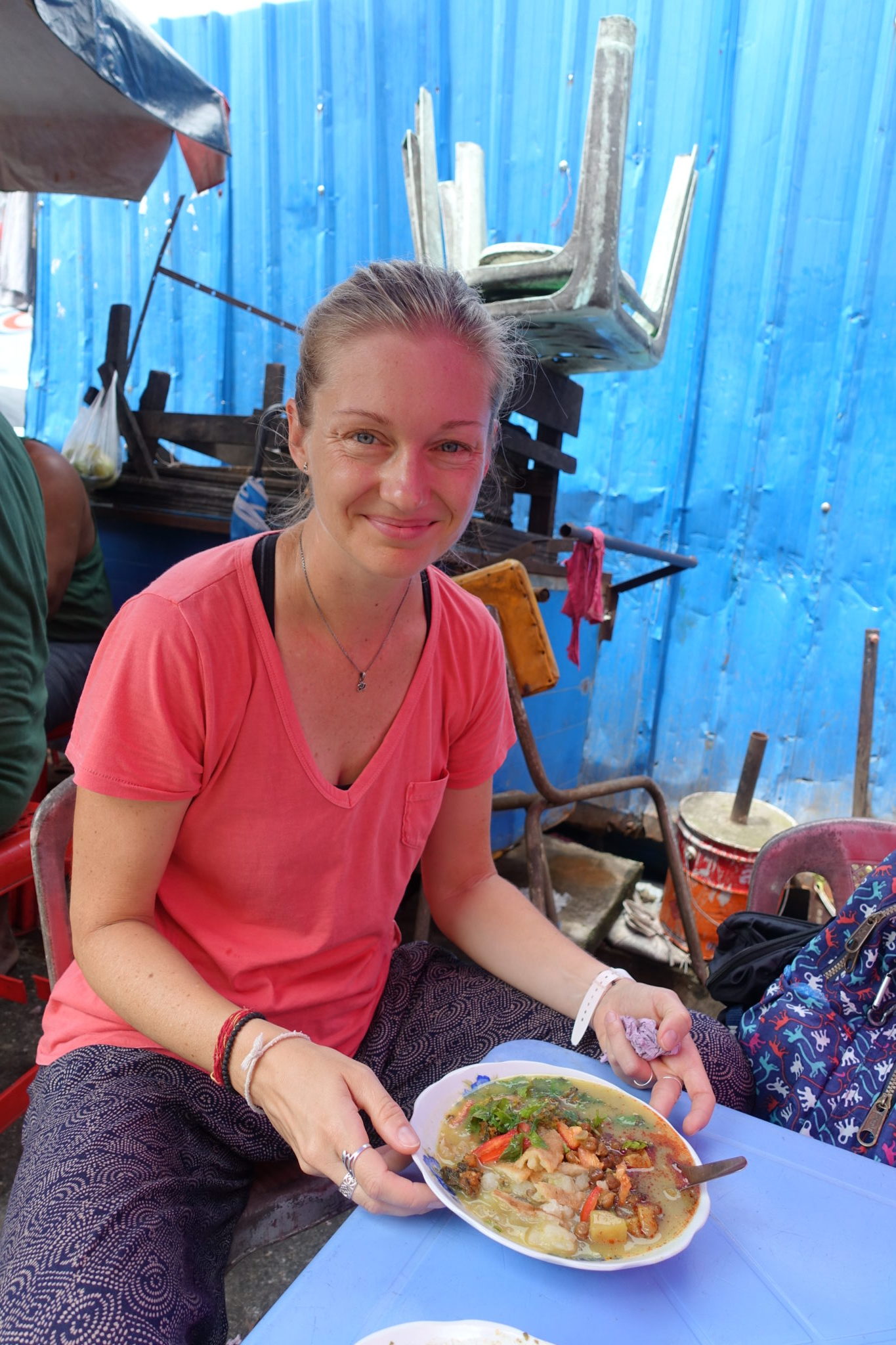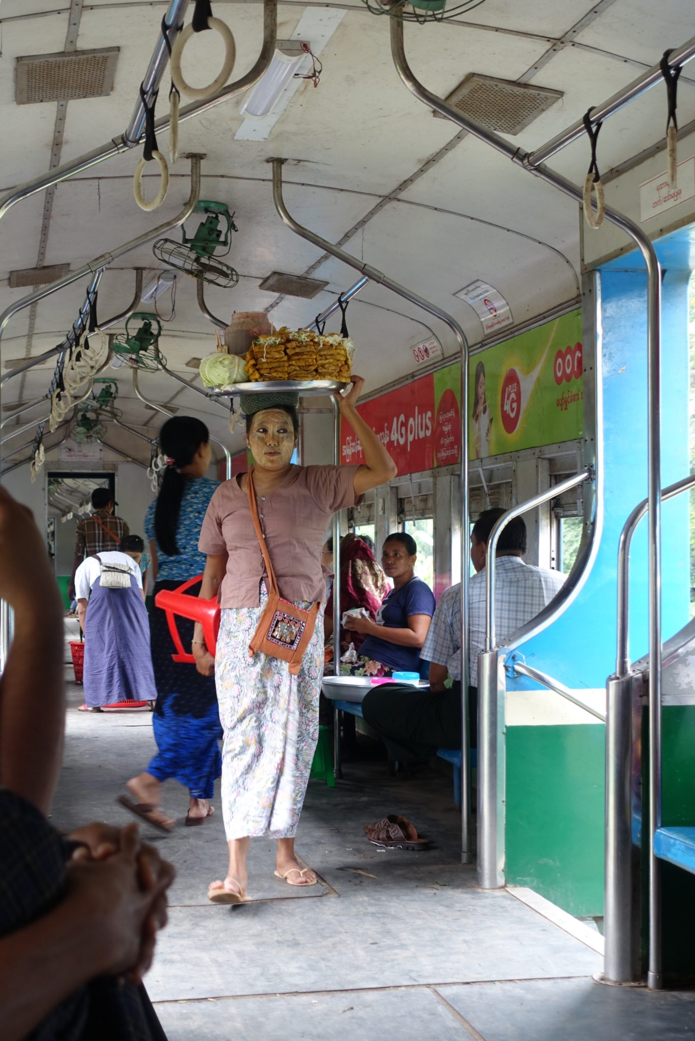 Wir fahren weiter im Kreis, bis wir eine Station früher für unser Mittag aussteigen und nochmal genüsslich über das Gleisbett laufen. Es war ein fantastisches Erlebnis, das Leben im Zug und die Zugfahrt entlang des Stadtrands von Yangon natürlich auch.