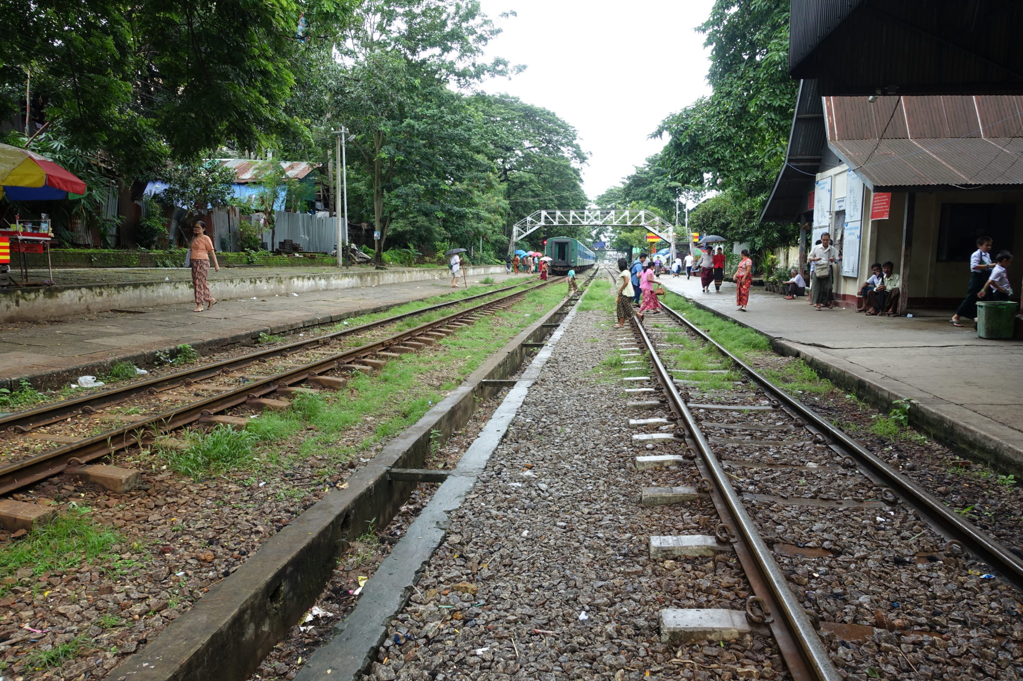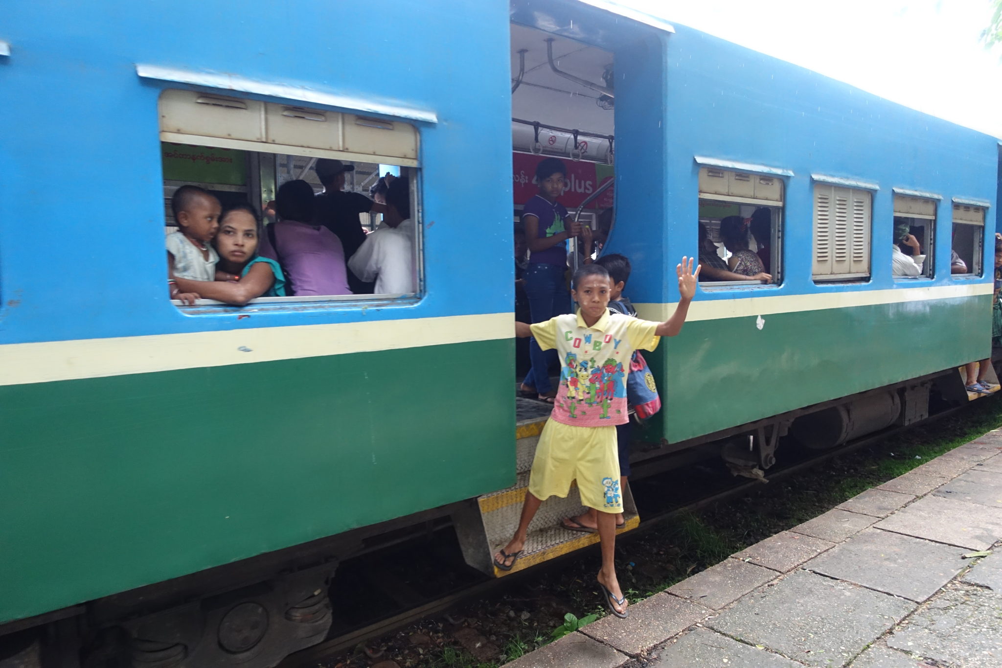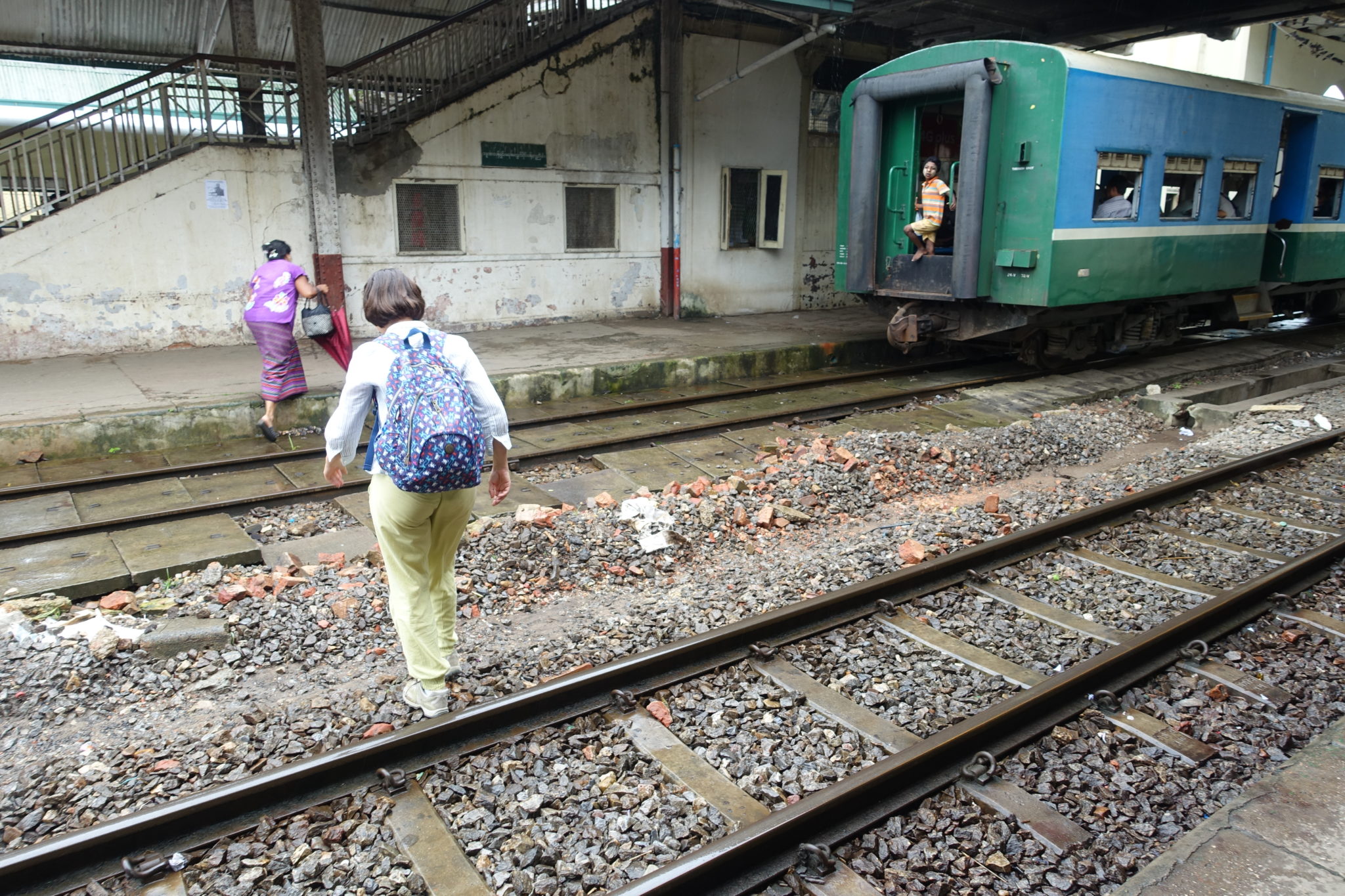 Ich will einen richtigen Kaffee und die Stadt erkunden, so machen wir uns auf den Weg. Cristina schlägt vor, mit dem Circle Train zu fahren. Das ist ein Zug, der Yangon quasi umrundet, einmal im Kreis um die Stadt, nach drei Stunden ist man wieder am Ausgangspunkt. Wir laufen zum Bahnhof. Am Bahnsteig gibt es einen Schalter für den Circle Train, wir zahlen umgerechnet 10 Cent und steigen kurz darauf mit sehr wenigen weiteren Touristen, nachdem wir einmal über das Gleisbett gelaufen sind in den alten Zug.