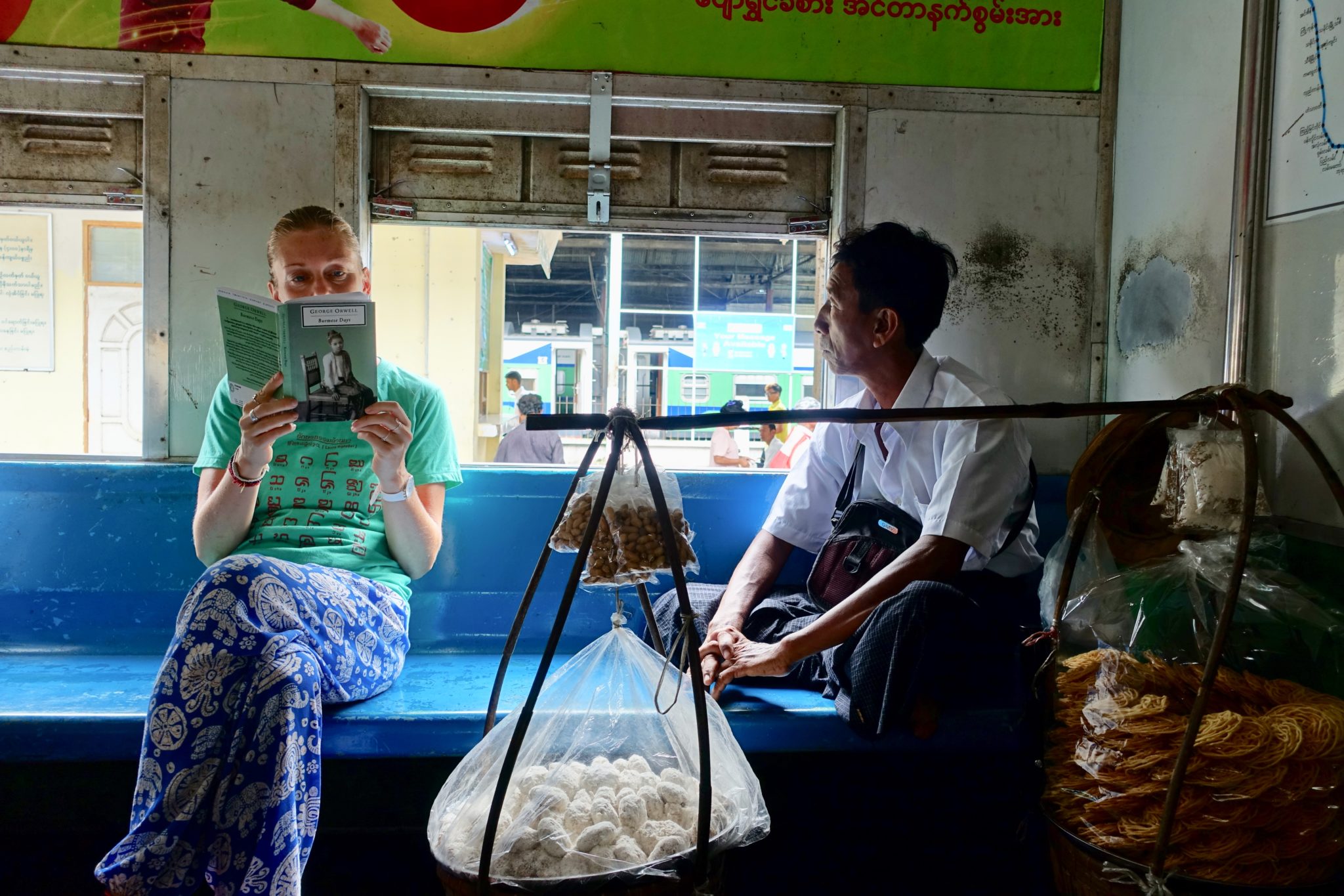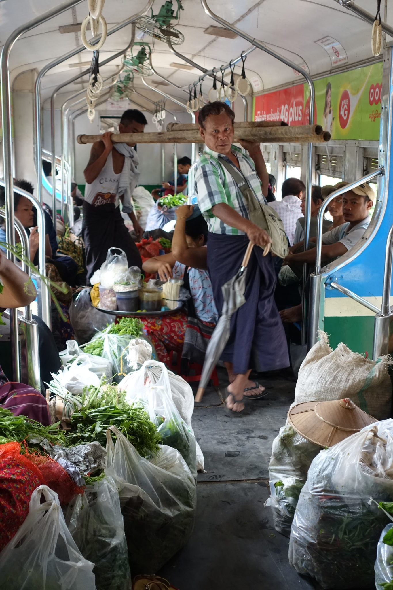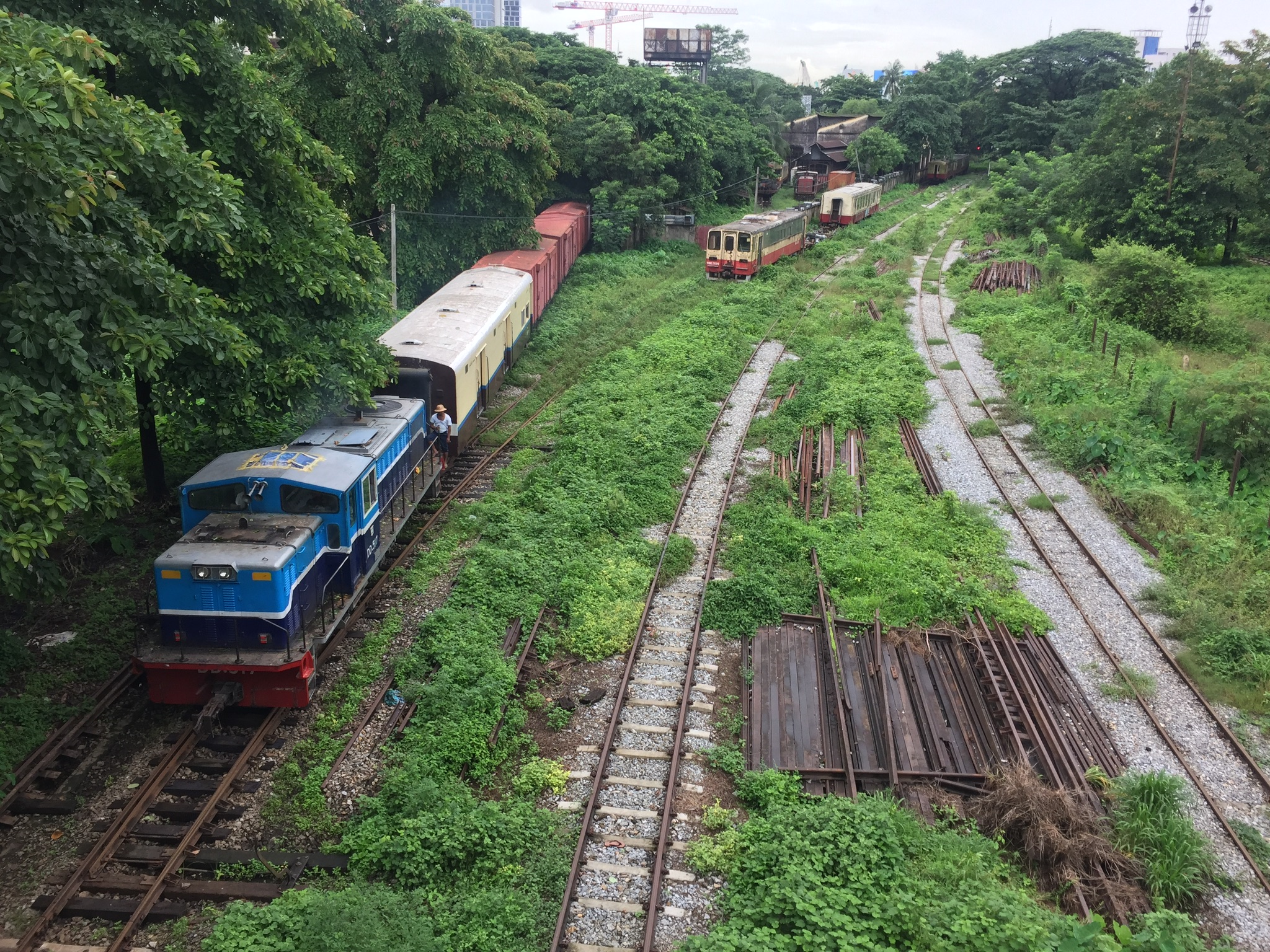 Ich will einen richtigen Kaffee und die Stadt erkunden, so machen wir uns auf den Weg. Cristina schlägt vor, mit dem Circle Train zu fahren. Das ist ein Zug, der Yangon quasi umrundet, einmal im Kreis um die Stadt, nach drei Stunden ist man wieder am Ausgangspunkt. Wir laufen zum Bahnhof. Am Bahnsteig gibt es einen Schalter für den Circle Train, wir zahlen umgerechnet 10 Cent und steigen kurz darauf mit sehr wenigen weiteren Touristen, nachdem wir einmal über das Gleisbett gelaufen sind in den alten Zug.