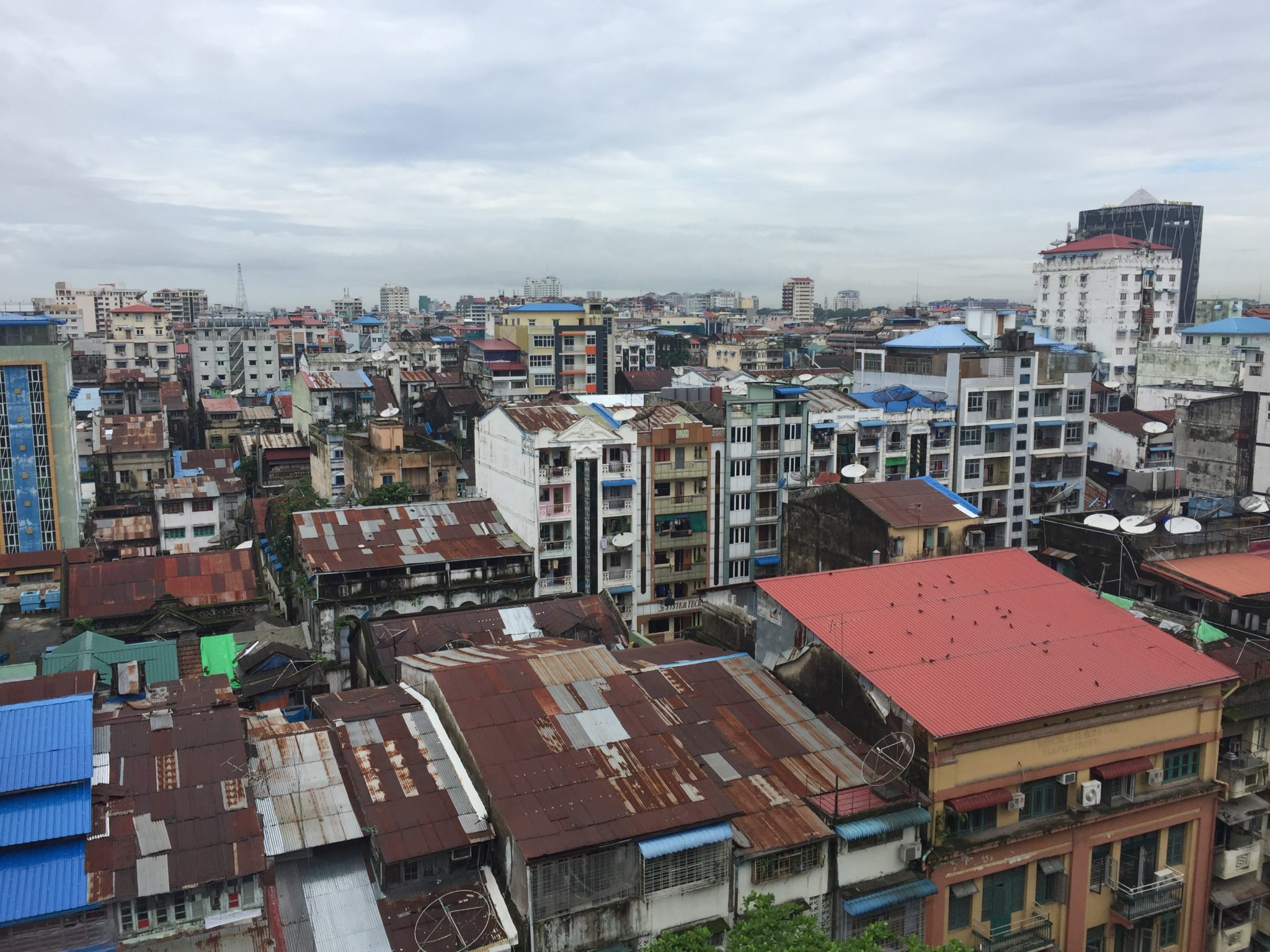 Also ging es doch mit dem Nachtbus nach Yangon, meine vorerst letzte Nachtbusfahrt, sicher die kurvenreichste. Aber dennoch habe ich wieder erstaunlich gut geschlafen, bis uns der Bus plötzlich weit vor dem Zentrum von Yangon einfach aussetzt. Wir müssen in einen klapperigen Bus umsteigen, es wurde gerade hell. Dieser fährt uns bis zu einer weiteren Kreuzung und so standen wir am frühen Morgen im nirgendwo in Yangon, umringt von Taxifahrern, die nur darauf warteten, uns ins Hostel zu fahren. Zum Glück können wir im Grab App nach dem Preis für ein Taxi zum Backpacker Bed & Breakfast Hostel recherchieren. Wir steigen ein und sind kurz darauf im Hostel, wo wir sogar noch Frühstück erhalten. Der Frühstücksraum, ist so wie unser Doppelzimmer in der obersten Etage. Wir haben einen tollen Blick über die Stadt, die nicht gerade einladend aussieht.
