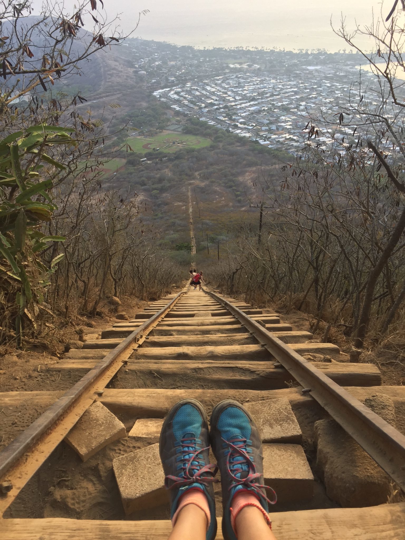Ich fahre zum Kokohead Trail, von dem ich den Sonnenuntergang ansehen will, Bus 22. Allerdings fährt der letzte Bus dieser Nummer bereits 18 Uhr. Sunset ist erst 18:30 Uhr. Die Wanderung ist extrem anstrengend, es geht eine knappe Stunde steil den Berg hinauf. Als Belohnung gibt es eine klasse Aussicht vom Vulkankrater. Ich laufe den schmalen Weg rechts neben den tausend Stufen hoch. Erst auf dem Rückweg sehe ich, dass es sich hierbei um ein ausgedientes Gleis handelt und man von einem Holzbalken auf den nächsten springen muss. Nicht ganz einfach und sehr stauchend für die Knie!