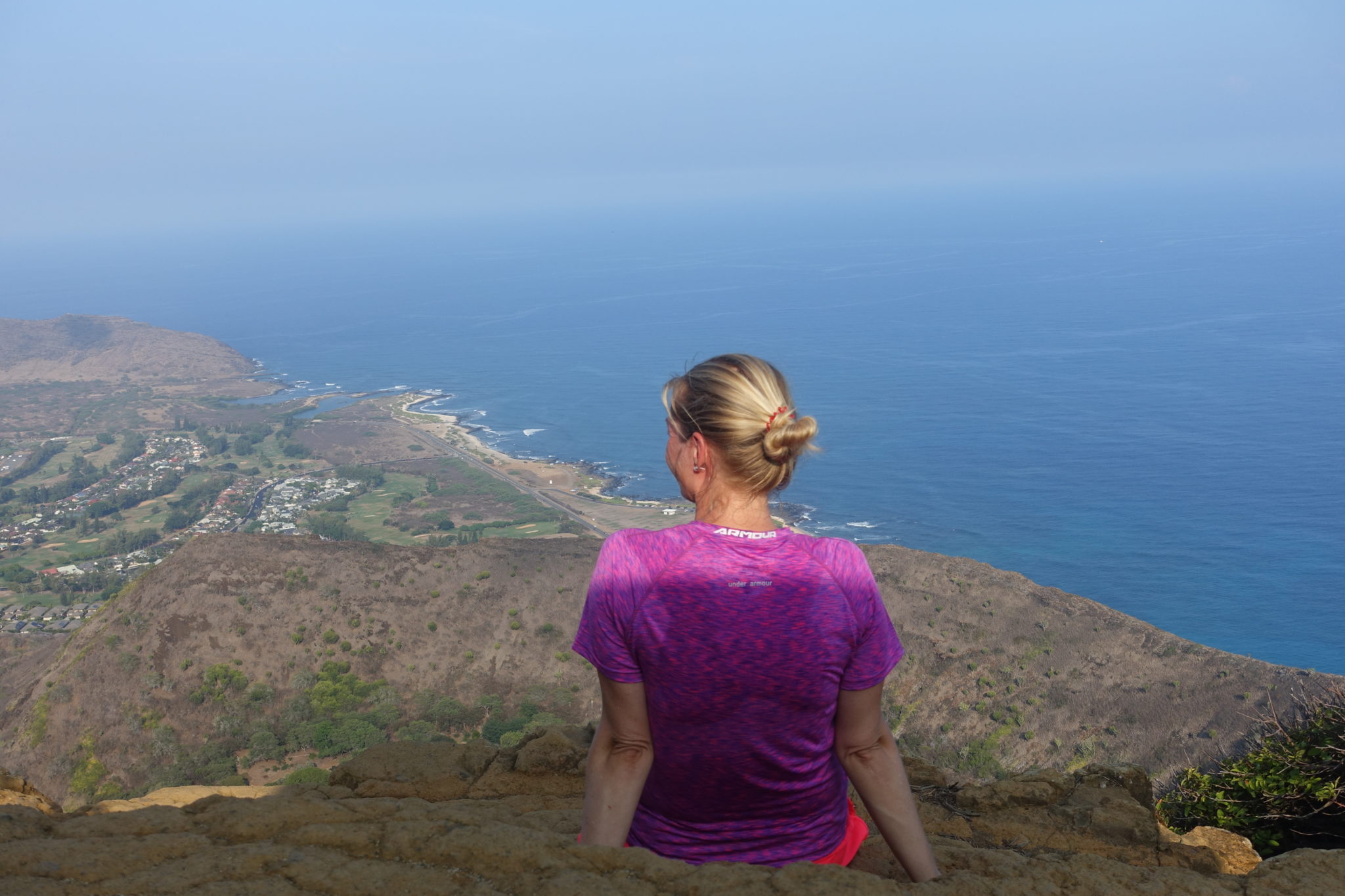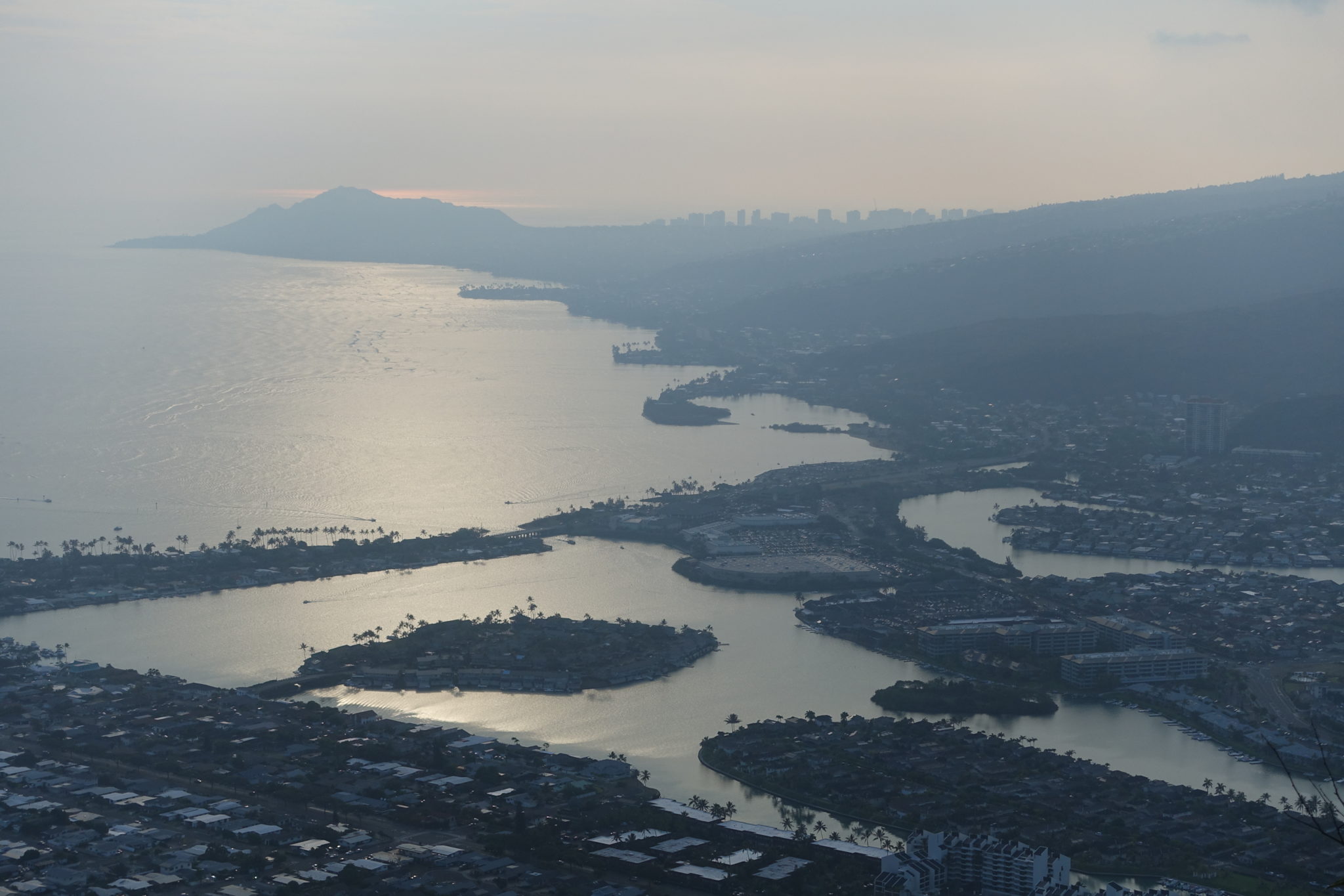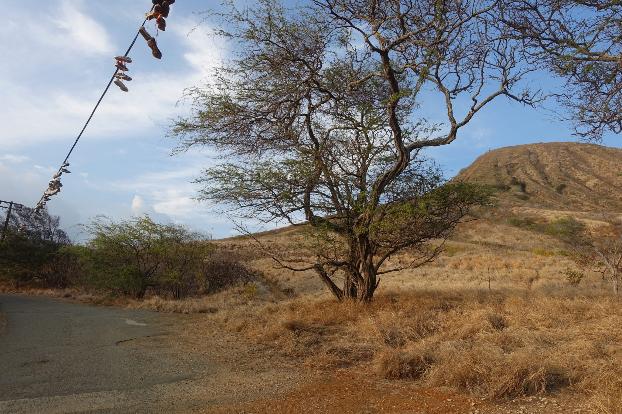 Ich fahre zum Kokohead Trail, von dem ich den Sonnenuntergang ansehen will, Bus 22. Allerdings fährt der letzte Bus dieser Nummer bereits 18 Uhr. Sunset ist erst 18:30 Uhr. Die Wanderung ist extrem anstrengend, es geht eine knappe Stunde steil den Berg hinauf. Als Belohnung gibt es eine klasse Aussicht vom Vulkankrater. Ich laufe den schmalen Weg rechts neben den tausend Stufen hoch. Erst auf dem Rückweg sehe ich, dass es sich hierbei um ein ausgedientes Gleis handelt und man von einem Holzbalken auf den nächsten springen muss. Nicht ganz einfach und sehr stauchend für die Knie!
