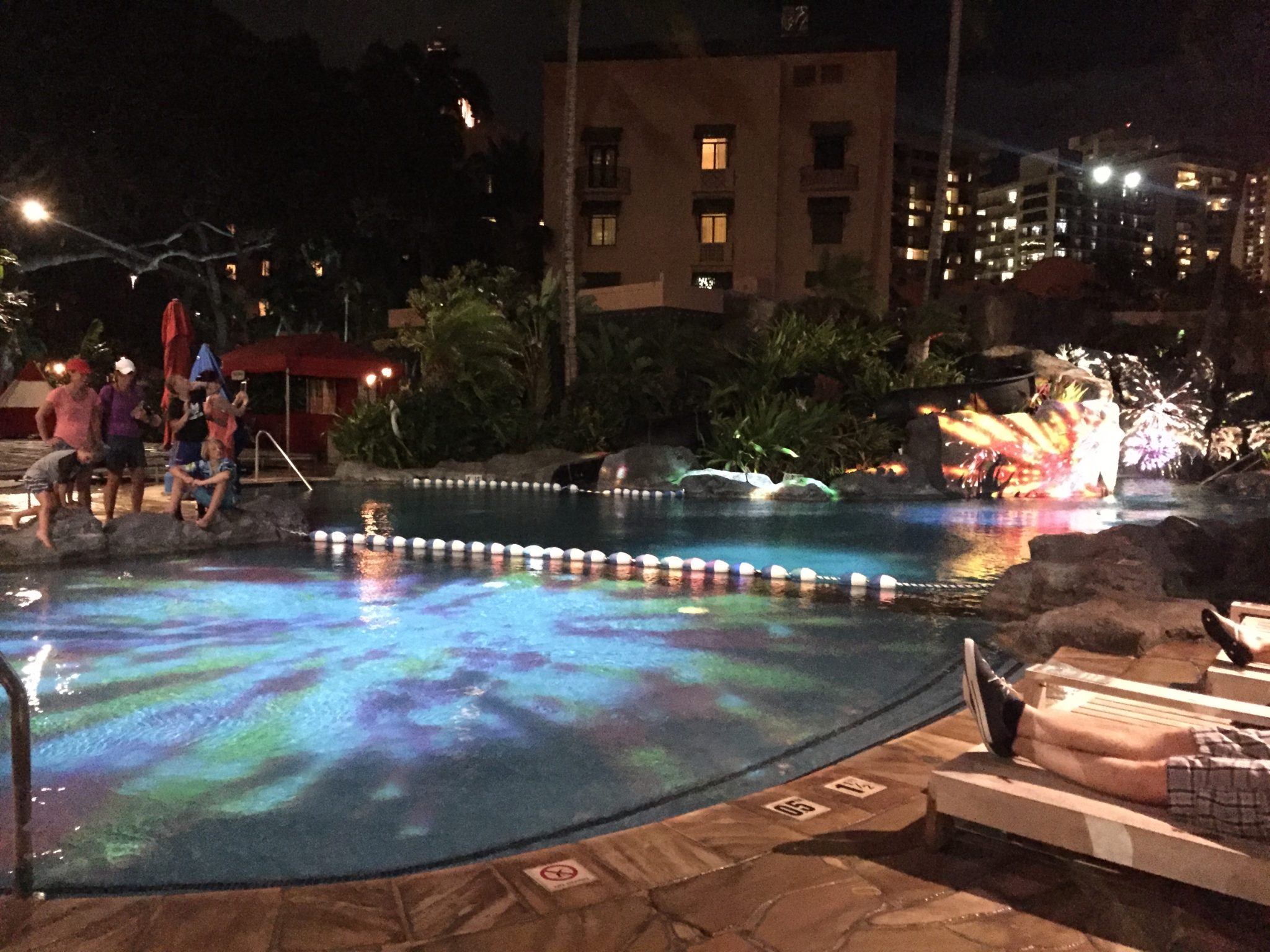 Im Sheraton Waikiki entfliehe ich Abends dem Backpacker Vibe, der in Honolulu quasi kaum existiert. Dort werden jeden Abend Laser Shows am Pool gezeigt, man kann sich einfach dazu stellen. Niemand kontrolliert den grossen Eingangsbereich mit den vielen Geschäften. Ich mache es mir auf einem Schaukelstuhl am Karpfenteich gemütlich und stelle mir einfach vor, ich wäre Hotelgast. Manchmal nervt das Backpackerleben schon ein bisschen, obwohl das Waikiki Beach Boutique Hostel sicher noch eines der besseren Hostels ist.