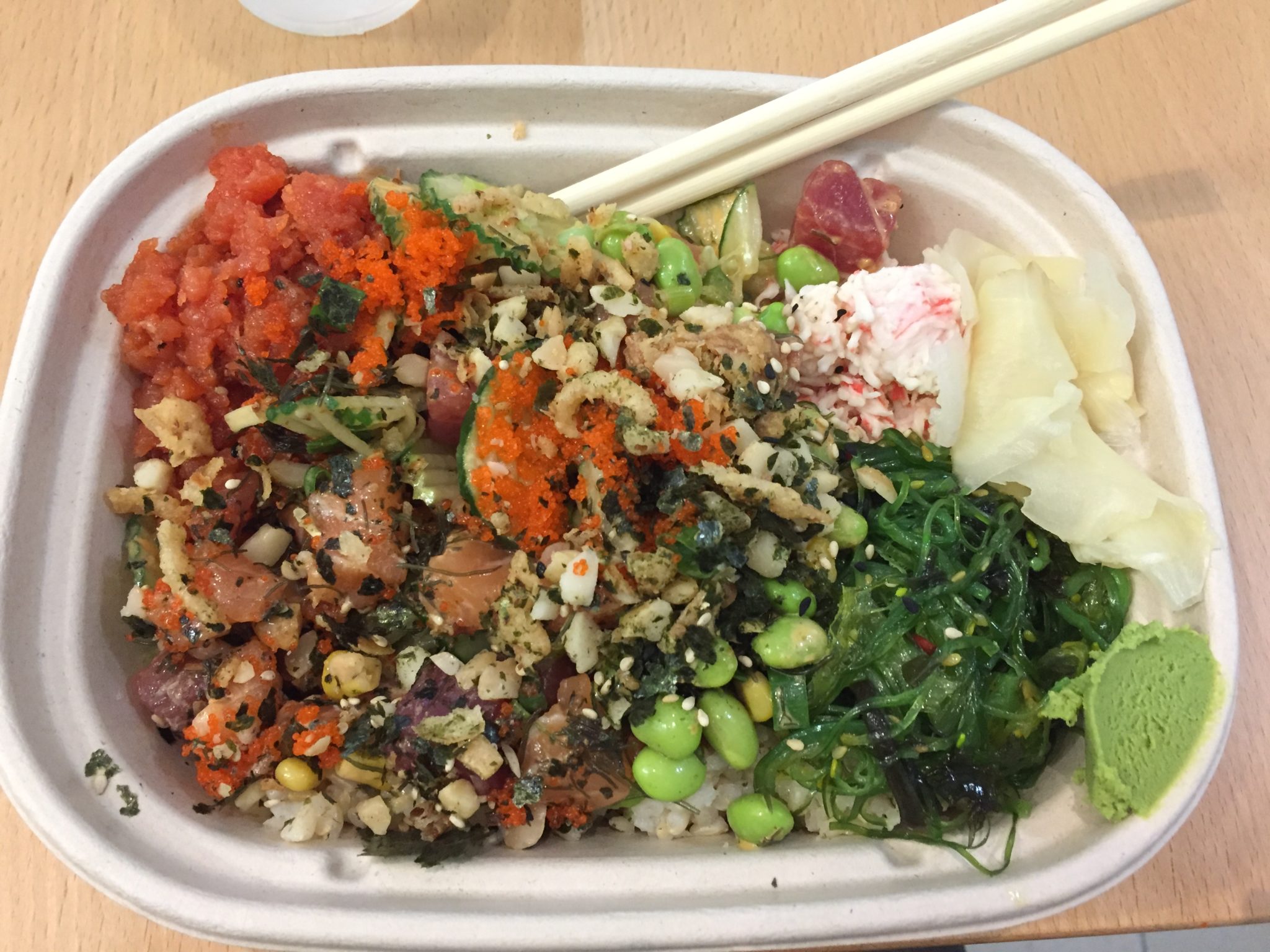 Günstiges Abendessen Fehlanzeige. Ich esse im japanischen Foodcourt in einer teuren Mall eine kleine Ecke Reis für 2.50 Dollar und geniesse gratis Livemusik zum Freitagabend.