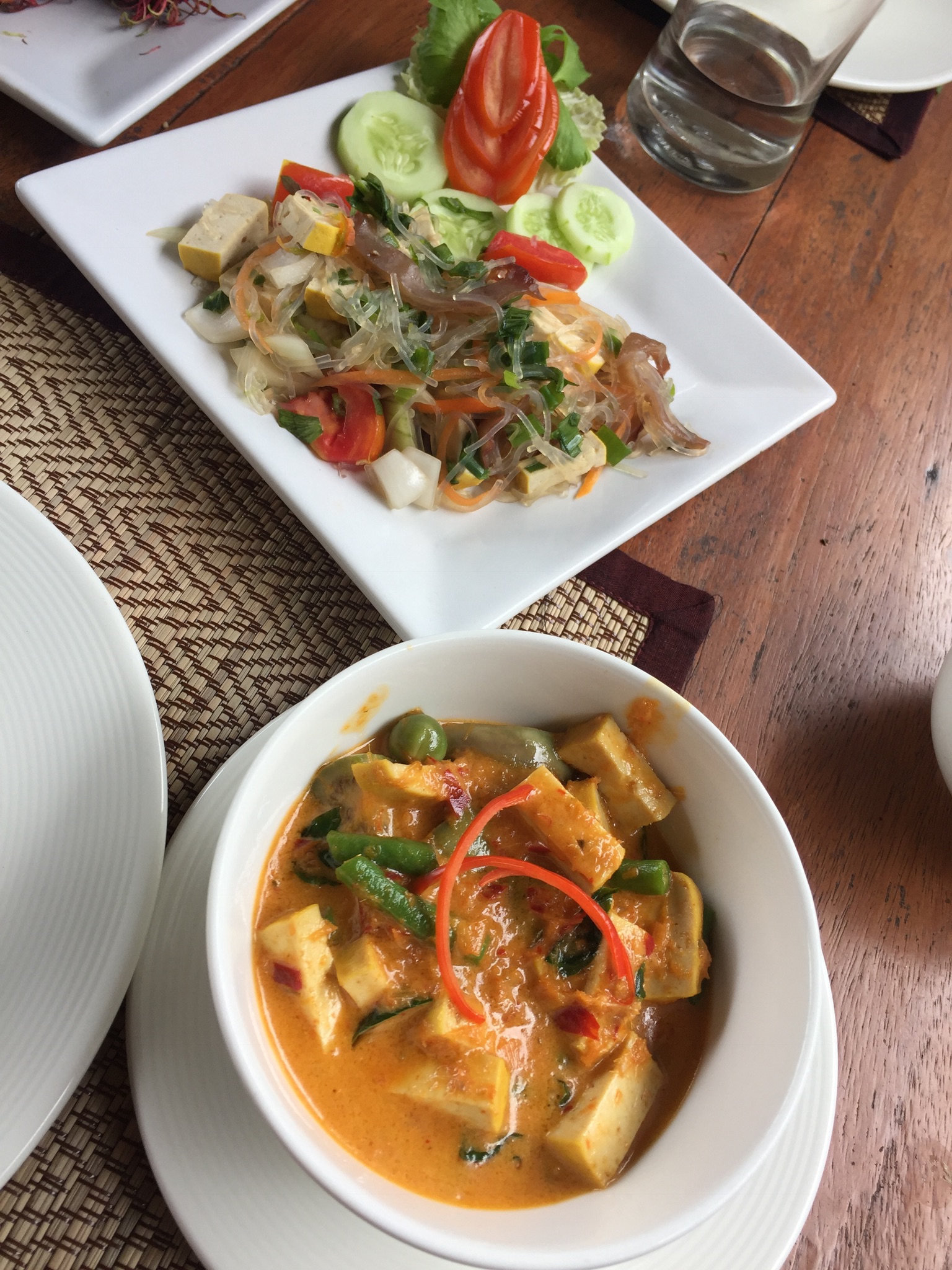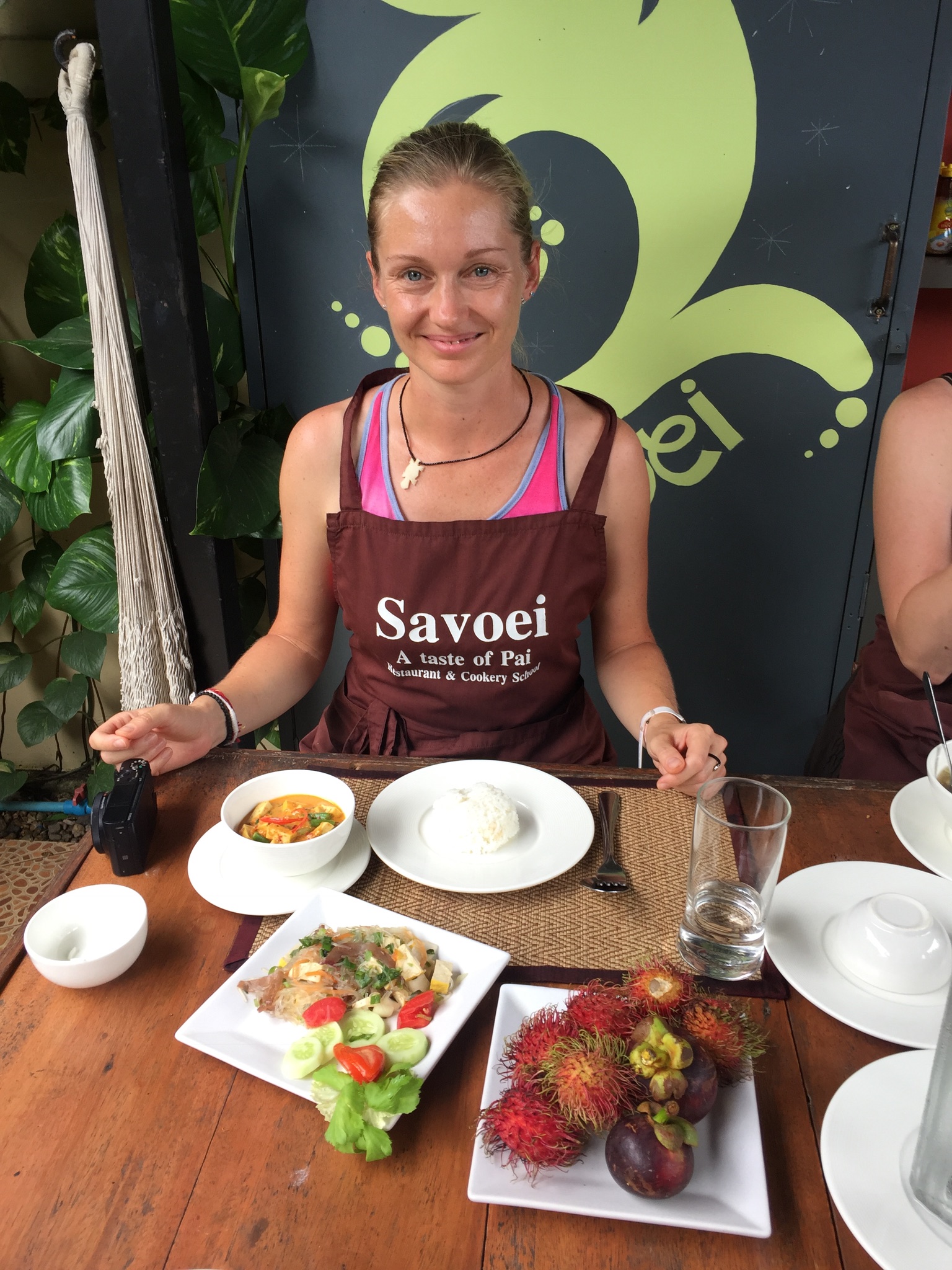 Bei Savoei Cooking School mache ich einen thailändischen Kochkurs mit, 700 Baht, 9:30 Uhr bis 13:30 Uhr. Wir (sechs Teilnehmer aus der ganzen Welt) fahren zuerst auf einen lokalen Markt, wo uns die Zutaten gezeigt werden. Gekauft haben wir dort nichts, da in der Kochschule bereits alles bereit steht. Anders würde das in der kurzen Zeit mit vier Gängen auch gar nicht funktionieren. Ich bin die einzige Vegetarierin, das Fleisch steht bei den anderen fertig geschnitten und portioniert bereit. Bei mir ist quasi in jedem Gang Tofu drin. Ich koche Pad Thai – Thai fried noodles im Wok, das ist super und wird zu Hause auf jeden Fall nachgekocht! Danach beginne ich die Zubereitung vom red curry, dann Papaya Salat und anschliessend gibts noch einen kalten, spicy noodle Salat.