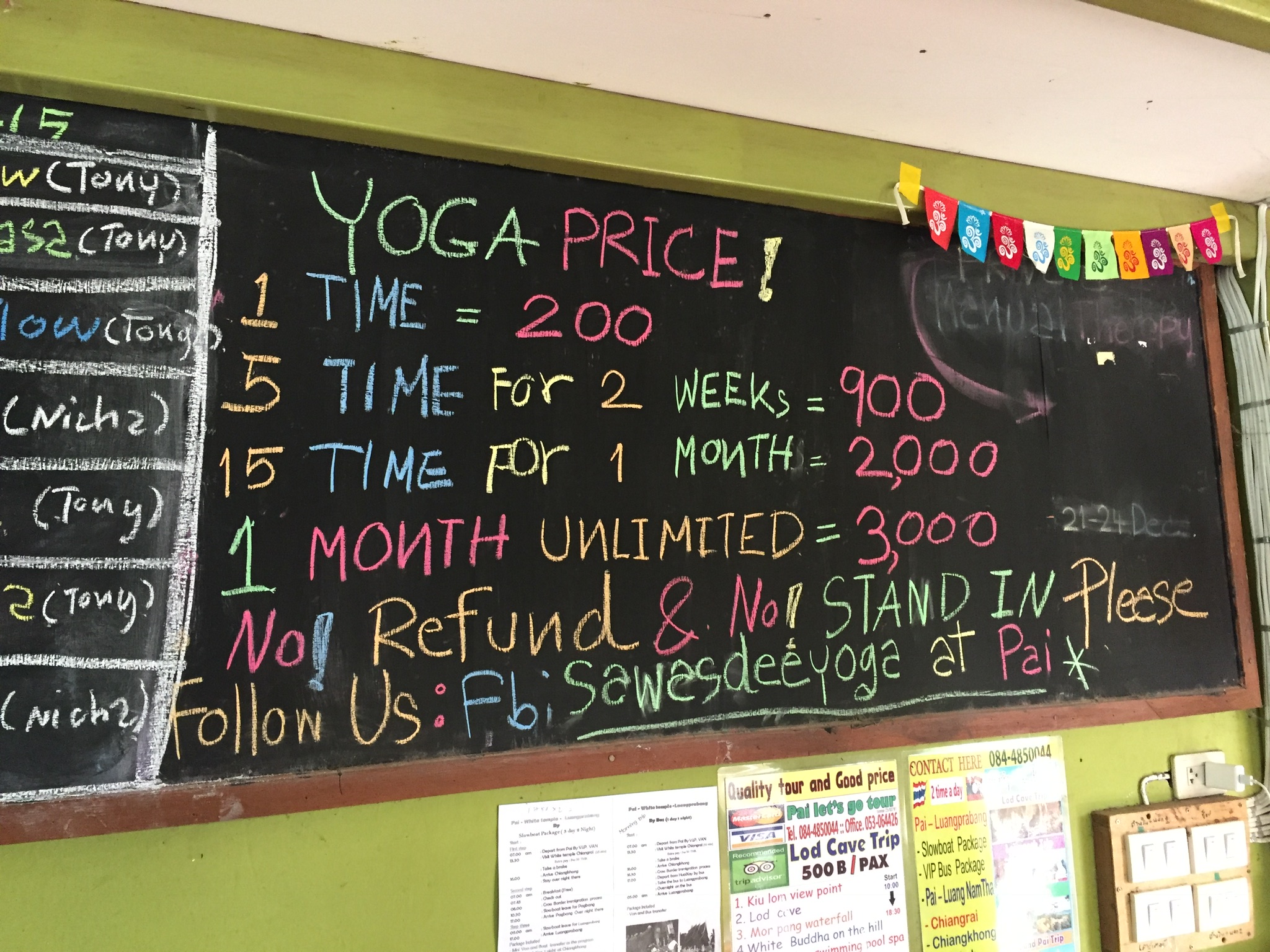 Von Chiang Mai gelange ich mit einem Minibus in drei Stunden nach Pai, nach gefühlten 500 Serpentinen sind wir da. Offenbar haben alle etwas gegen Reisekrankheit genommen, sonst ist die Fahrt wirklich kaum auszuhalten! Vom Busbahnhof laufe ich zu meiner Unterkunft Sawasdee Pai River Resort, wo auch Yoga angeboten wird. Sie liegt direkt am Fluss und ich erhalte ein gratis Upgrade auf ein Zimmer mit Klimaanlage! So toll, denn es sind über 40 Grad, die Sonne brennt. Von Regenzeit nichts zu spüren.