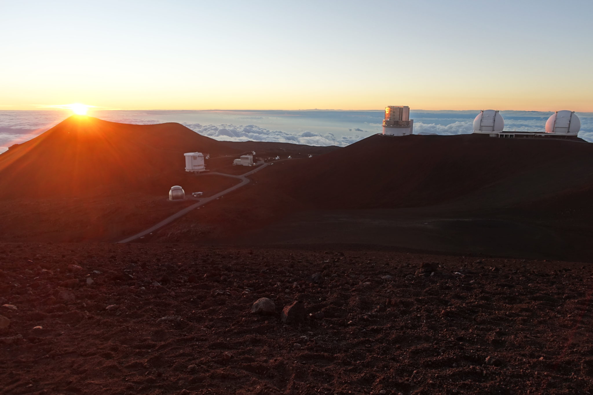 Oben angekommen haben wir tatsächlich unsere Daunenjacken ausgepackt. 11 Grad auf 4200 Meter, am Vormittag hatten wir noch über 40 Grad in der Sonne auf Meereshöhe. Den Sonnenuntergang über den Wolken bestaunen wir zusammen mit japanischen Reisegruppen vom Maunakea Summit. Unser Portlander Pärchen nimmt uns wieder mit hinunter zum Visitorcenter, wo das Stargazing bereits in vollem Gange war. 4 Teleskope zielen auf unterschiedliche Planeten und Galaxien. Wir stellen uns geduldig in die lange Schlange, es ist stockdunkel. Taschenlampen strengstens verboten. Kurz bevor wir Jupiter mit dem Teleskop bestaunen können, fällt zum ersten mal auf dem Maunakea der Strom aus. Unglaublich. Das gab es hier noch nie erklärt man uns nervös und vertröstet uns auf das Sternbilder erklären mit Laserpointer. Recht schnell muss jedoch auch das abgebrochen werden und der Berg wird aus Sicherheitsgründen evakuiert. Pech gehabt. Müssen wir wohl wieder kommen 🙂