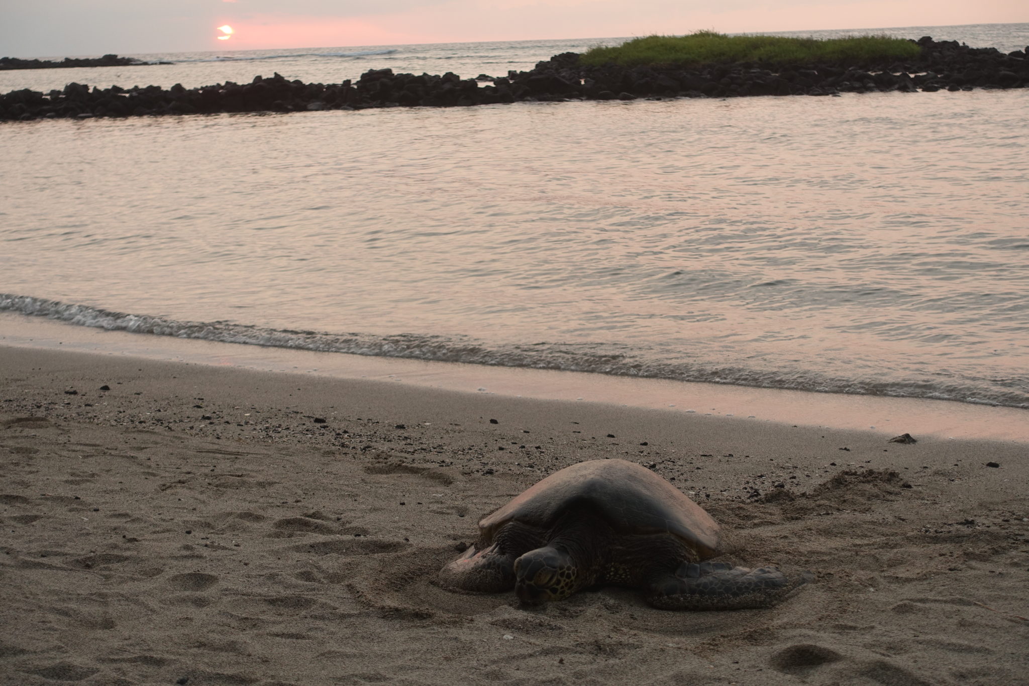Den Sonnenuntergang haben wir von einem kleinen ruhigen Strand ganz in der Nähe von Kona beobachtet, wo zu unserem Erstaunen noch weitere Schildkröten an Land kamen, um sich auszuruhen.